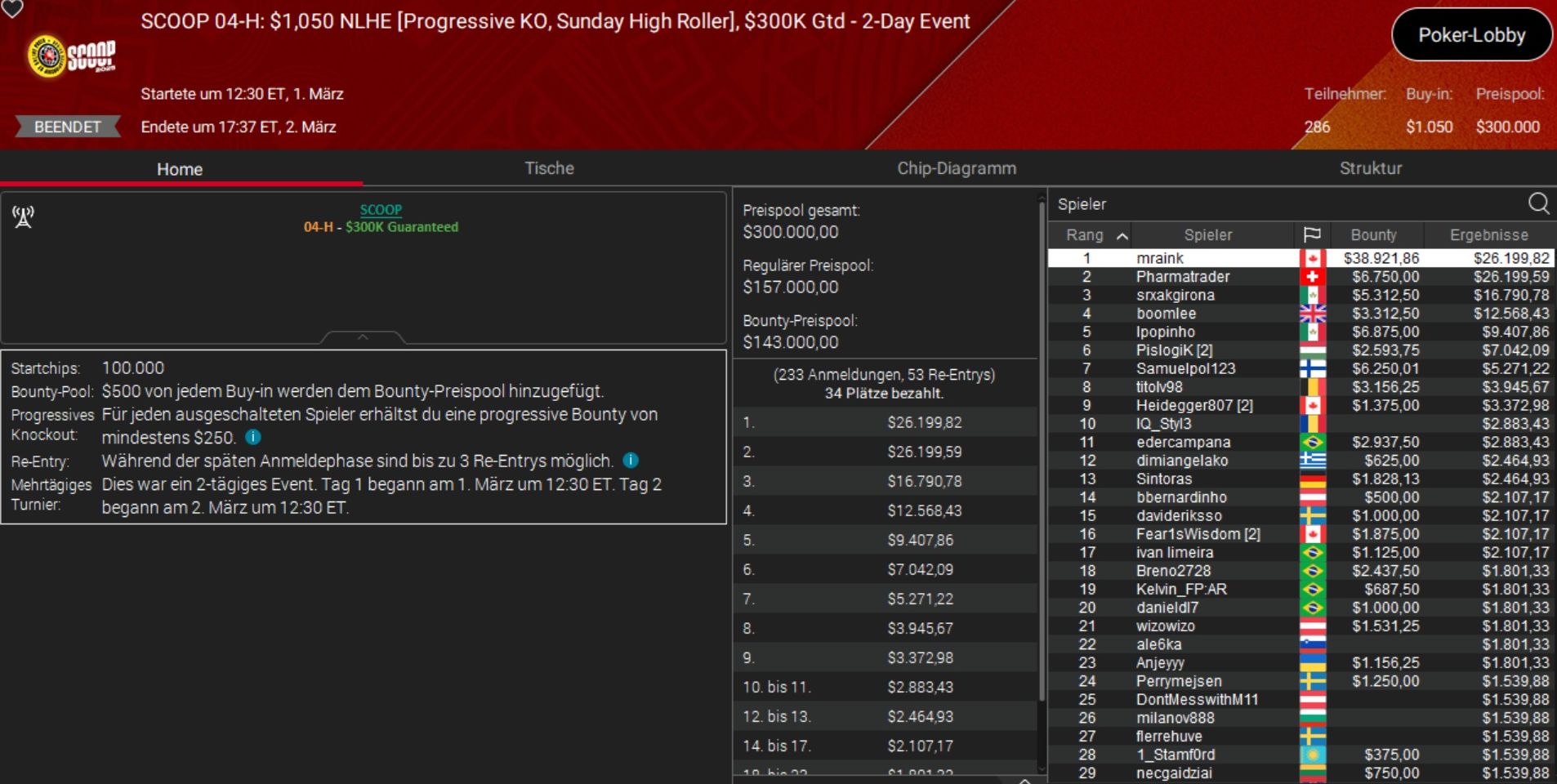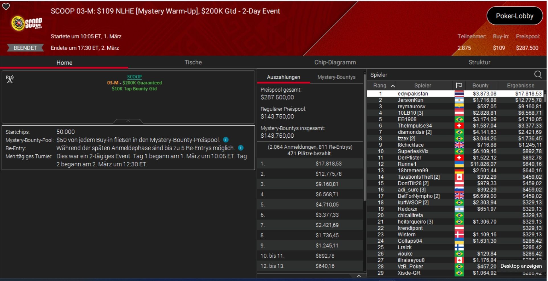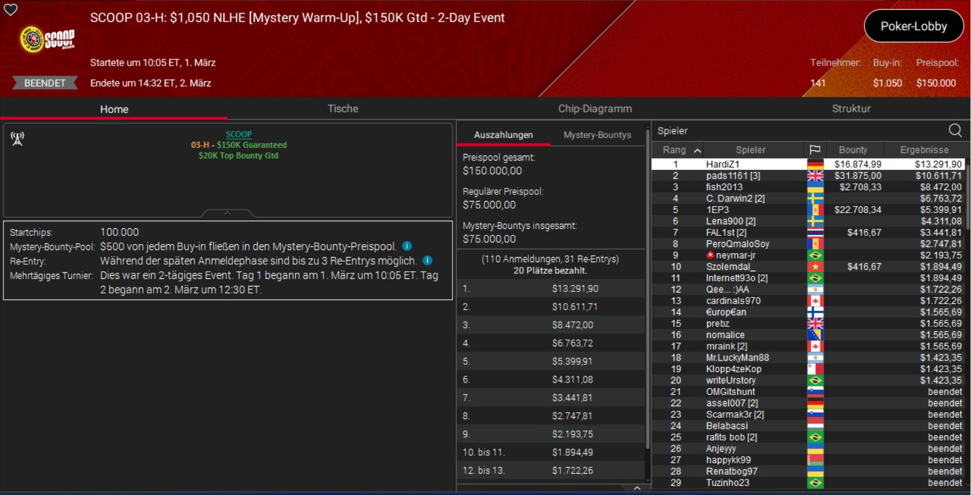 Einen wirklich perfekten Start in die SCOOP 2025 legte der deutsche Highroller „HardiZ1“ hin. Er holte sich Event 3-H, das $1.050 Mystery Warm-Up, und ließ dabei Topspieler wie Patrick „pads1161“ Leonard, Mikita „fish2013“ Badziakouski und Simon „C. Darwin“ Mattsson hinter sich,