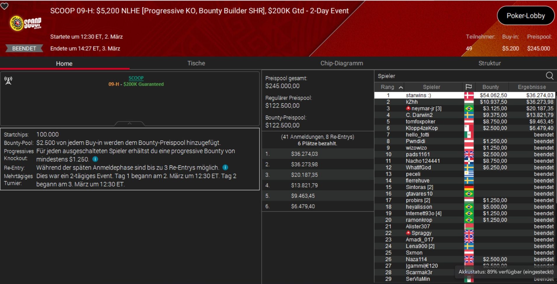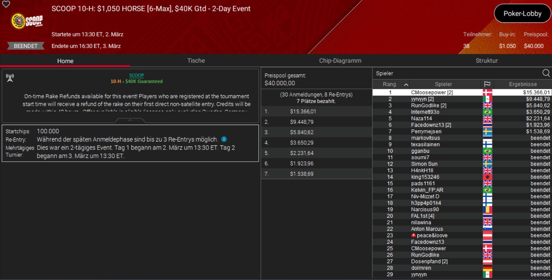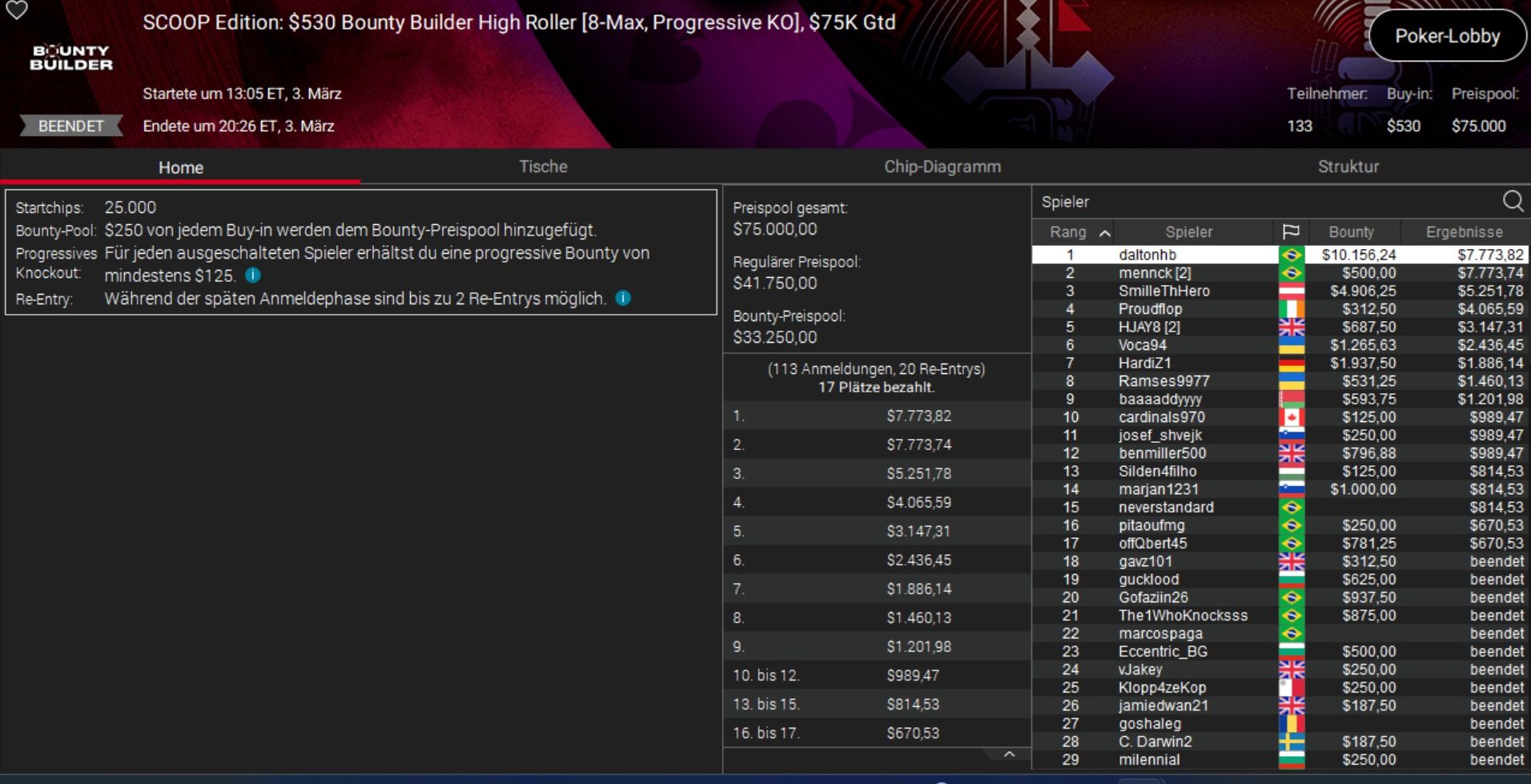 Das beste Ergebnis holte Daniel „SmilleThHero“ Smiljkovic, der bei einem Side Event, dem $530 Bounty Builder, Rang 3 belegte und rund $10.000 gewann.