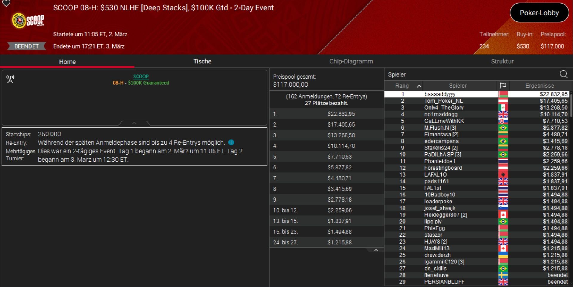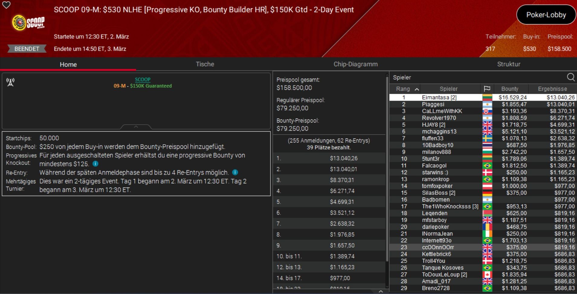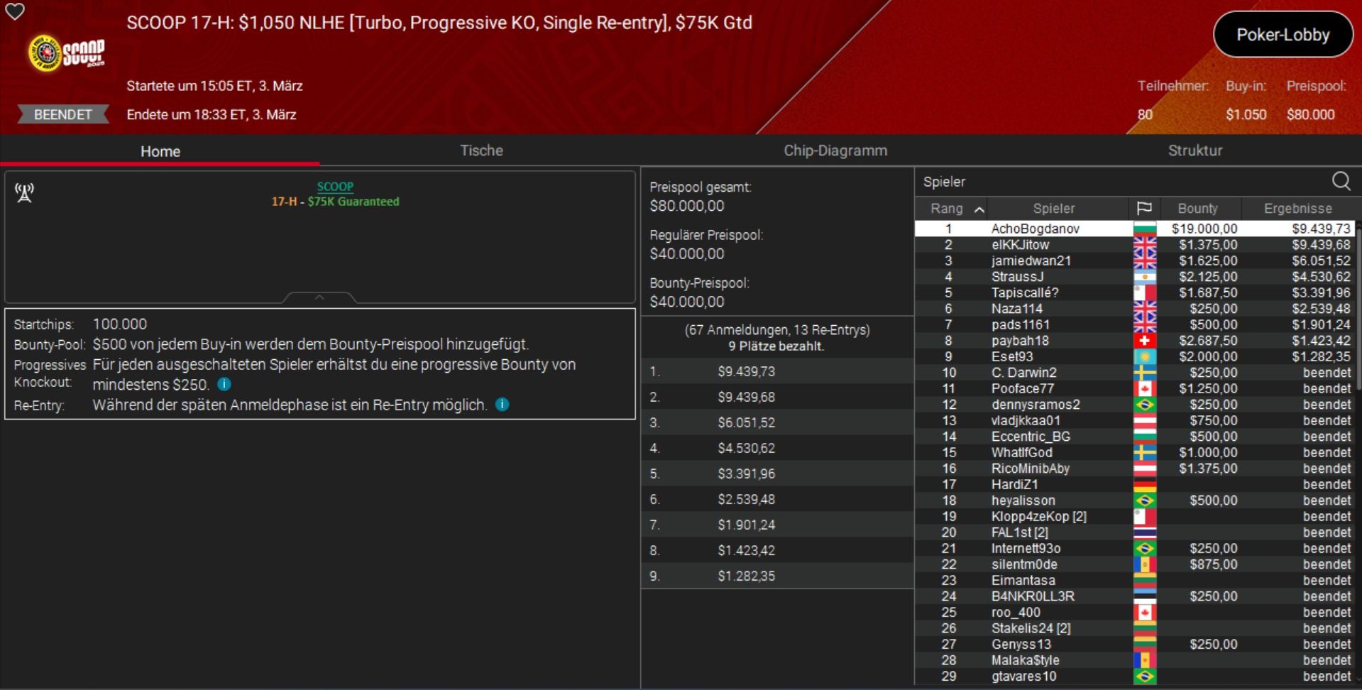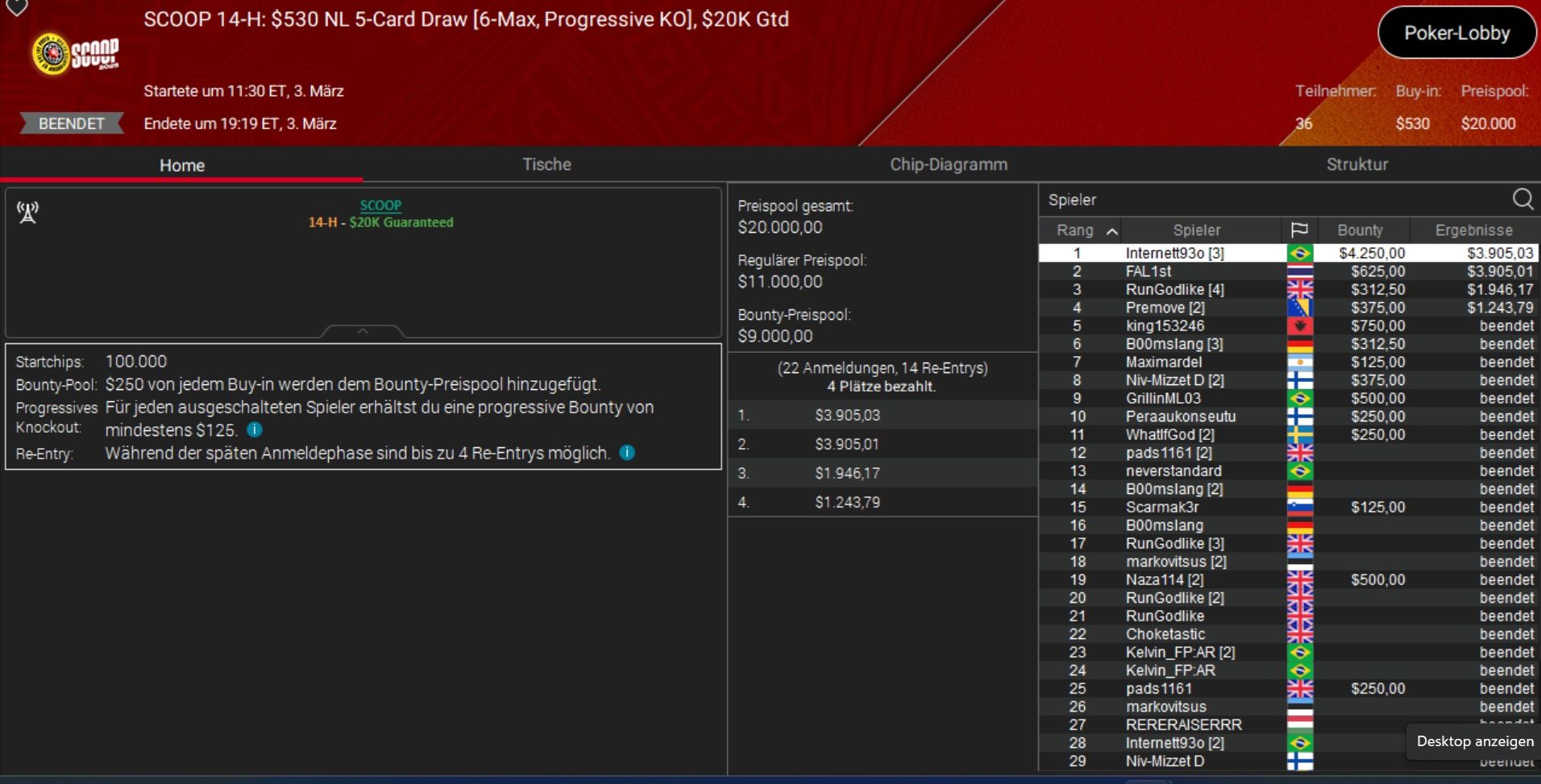 Das beste Ergebnis holte Daniel „SmilleThHero“ Smiljkovic, der bei einem Side Event, dem $530 Bounty Builder, Rang 3 belegte und rund $10.000 gewann.