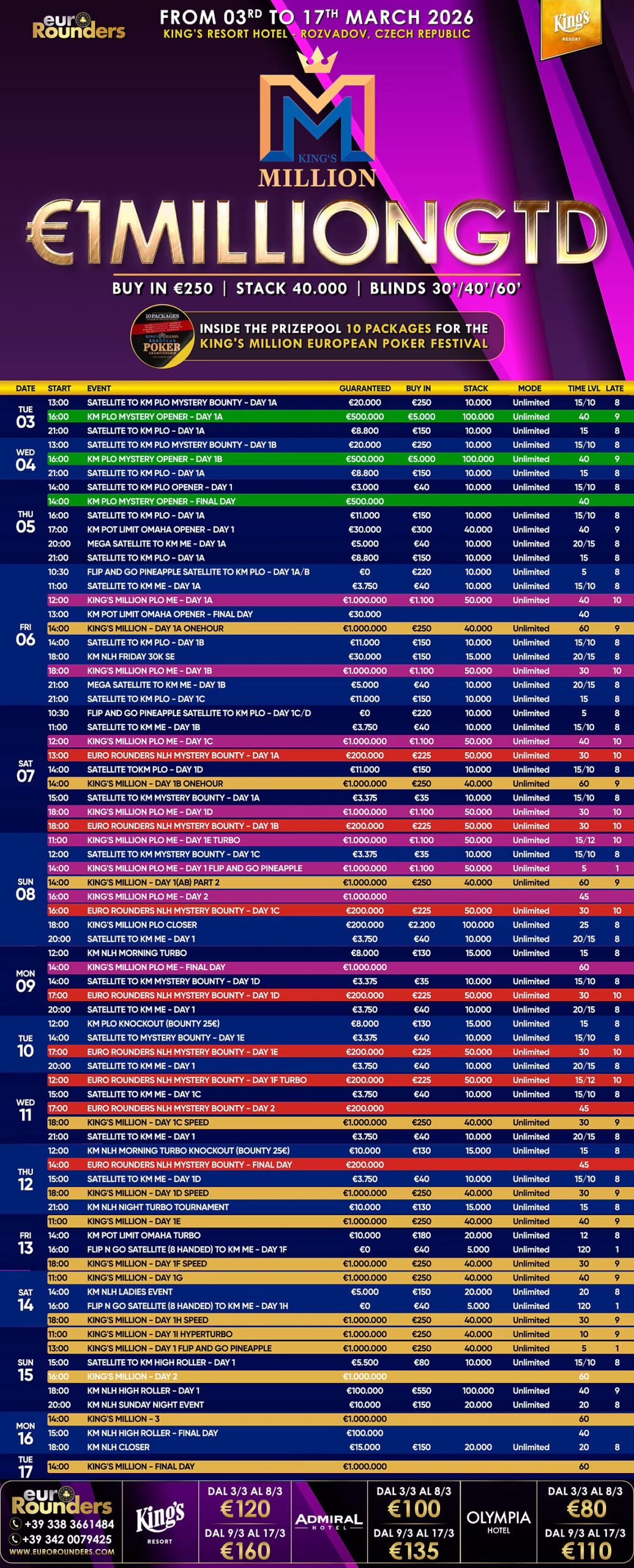Außerdem werden täglich mehrere Satellites angeboten, mit denen man sich für die jeweiligen Turniere qualifizieren kann. Die Satellites für das King’s Million Main Event kosten jeweils €40 und ermöglichen so den preiswerten Sprung ins Turnier.