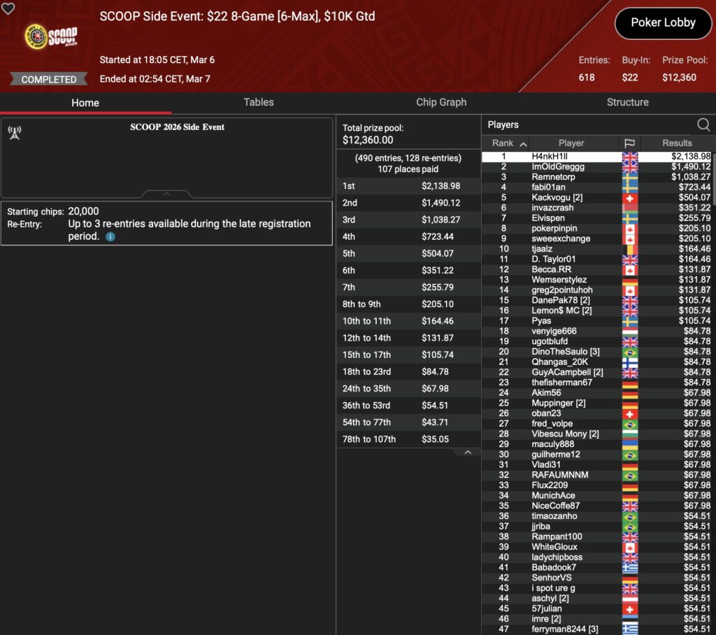 Im 8-Game kamen die Allrounder zum Einsatz. Hier konnten sich die Poker-Dauerbrenner aus der bayerischen Hauptstadt u.a. mit „MunichAce“ (34./618) und dem (Poker-)DJ „Muppinger“ (25./610) in Szene setzen. Das beste D-A-CH-Resultat im Low Tier holte jedoch mit „Kackvogu“ auf Rang 4 ($504) ein Eidgenosse.