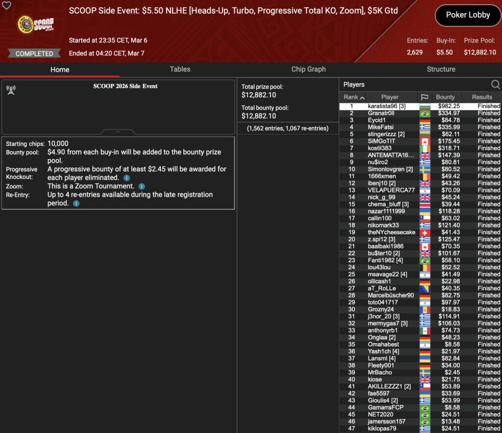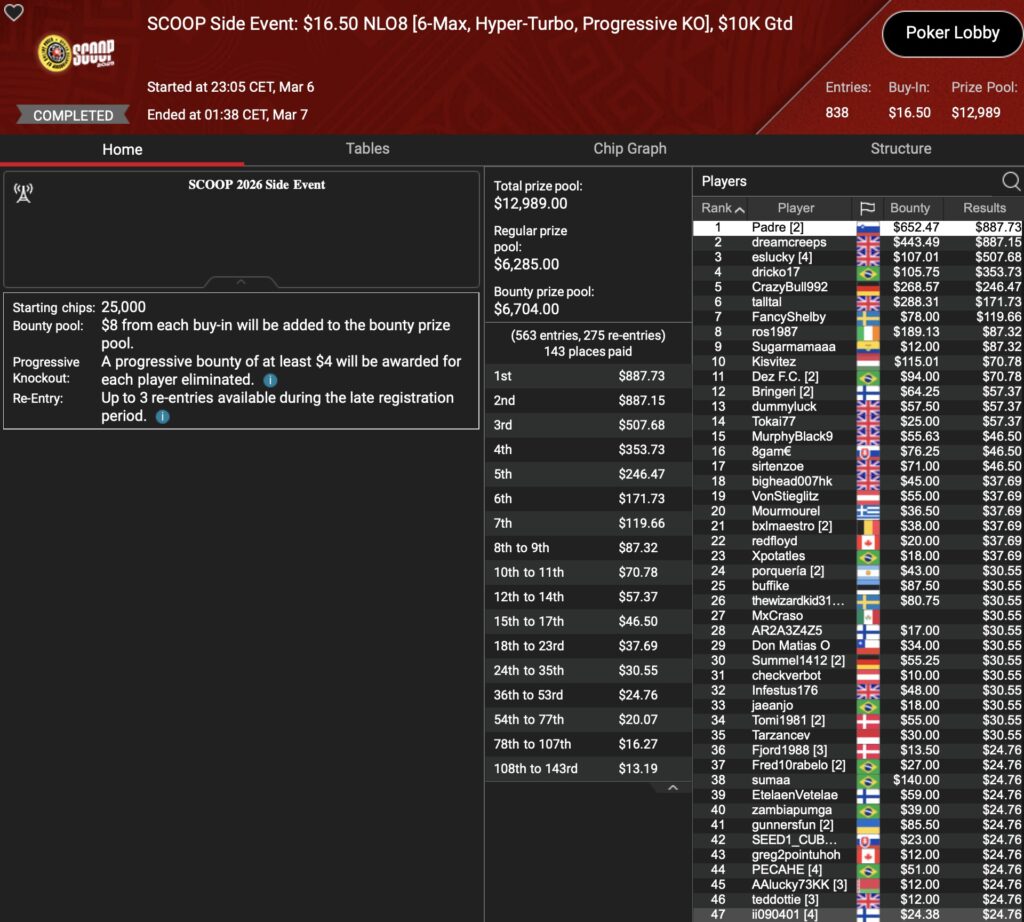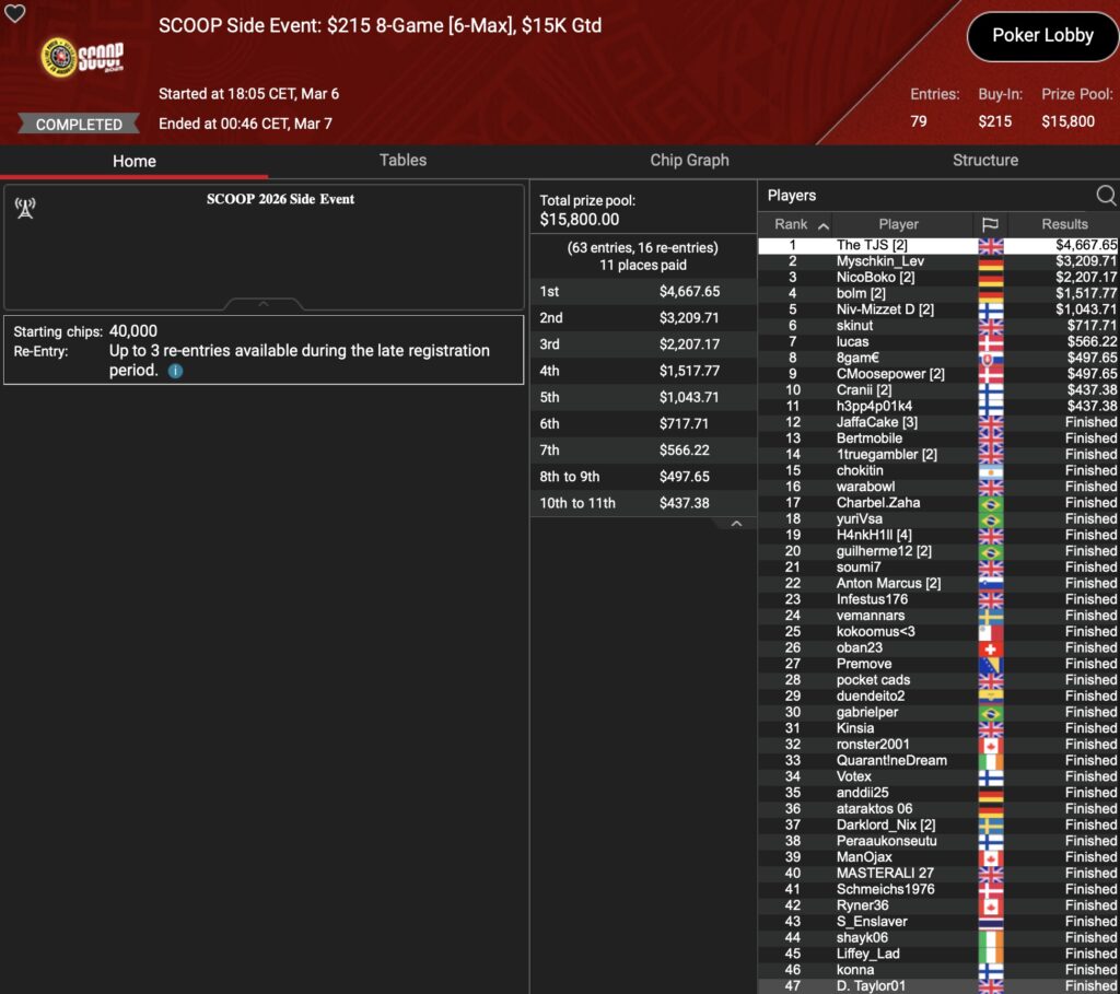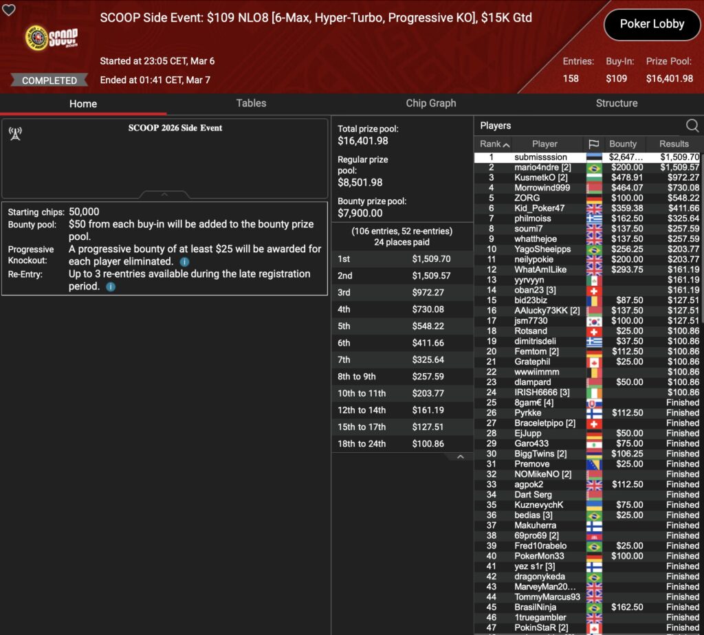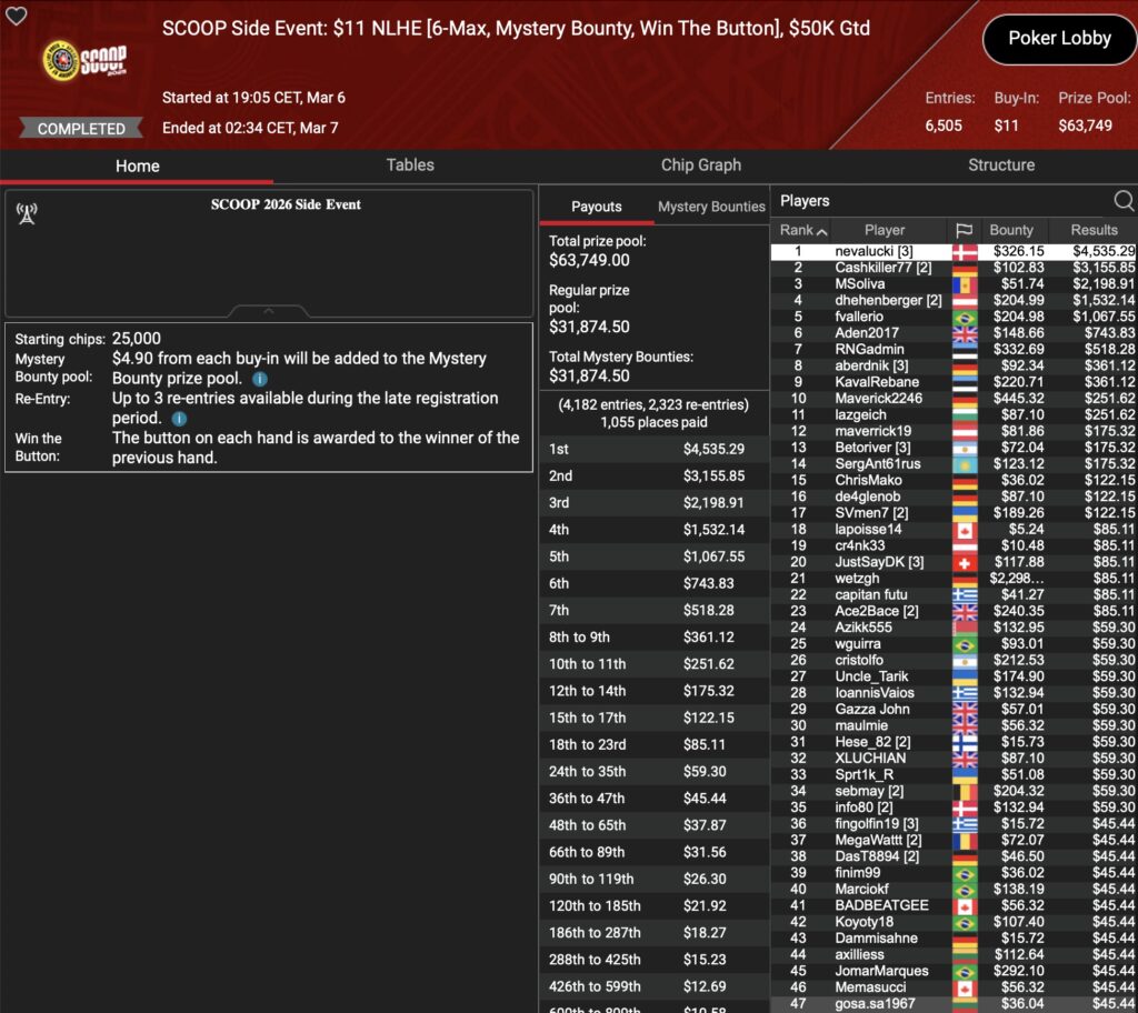 Freitags ist traditionell Ruhetag bei der PokerStars SCOOP (Spring Championship of Online Poker). Das heißt jedoch nicht, dass dort kein Poker gespielt wird. Für diejenigen, die nicht aus ihrem Grind-Trott kommen möchten hält der Online Poker Room traditionell ein paar SCOOP Side Events parat. In den 5 SEs, die jeweils in 2 Buy-In Tiers ausgetragen wurden, konnte die D-A-CH-Community einen Sieg feiern, einem weiteren kam Allrounder Nico „NicoBoko“ Bokowski sehr nah.