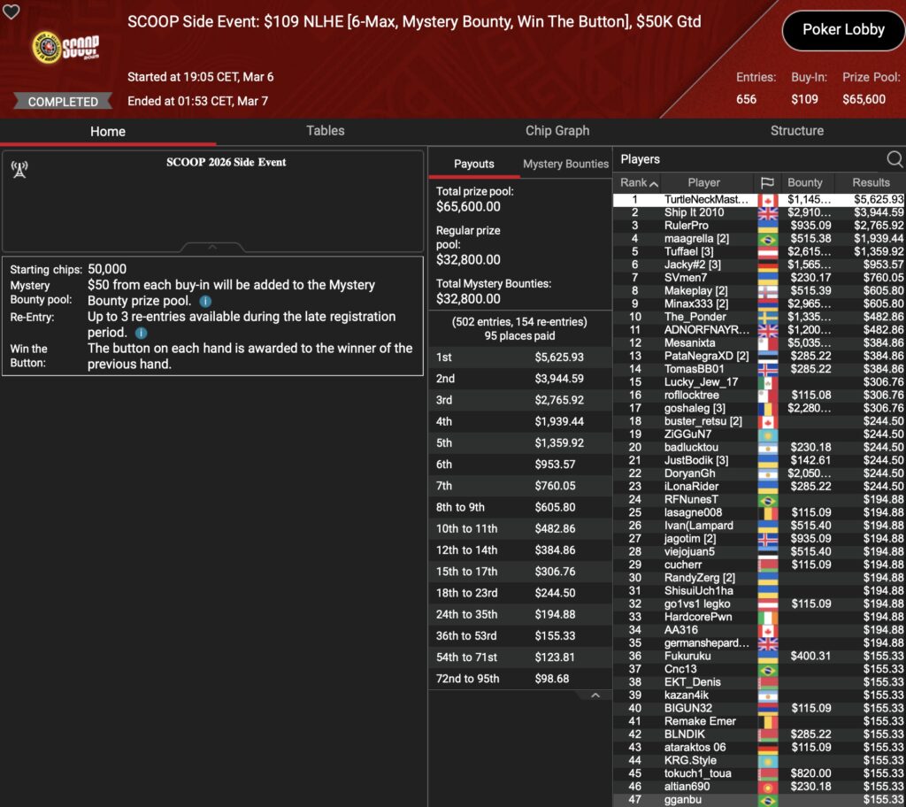 In der $109-Buy-In Ausgabe war es „ZORG„, der die D-A-CH-Hoffnungen auf einen Side Event Sieg am Final Table aufrecht hielt. Am Ende wurde es Rang 5 für $548+$100.