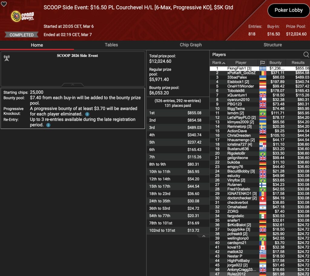 Im teureren $109 Event waren es „Jacky#2“ und „tuffael“ auf den Rängen 6 ($953+$1.565) und 5 ($1.359+$2.615) die aus der D-A-CH-Region am Final Table landeten.
