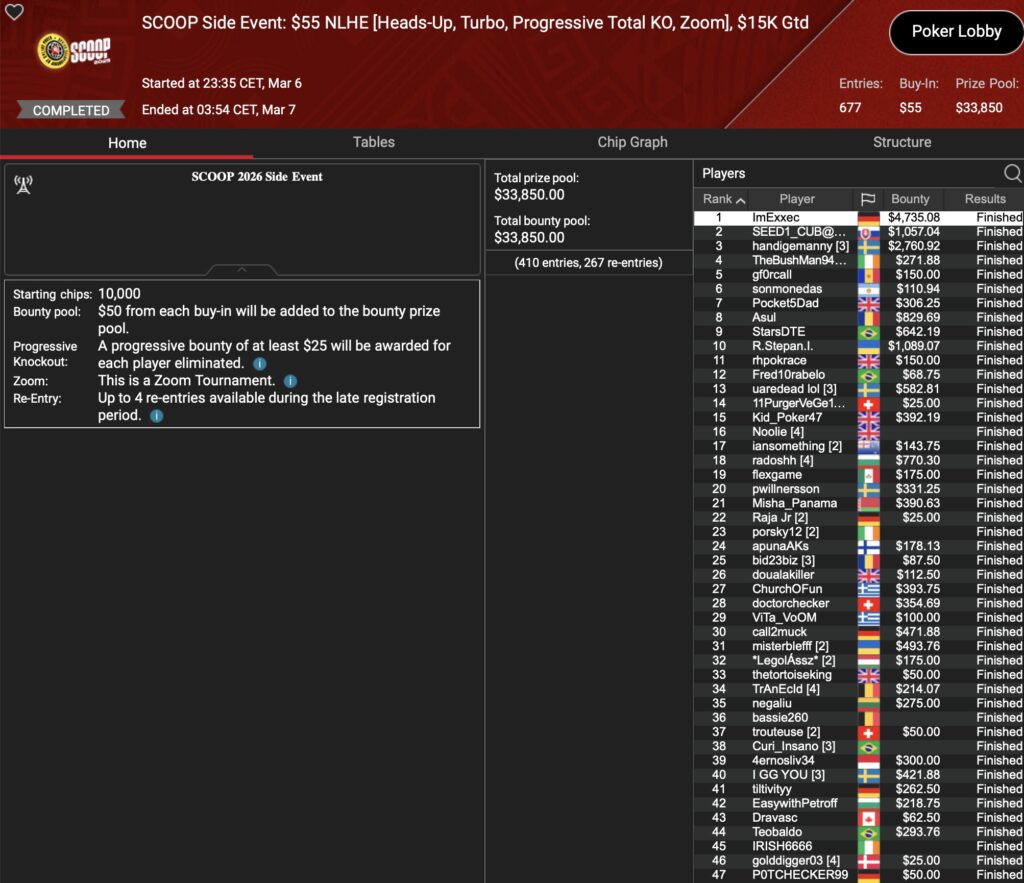 Den einzigen deutschsprachigen SCOOP Erfolg des tages holte „ImExxec„. Der Deutsche setzte sich unter 677 Entrys in dem $55 Turnier durch. Dafür wurde er nach 4 Stunden 20 Minuten Spielzeit mit $4.735 belohnt.