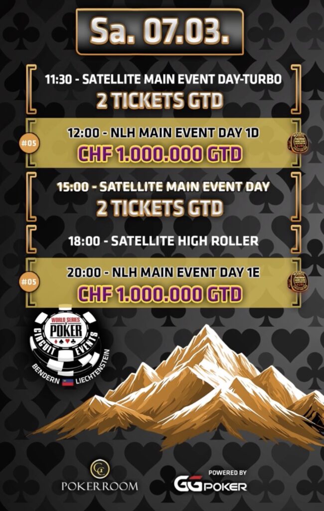 Das NLH Main Event der WSOPC Liechtenstein ist unter den 12 Ring Events mit 1 Million Schweizer Franken im garantierten Preispool das absolute Highlight des WSOPC Circuits, der zwischen dem 26. Februar und dem 10. März in Gamprin-Bendern ausgetragen wird. Für das Startgeld von 1.350+150 CHF kann man an 5 Starttagen (1A bis 1E) in das Rennen um die Million starten. Gestartet wird mit 50.000 Chips. Die Level dauern am Starttag 40 Minuten, in den schneller getakteten abendlichen Flights 20 Minuten. Ab Tag 2 verlängern sie sich in dem 5-Day-Event auf 60 Minuten. Die Late Registration ist für Spätstarts und zum Wahrnehmen der Re-Entry Option 12 Level geöffnet.