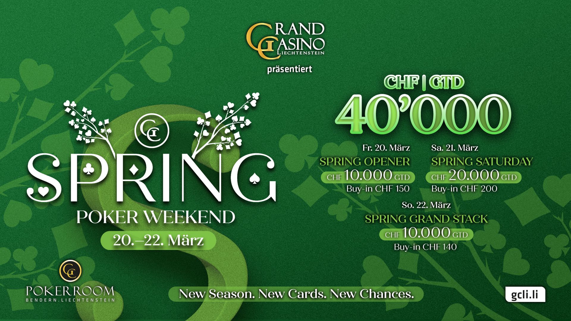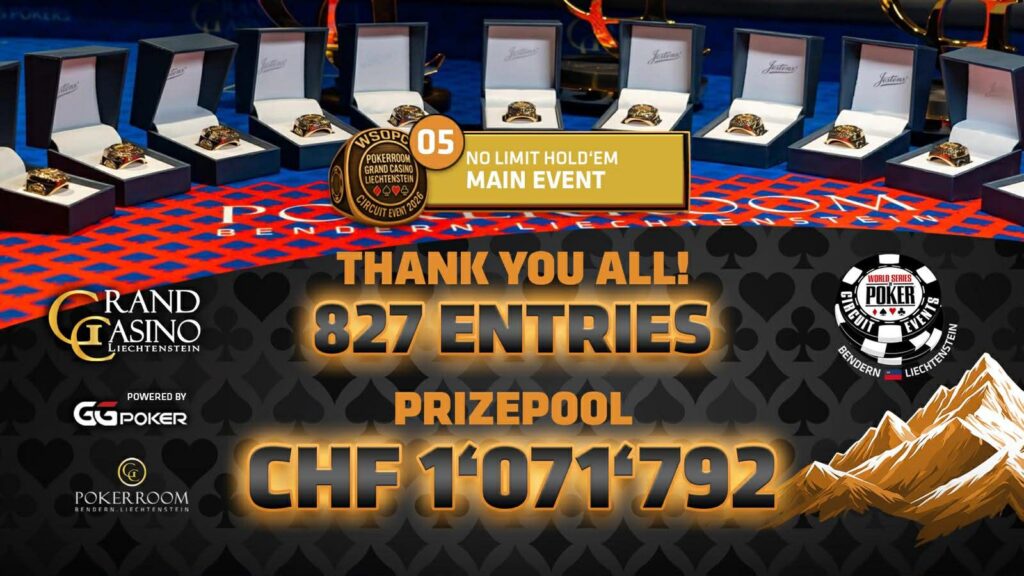 Beim WSOP Circuit Liechtenstein im GC Pokerrrom Bendern vom Grand Casino Liechtenstein (GCLI) geht das WSOPC Main Event in seine heiße Phase. Am zweiten der vier Spieltage wurden aus 125 Spieler*innen, der ursprünglich 827 Entrys, auf WSOPC-Ring_Jagd nur noch 24. Die haben an den letzten 3 Tischen mittlerweile 5.800 CHF aus dem 1.071.792 Preispool sicher, allerdings warten auf den Sieger neben dem WSOP-Geschmeide ganze 190.392 Franken! Gute Chancen darauf haben auch noch 14 Spieler aus dem D-A-CH-L!