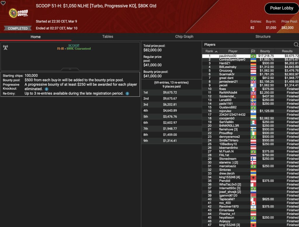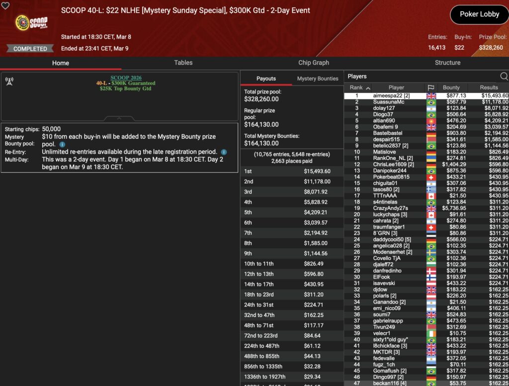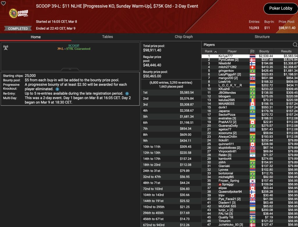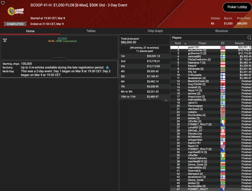 Von den 24 SCOOP-Trophys gingen am Montag verhältnismäßig viele an die ganz großen Namen der Online-Pokerszene: „€urop€an“ gewann für $65.045 gegen 349 Kontrahenten das $1.050 Sunday High Roller, „b.a.angelov“ blieb gegen 299 Widersacher bis zum Schluss im $530 Sunday Kickoff am Tisch und gewann $28.218, Niklas „Lena900“ Aastedt blieb im $1.050 Sunday Warm-Up auch im abschließenden Heads-Up gegen Blaz „Scarmak3r“ Zerjav vorn und fügte seiner Bankroll $21.148+$22.935 hinzu. Und Patrick „pads1161“ Leonard holte keine 24 Stunden nach seinem Trophy-Gewinn den nächsten SCOOP-Pokal im $1.050 PLO8, wofür es $20.551 gab.