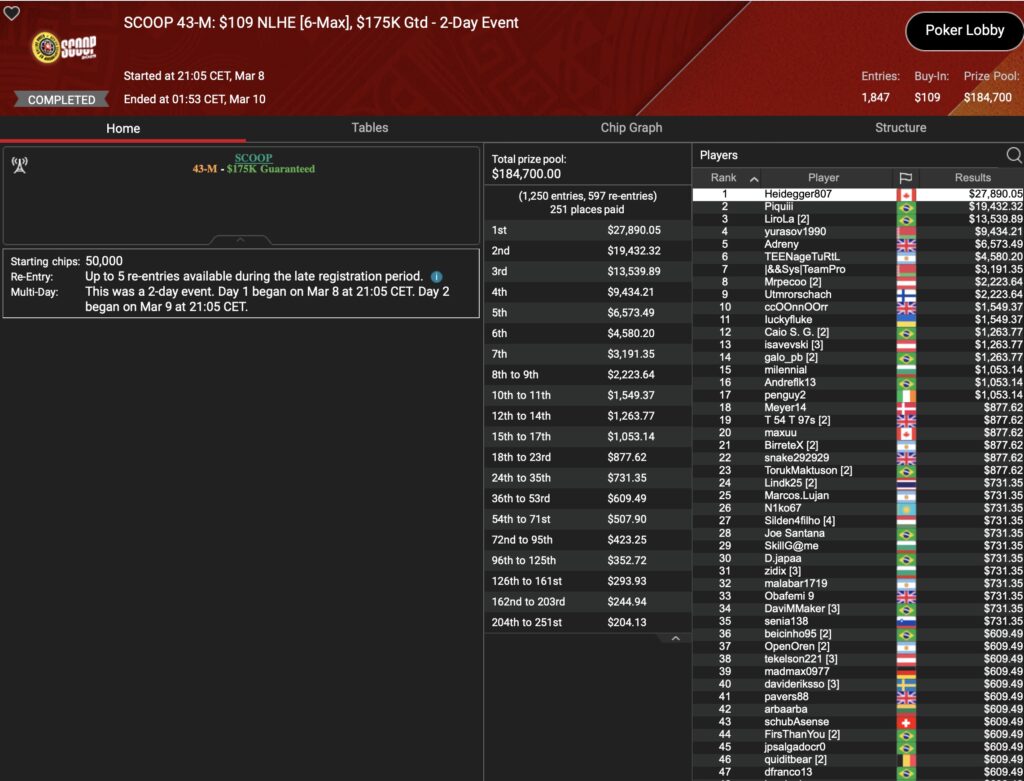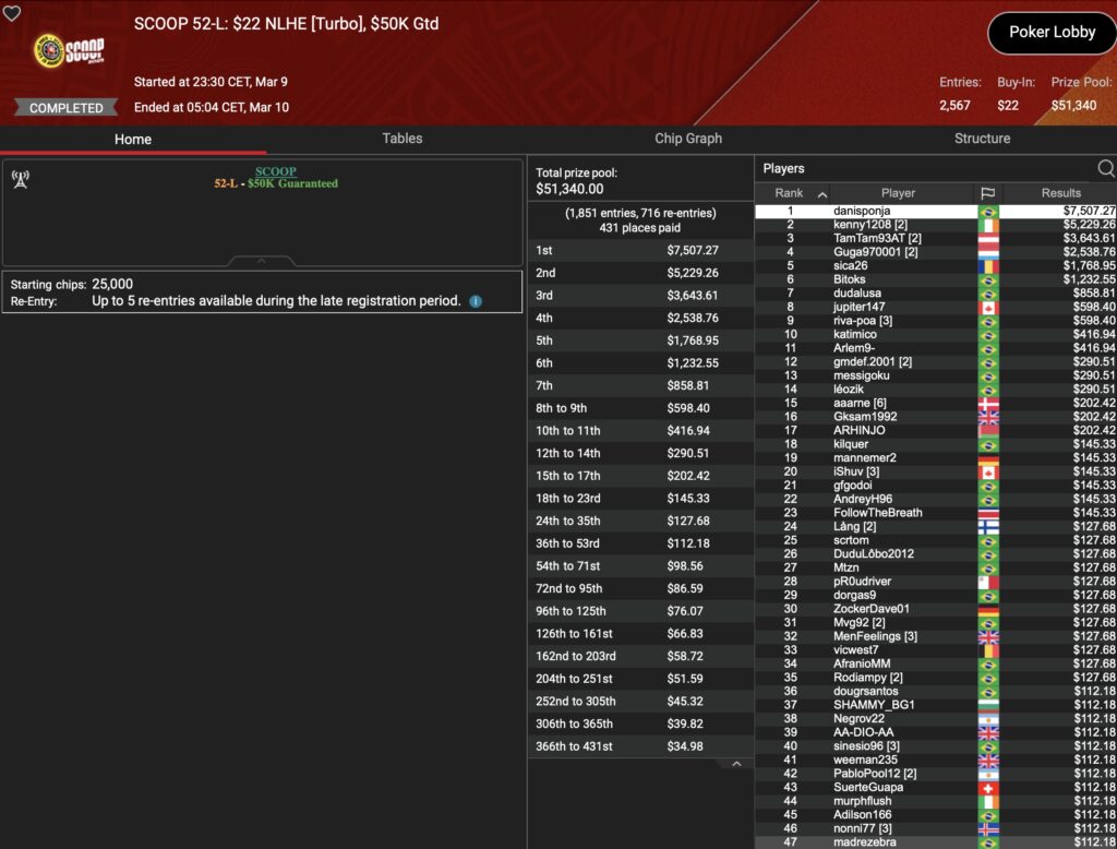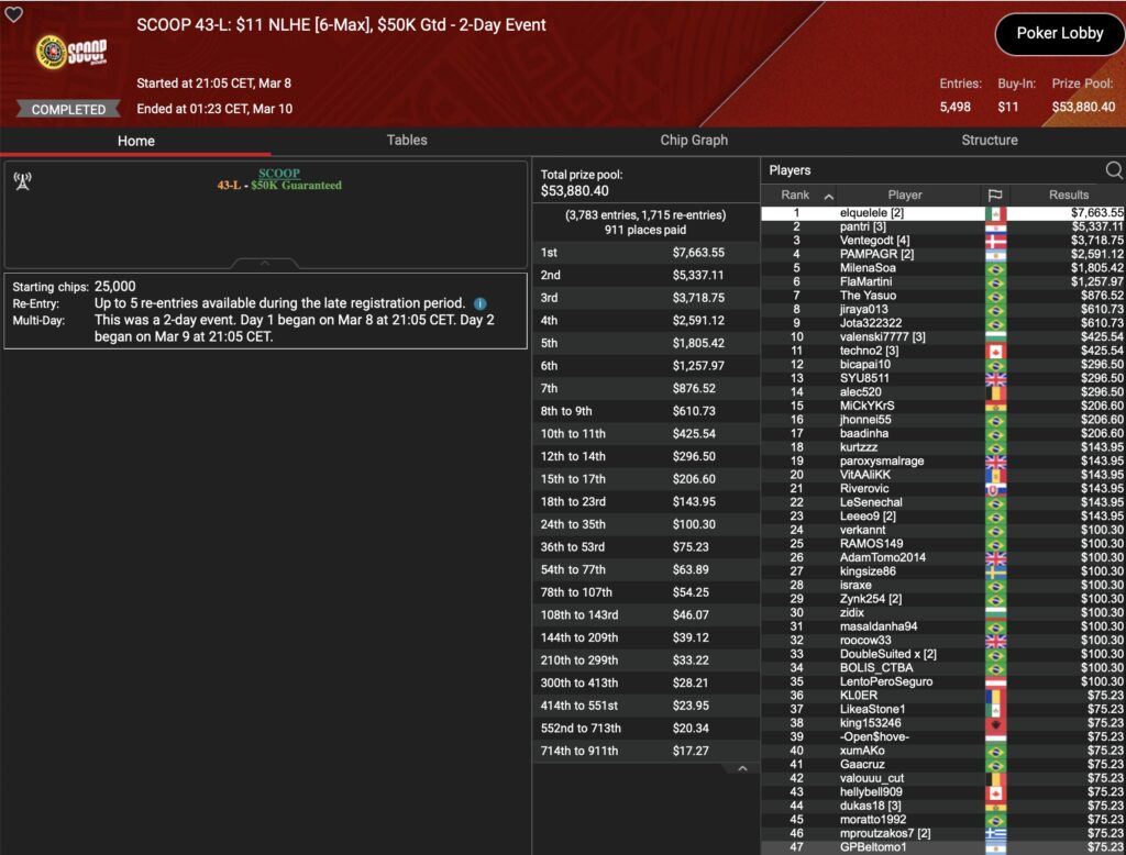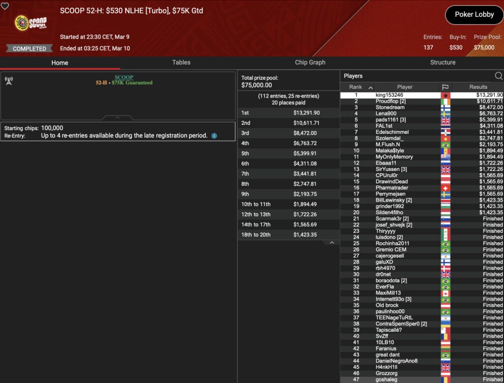 Im selben Event musste der Österreicher „aufzuckerter“ dem Briten im Heads-Up den Vortritt lassen, womit $15.778 Runner-Up Prämie auf ihn warteten. Ein weiteres D-A-CH-Podium gab es durch „polaris“ im $22 Deep Stacks, was mit $7.608 belohnt wurde. Im $530 HORSE hielt „LarryRudex“ die DACH-Ehre bis ins 3-handed-Play aufrecht und cashte dafür $5.012. Und was wäre ein Grind-Tag ohne eine Top-Platzierung von „HardiZ1“. Die holte der Deutsche als 3. im $1.050 NLHE Turbo PKO, zusammen mit $6.202+$500 für die PokerStars-Bankroll. Richtig Tamtam machte „TamTam93AT“ im $22 NLHE Turbo, wo Platz 3 mit $3.643 belohnt wurde. Und auch der deutsche HighRoller „assel007“ fuhr als Runner-Up $109 NLHE Turbo ein Top-Resultat und dabei $8.244.