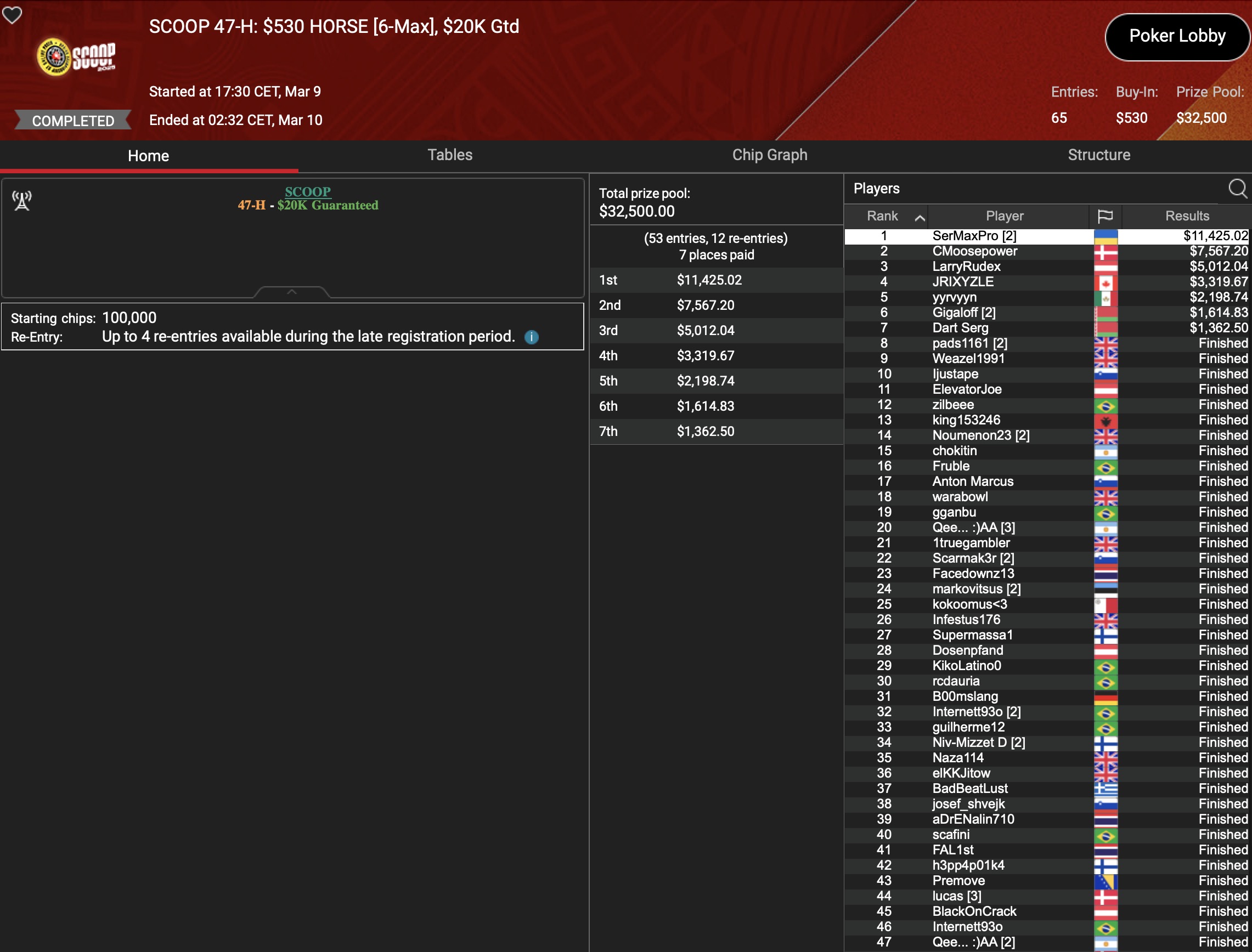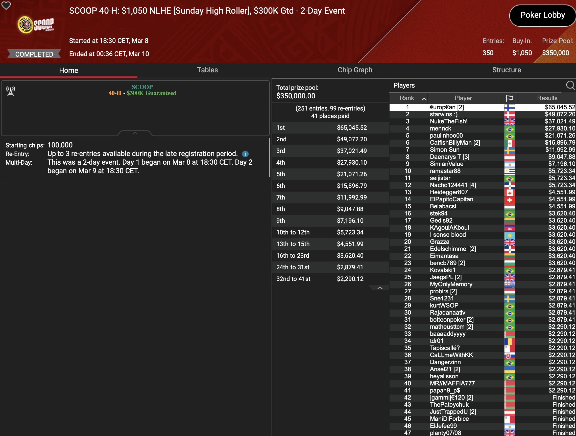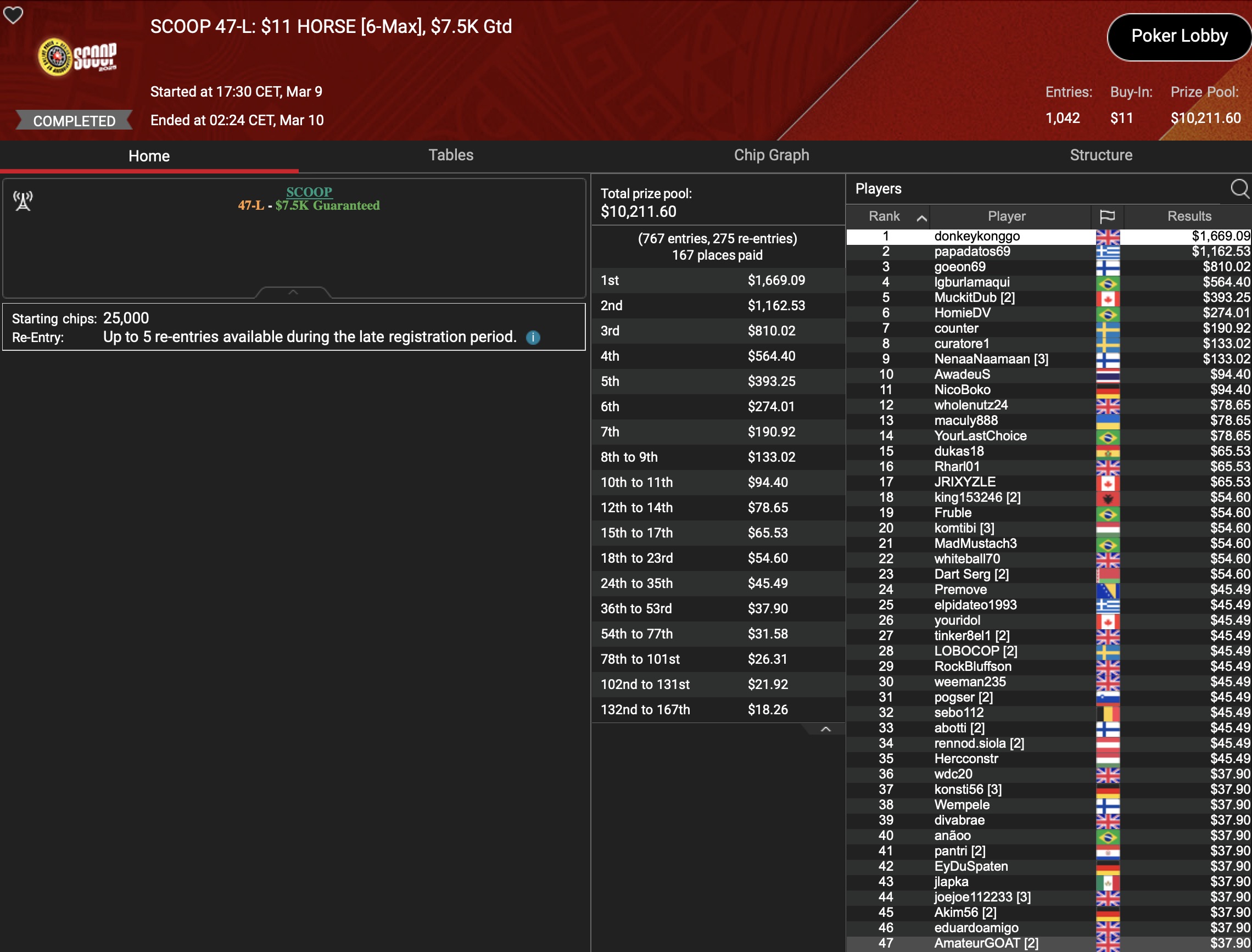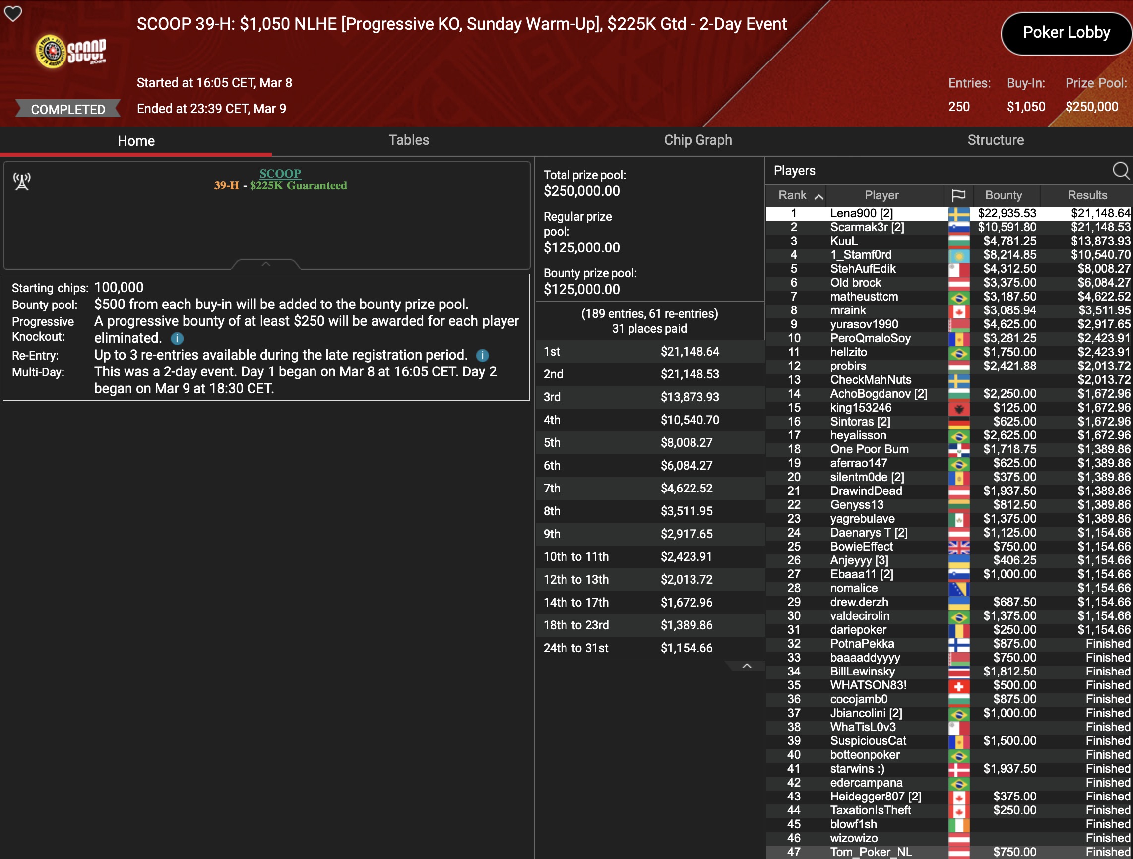 Von den 24 SCOOP-Trophys gingen am Montag verhältnismäßig viele an die ganz großen Namen der Online-Pokerszene: „€urop€an“ gewann für $65.045 gegen 349 Kontrahenten das $1.050 Sunday High Roller, „b.a.angelov“ blieb gegen 299 Widersacher bis zum Schluss im $530 Sunday Kickoff am Tisch und gewann $28.218, Niklas „Lena900“ Aastedt blieb im $1.050 Sunday Warm-Up auch im abschließenden Heads-Up gegen Blaz „Scarmak3r“ Zerjav vorn und fügte seiner Bankroll $21.148+$22.935 hinzu. Und Patrick „pads1161“ Leonard holte keine 24 Stunden nach seinem Trophy-Gewinn den nächsten SCOOP-Pokal im $1.050 PLO8, wofür es $20.551 gab.