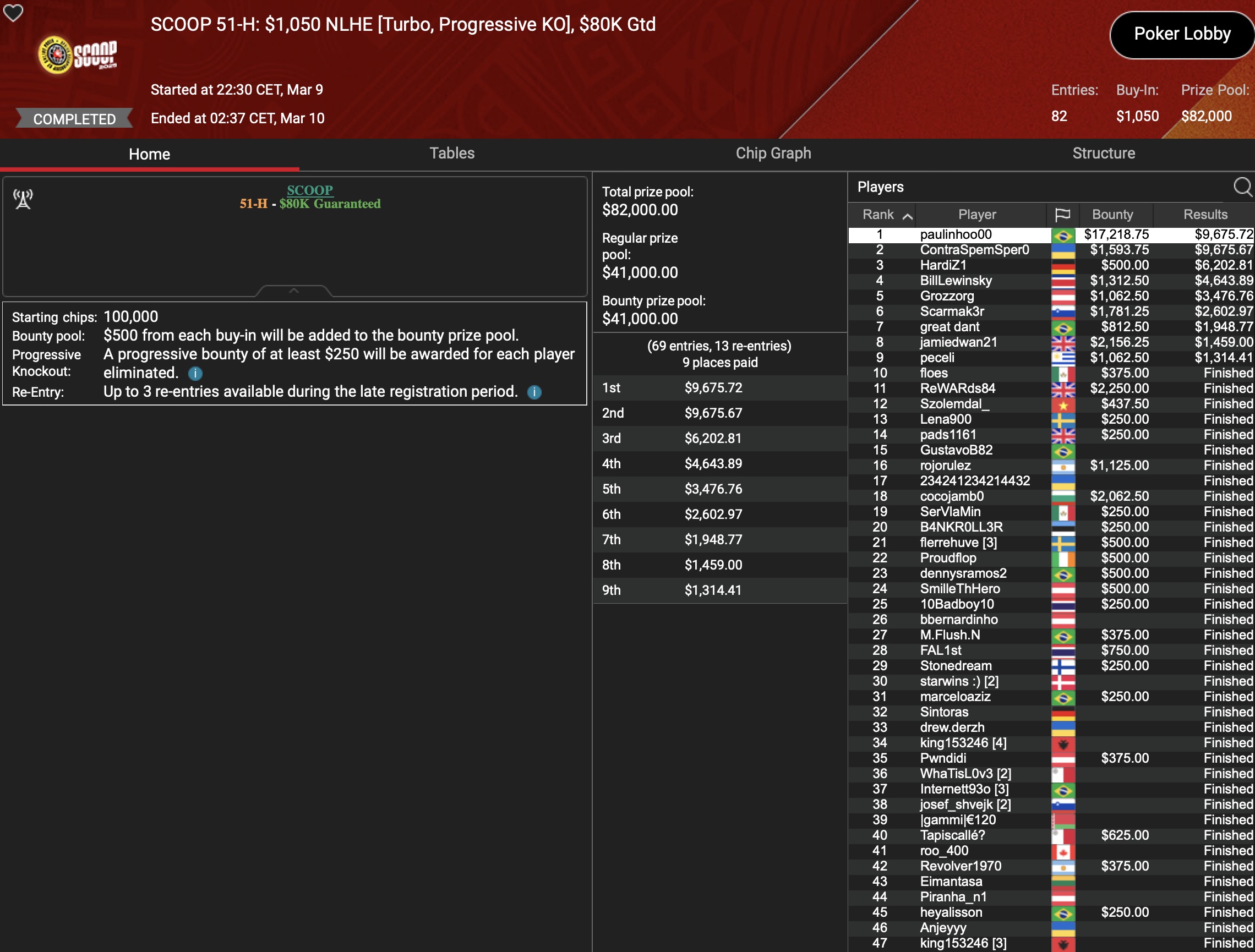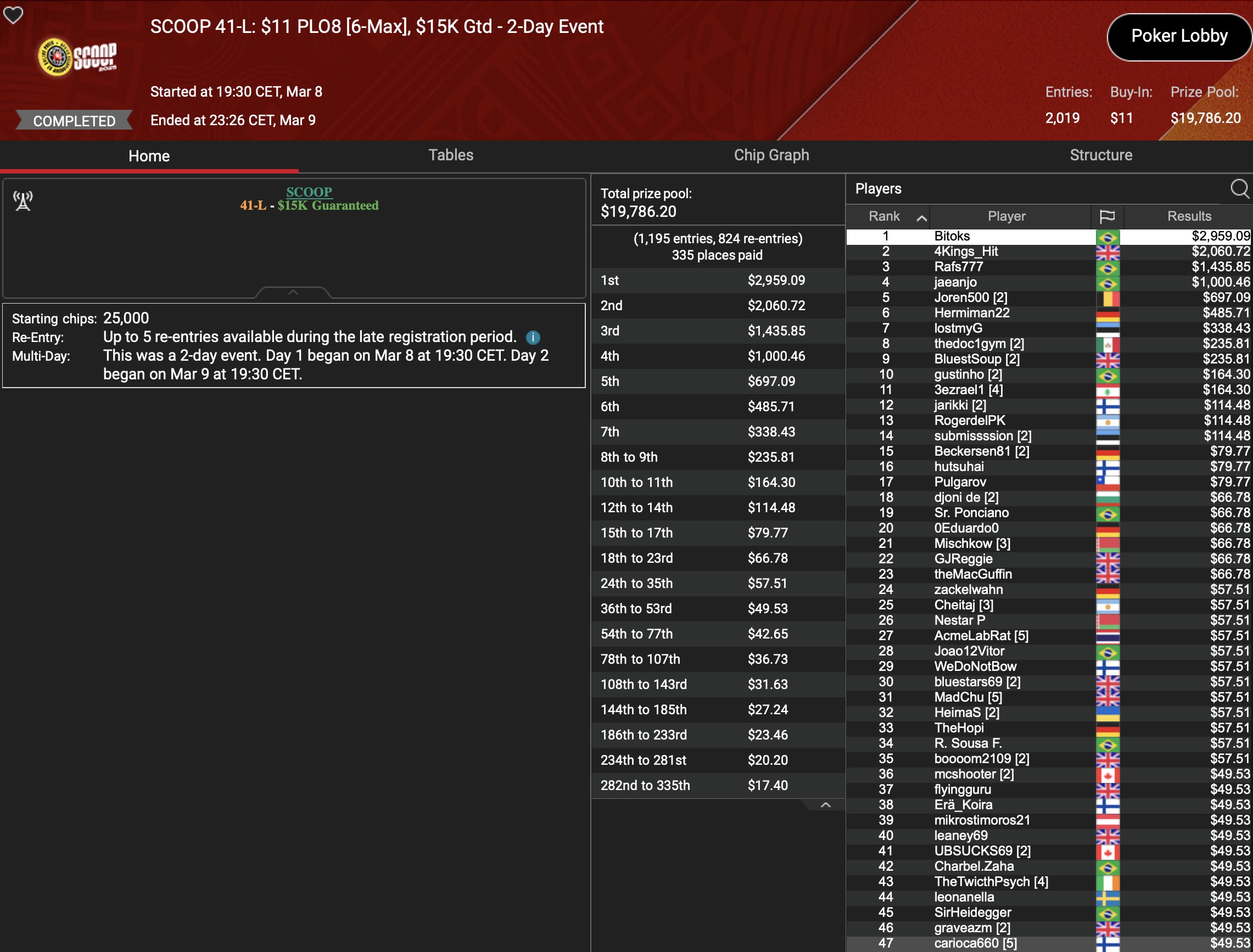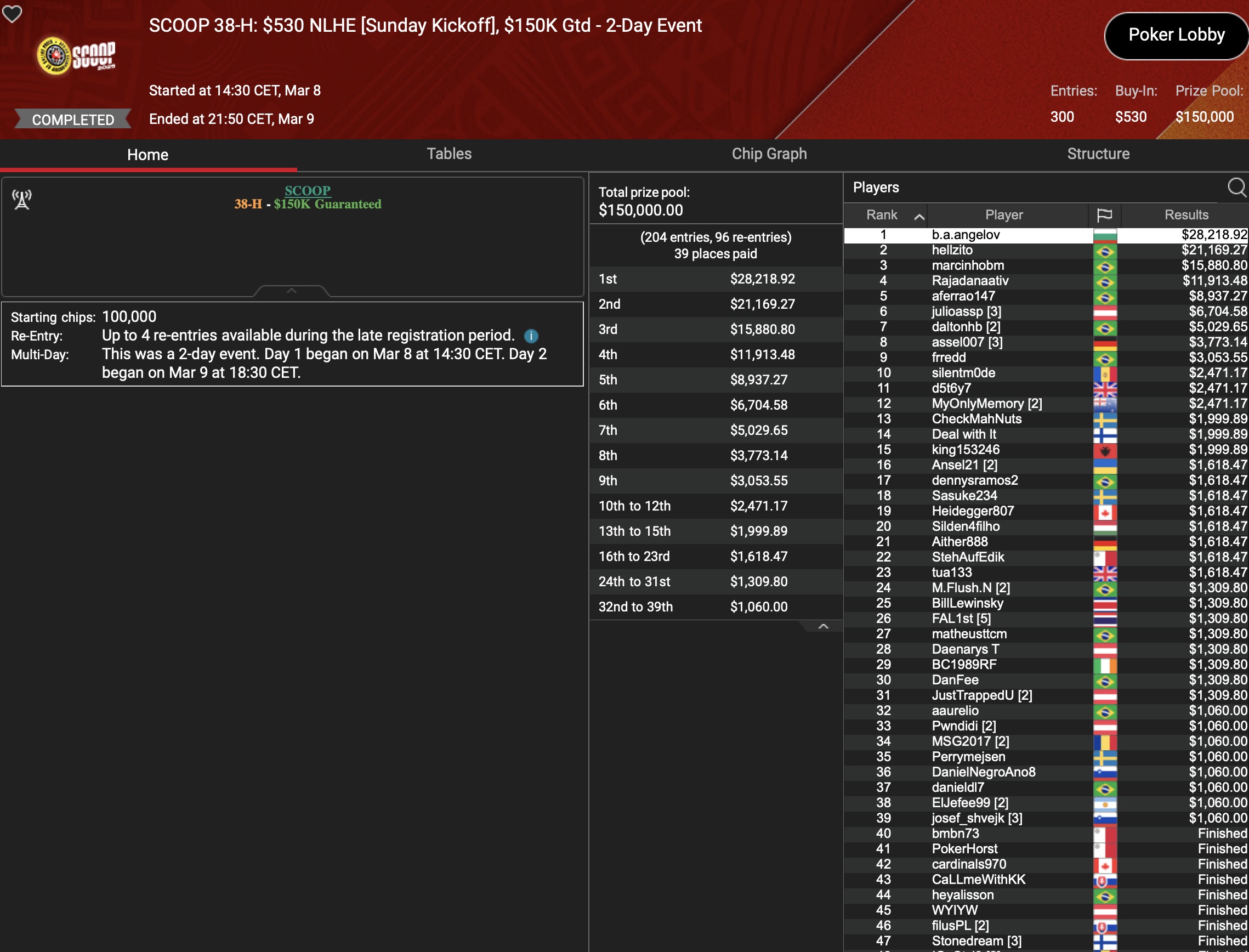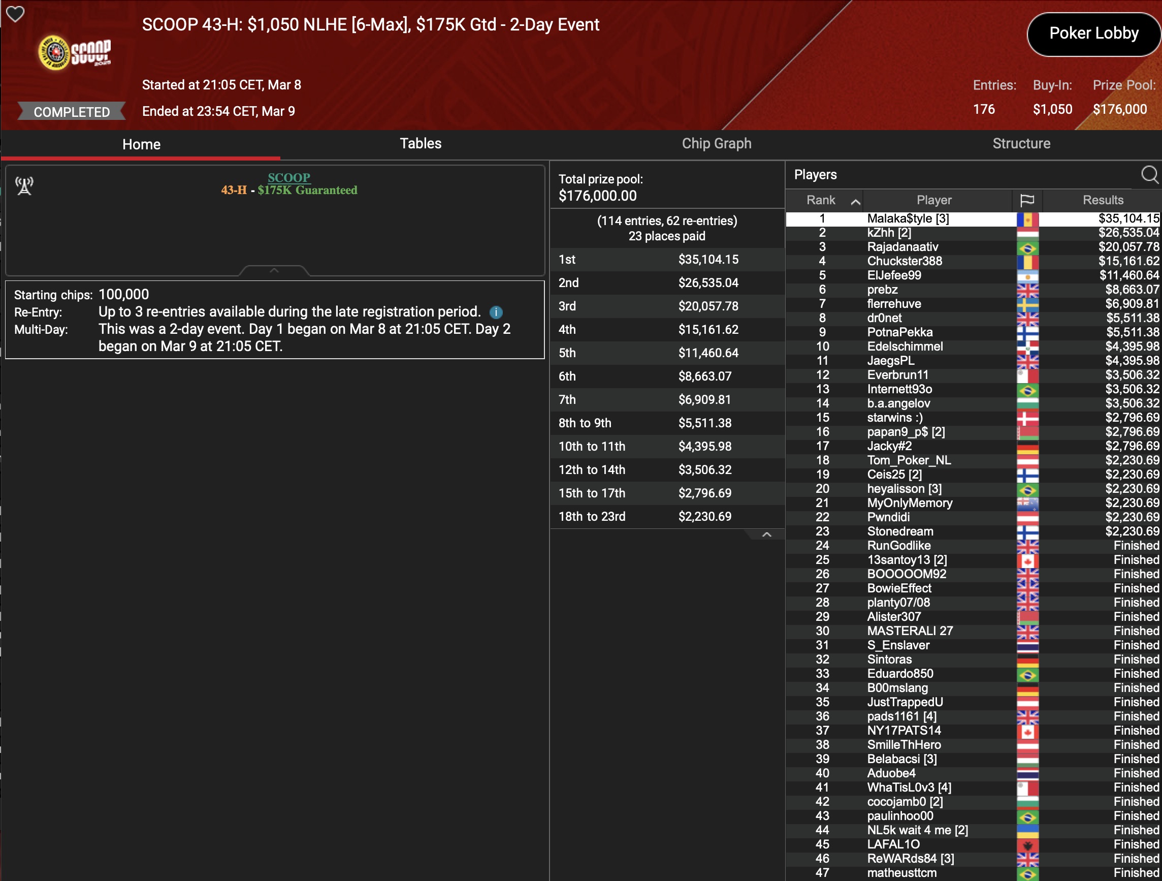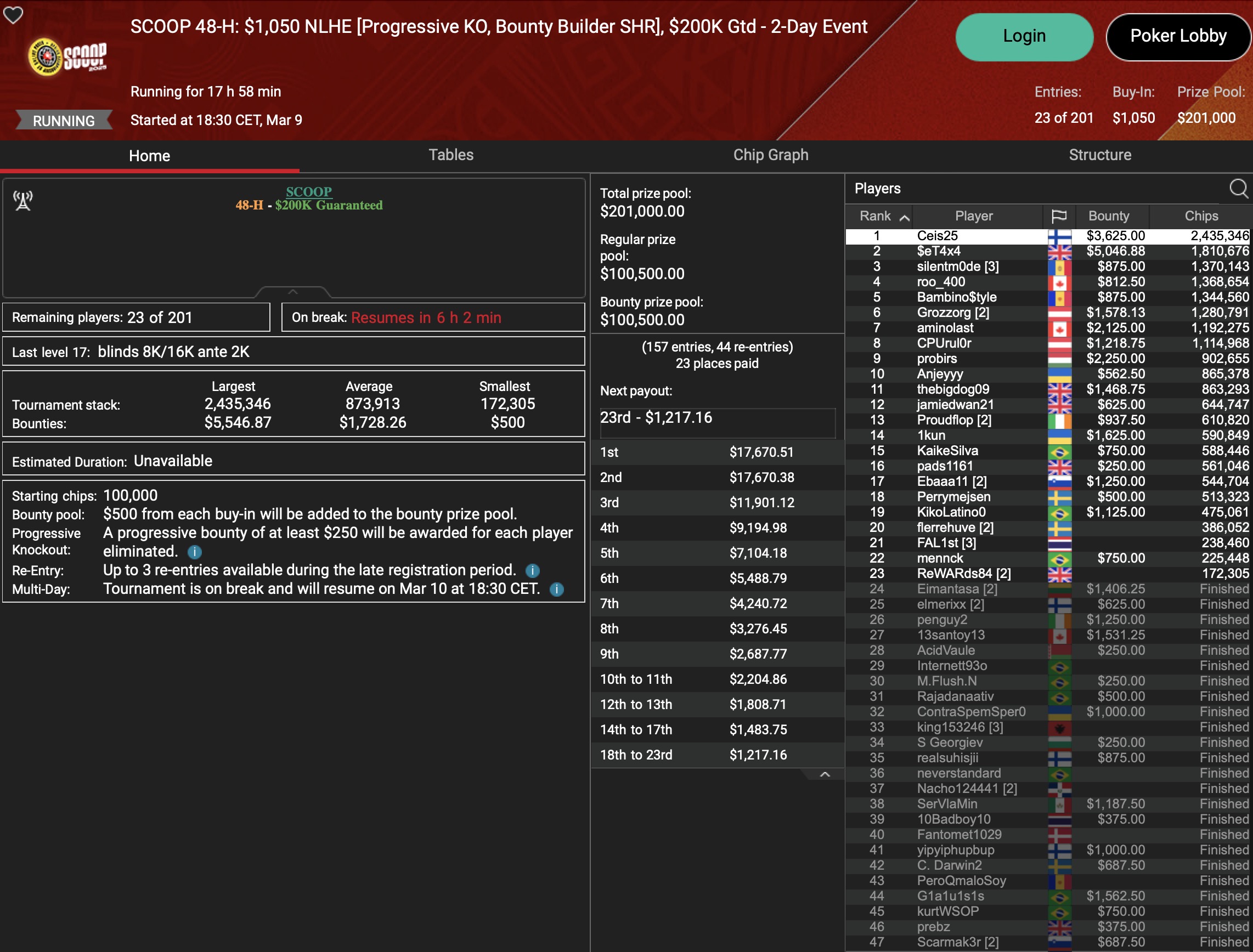 Von den 24 SCOOP-Trophys gingen am Montag verhältnismäßig viele an die ganz großen Namen der Online-Pokerszene: „€urop€an“ gewann für $65.045 gegen 349 Kontrahenten das $1.050 Sunday High Roller, „b.a.angelov“ blieb gegen 299 Widersacher bis zum Schluss im $530 Sunday Kickoff am Tisch und gewann $28.218, Niklas „Lena900“ Aastedt blieb im $1.050 Sunday Warm-Up auch im abschließenden Heads-Up gegen Blaz „Scarmak3r“ Zerjav vorn und fügte seiner Bankroll $21.148+$22.935 hinzu. Und Patrick „pads1161“ Leonard holte keine 24 Stunden nach seinem Trophy-Gewinn den nächsten SCOOP-Pokal im $1.050 PLO8, wofür es $20.551 gab.