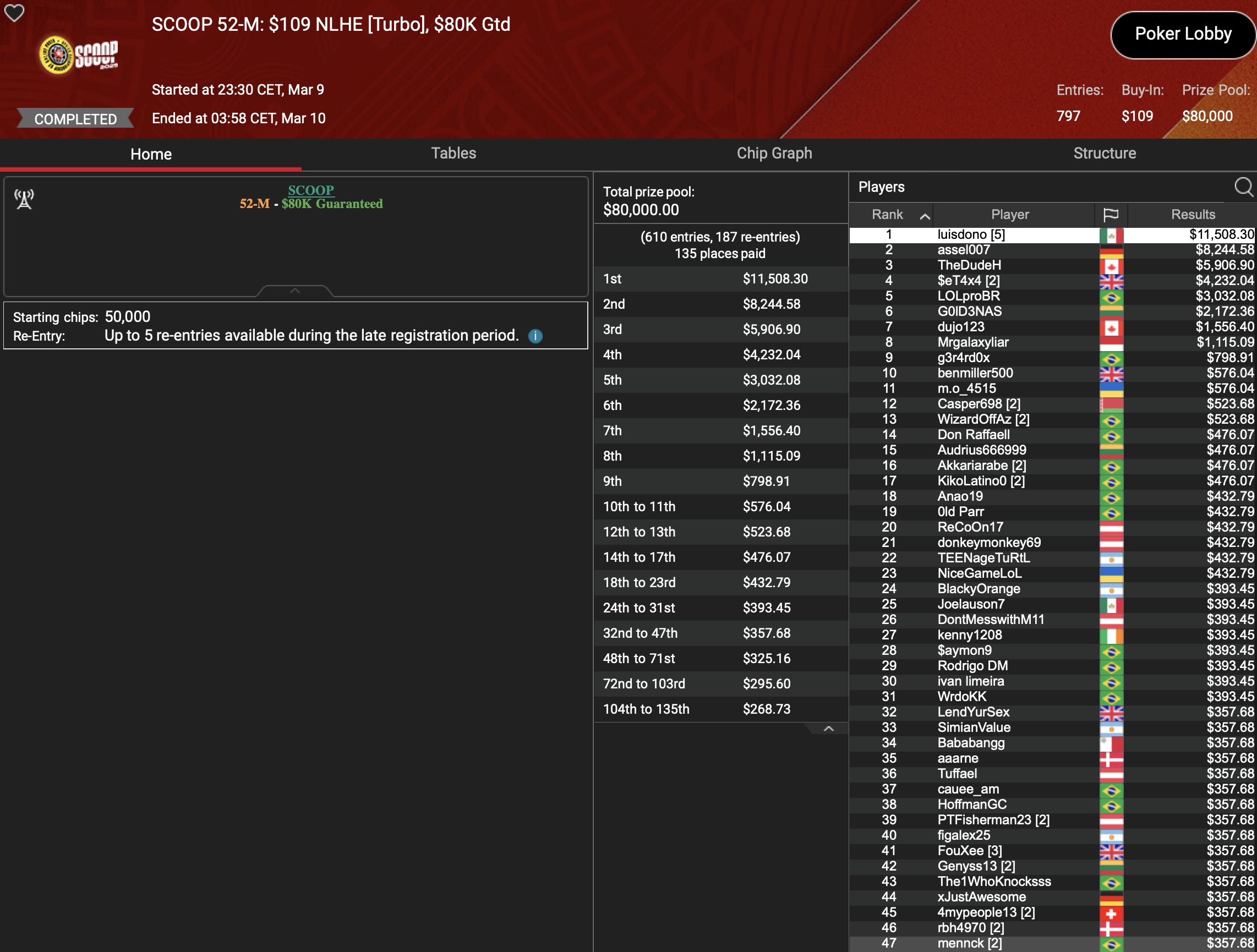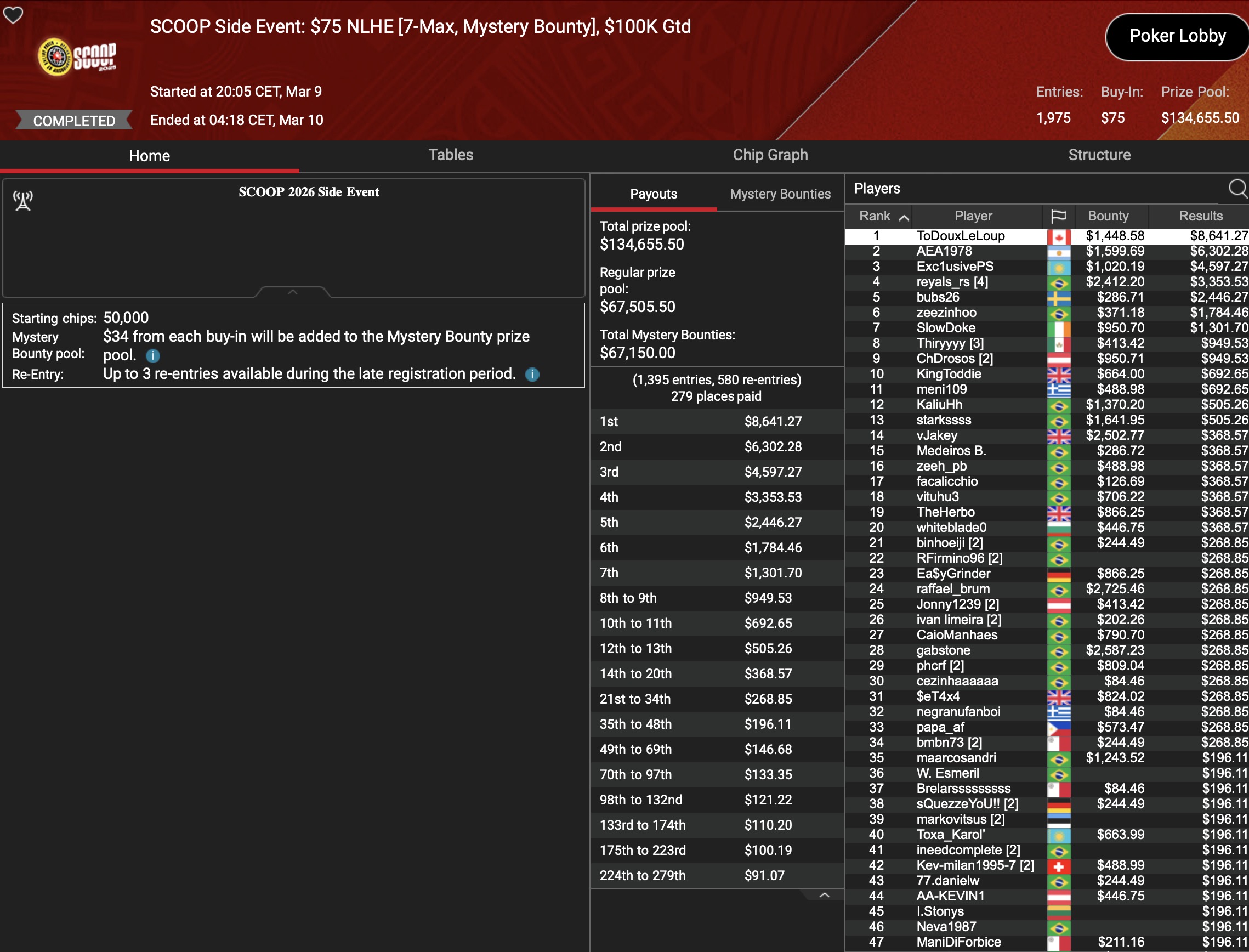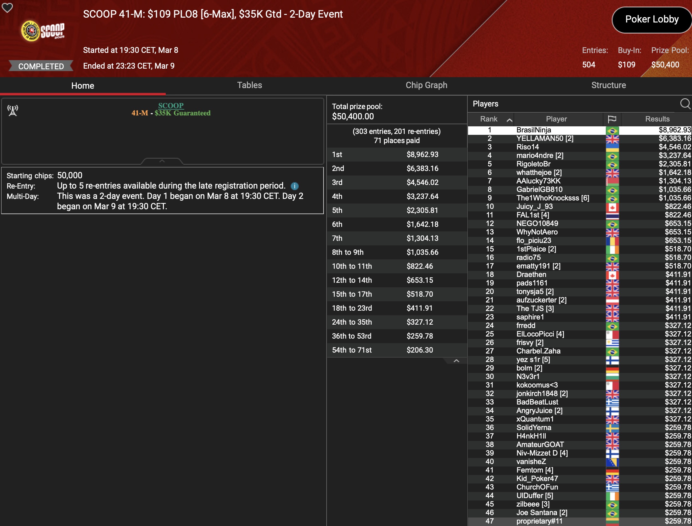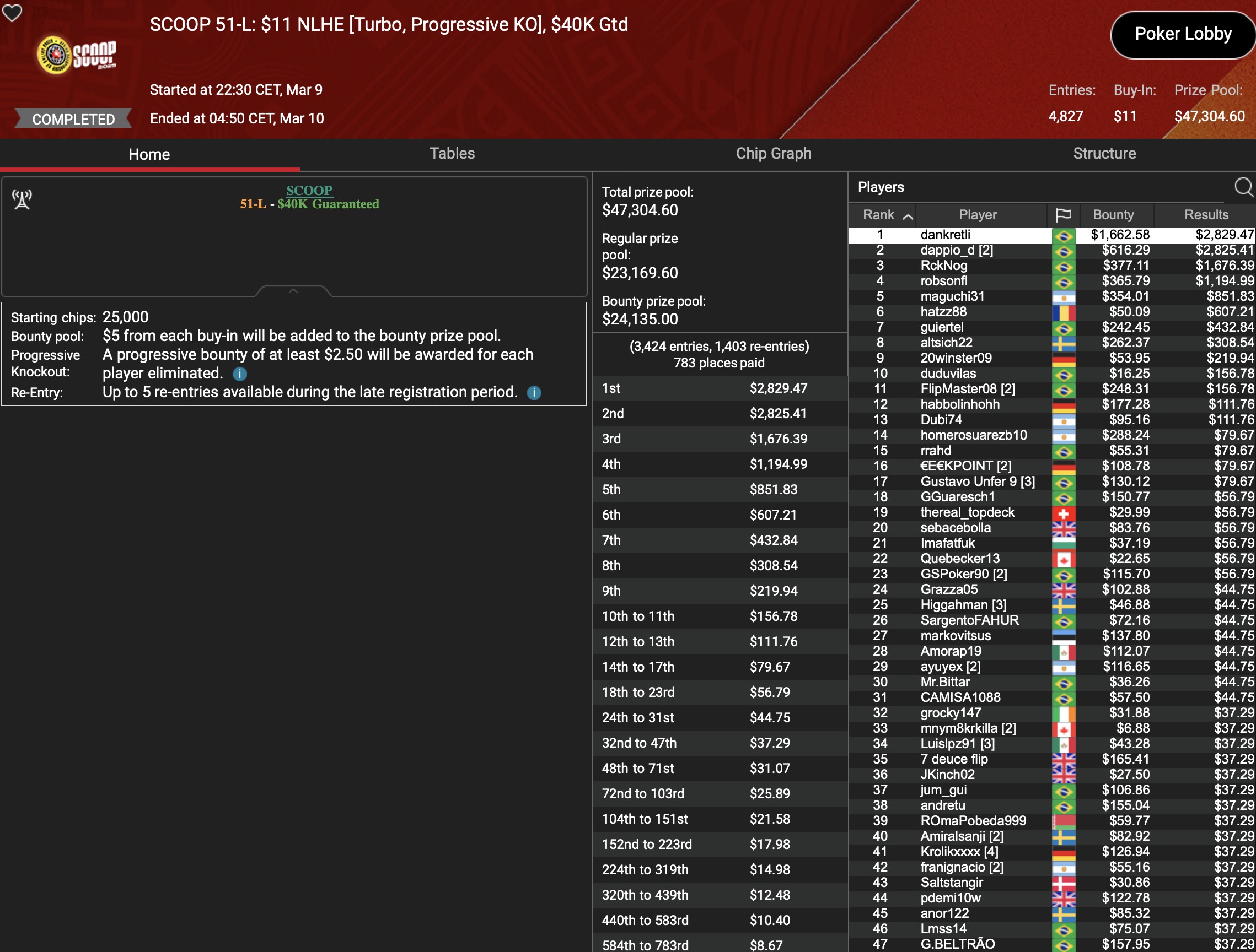 Von den 24 SCOOP-Trophys gingen am Montag verhältnismäßig viele an die ganz großen Namen der Online-Pokerszene: „€urop€an“ gewann für $65.045 gegen 349 Kontrahenten das $1.050 Sunday High Roller, „b.a.angelov“ blieb gegen 299 Widersacher bis zum Schluss im $530 Sunday Kickoff am Tisch und gewann $28.218, Niklas „Lena900“ Aastedt blieb im $1.050 Sunday Warm-Up auch im abschließenden Heads-Up gegen Blaz „Scarmak3r“ Zerjav vorn und fügte seiner Bankroll $21.148+$22.935 hinzu. Und Patrick „pads1161“ Leonard holte keine 24 Stunden nach seinem Trophy-Gewinn den nächsten SCOOP-Pokal im $1.050 PLO8, wofür es $20.551 gab.