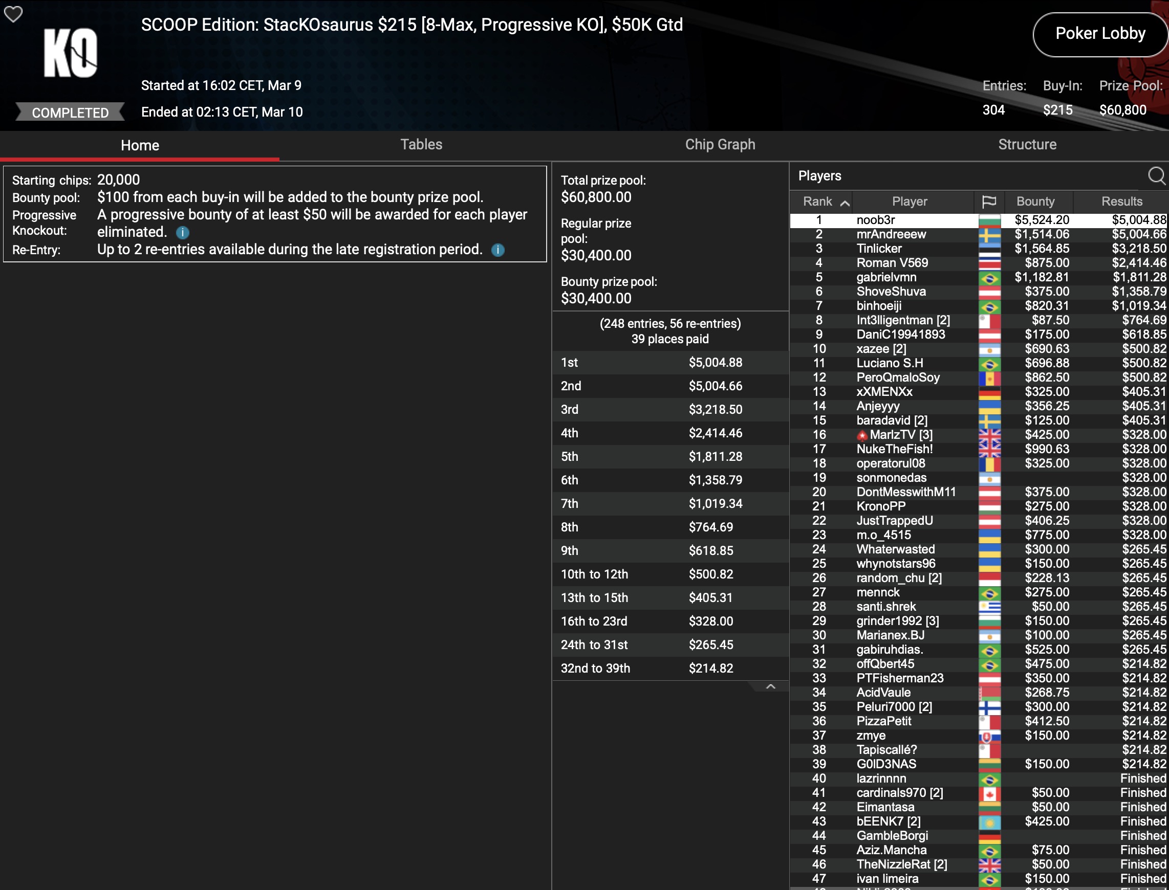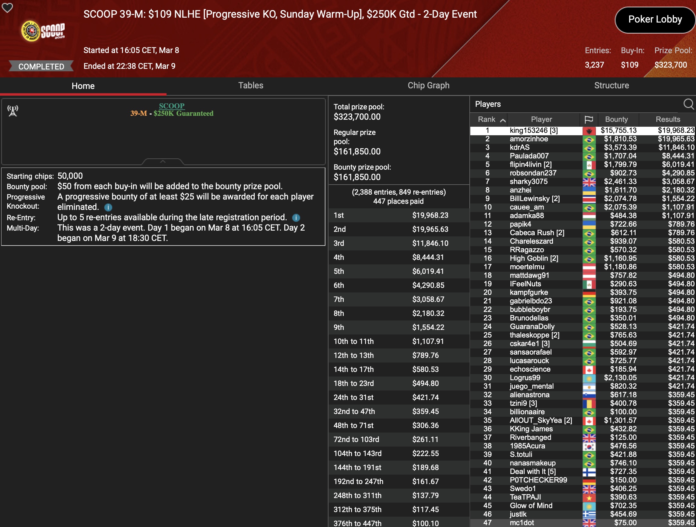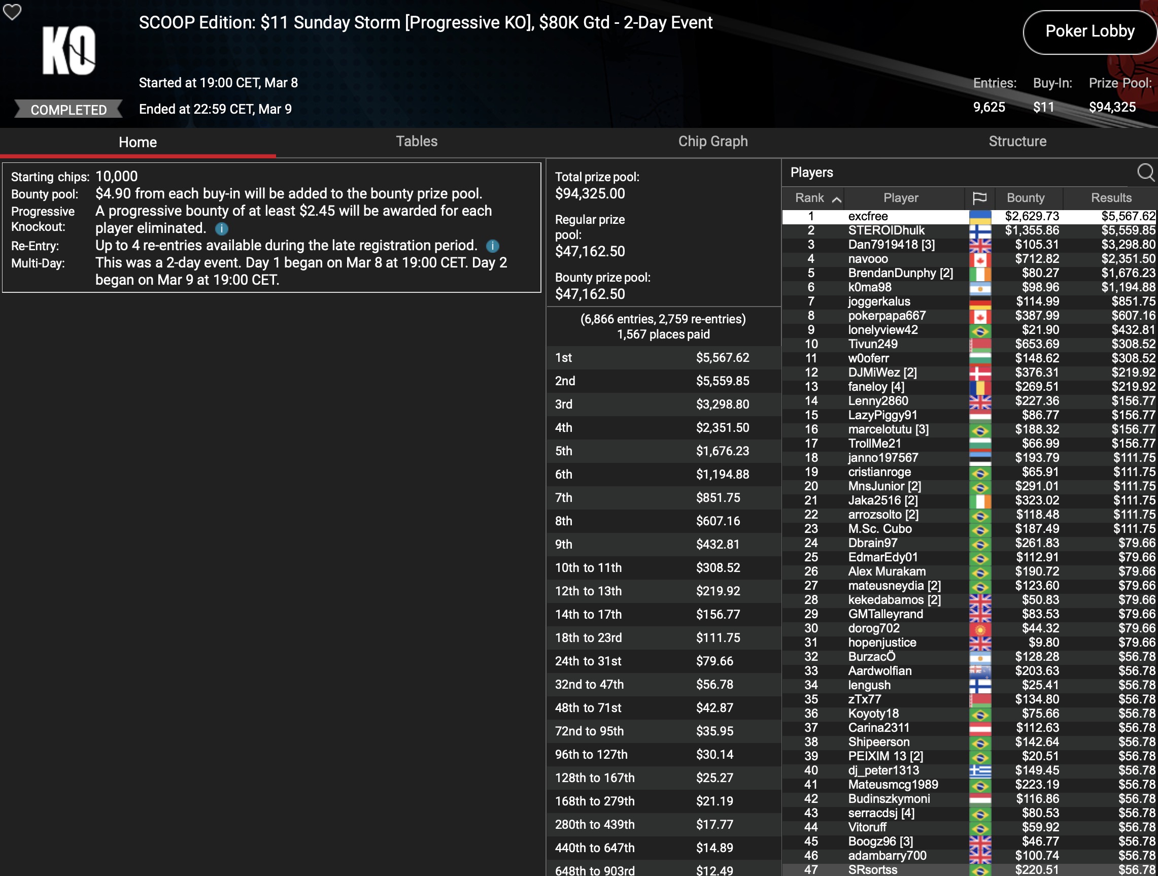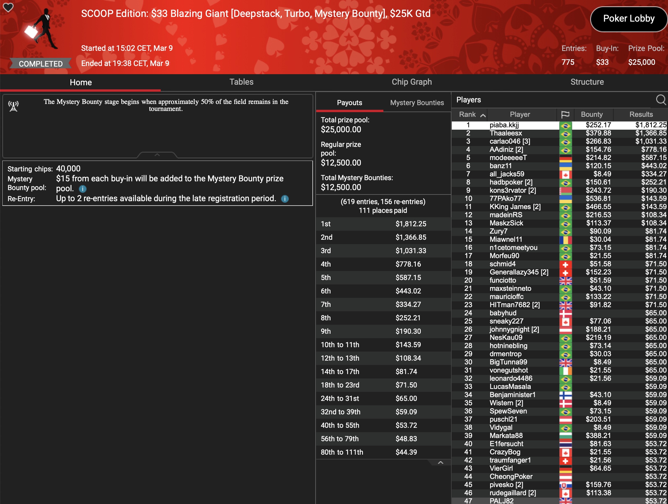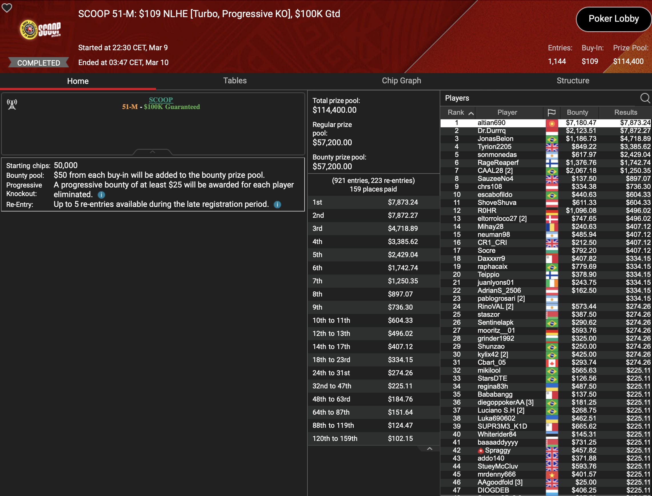 141 der 10.619 Entrys waren noch in den Finaltag des Signature Tournaments von PokerStars zurückgekehrt. Die größten PKO Bountys und Payouts aus dem $1.061.900 Preispool sollten noch auf sie warten. Als Chipleader war die Baumschlange aus Deutschland ins Finale gegangen, was sicher eine hervorragende Ausgangsposition war, bei dieser Spieleranzahl aber nichts heißen musste. Doch der MTT-Spezialist schlängelte sich bis zum Final Table, wo er auf weitere deutschsprachige Spieler traf. Die mussten allerdings als erste den FT verlassen: „hocka66“ (AUT) wurde für $4.817+$2.287 Neunter, für „Ronnysuper“ stand nach einer Super-Leistung Platz 8 mit $6.767+$2.087 Payout zu Buche. Die Baumschlange ließ Gegner-um-Gegner hinter sich und kroch bis ins 3-handed-Play. Dort war die Sunday Million für den deutschen MTT-Crusher dann beendet, was sich mit $41.214+$8.006 für ihn bezahlt machte. Den Vortritt musste er lediglich einem „PokerHorst“ aus Malta und dem Champion der Sunday Million, „nomalice“ lassen, der $55.212+$30.384 dafür einsammelte.
