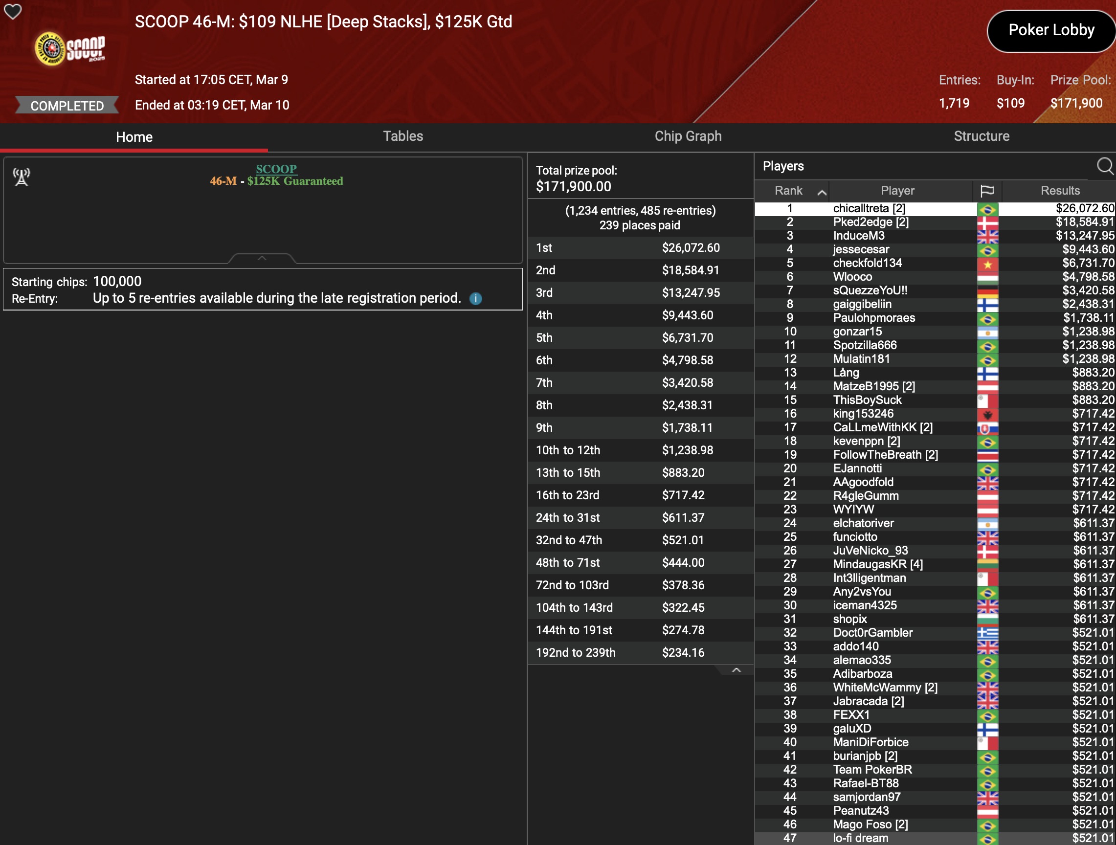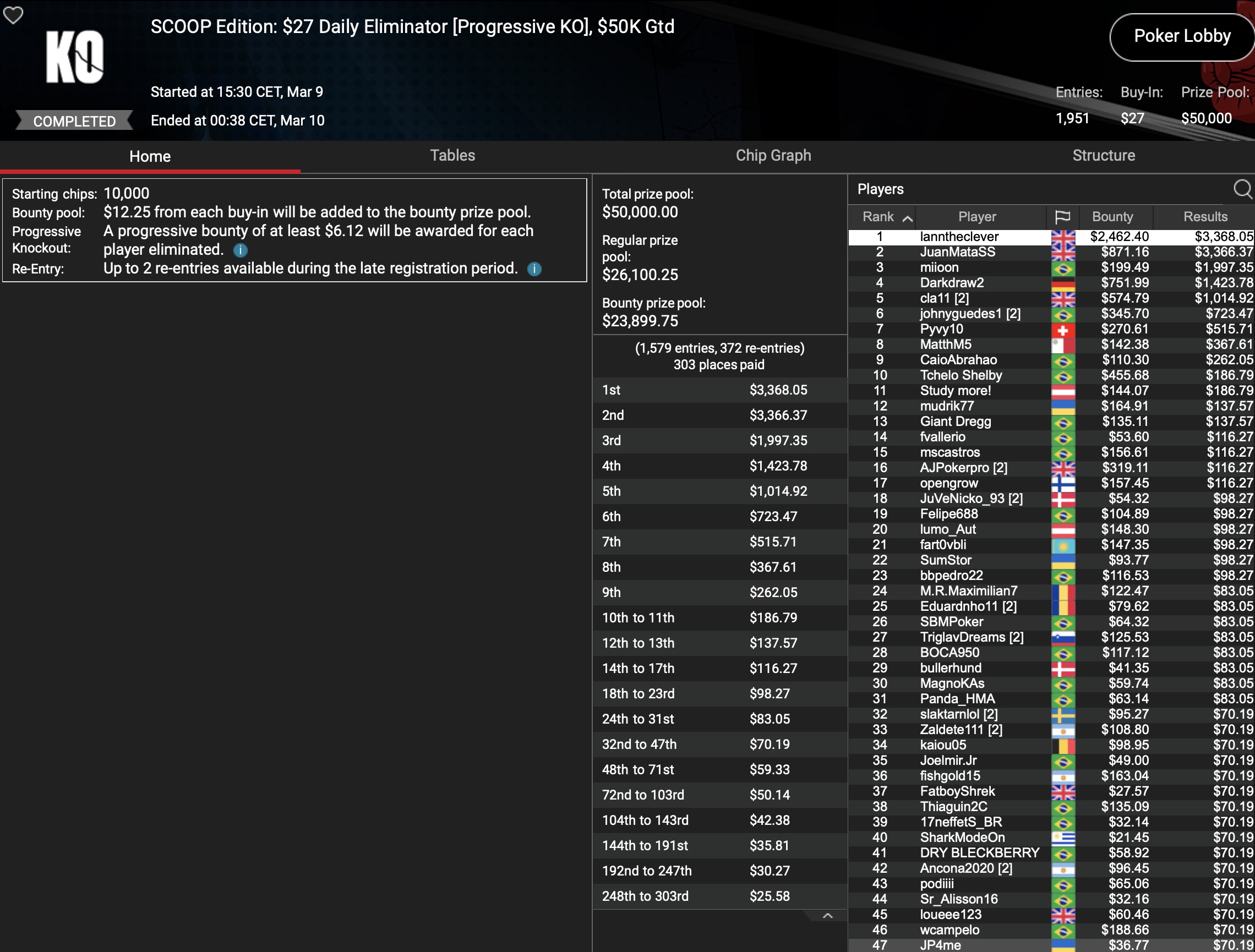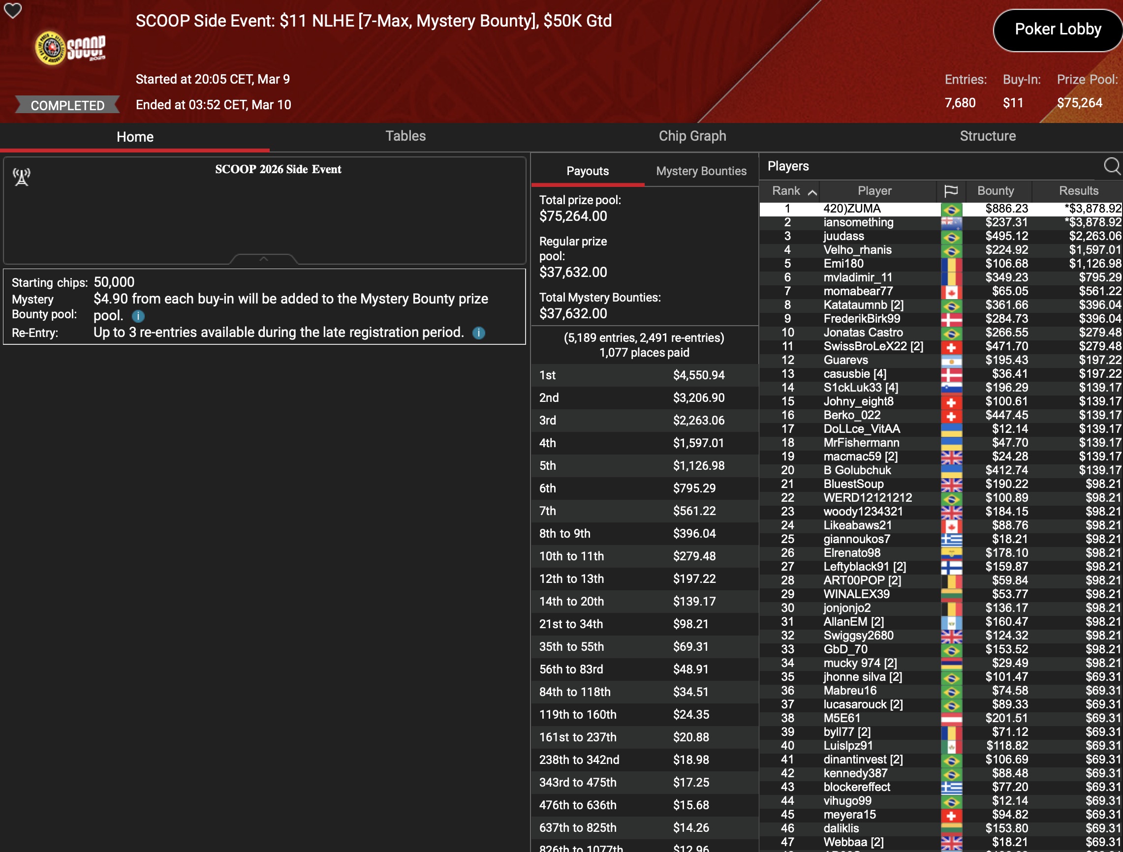 Im selben Event musste der Österreicher „aufzuckerter“ dem Briten im Heads-Up den Vortritt lassen, womit $15.778 Runner-Up Prämie auf ihn warteten. Ein weiteres D-A-CH-Podium gab es durch „polaris“ im $22 Deep Stacks, was mit $7.608 belohnt wurde. Im $530 HORSE hielt „LarryRudex“ die DACH-Ehre bis ins 3-handed-Play aufrecht und cashte dafür $5.012. Und was wäre ein Grind-Tag ohne eine Top-Platzierung von „HardiZ1“. Die holte der Deutsche als 3. im $1.050 NLHE Turbo PKO, zusammen mit $6.202+$500 für die PokerStars-Bankroll. Richtig Tamtam machte „TamTam93AT“ im $22 NLHE Turbo, wo Platz 3 mit $3.643 belohnt wurde. Und auch der deutsche HighRoller „assel007“ fuhr als Runner-Up $109 NLHE Turbo ein Top-Resultat und dabei $8.244.
