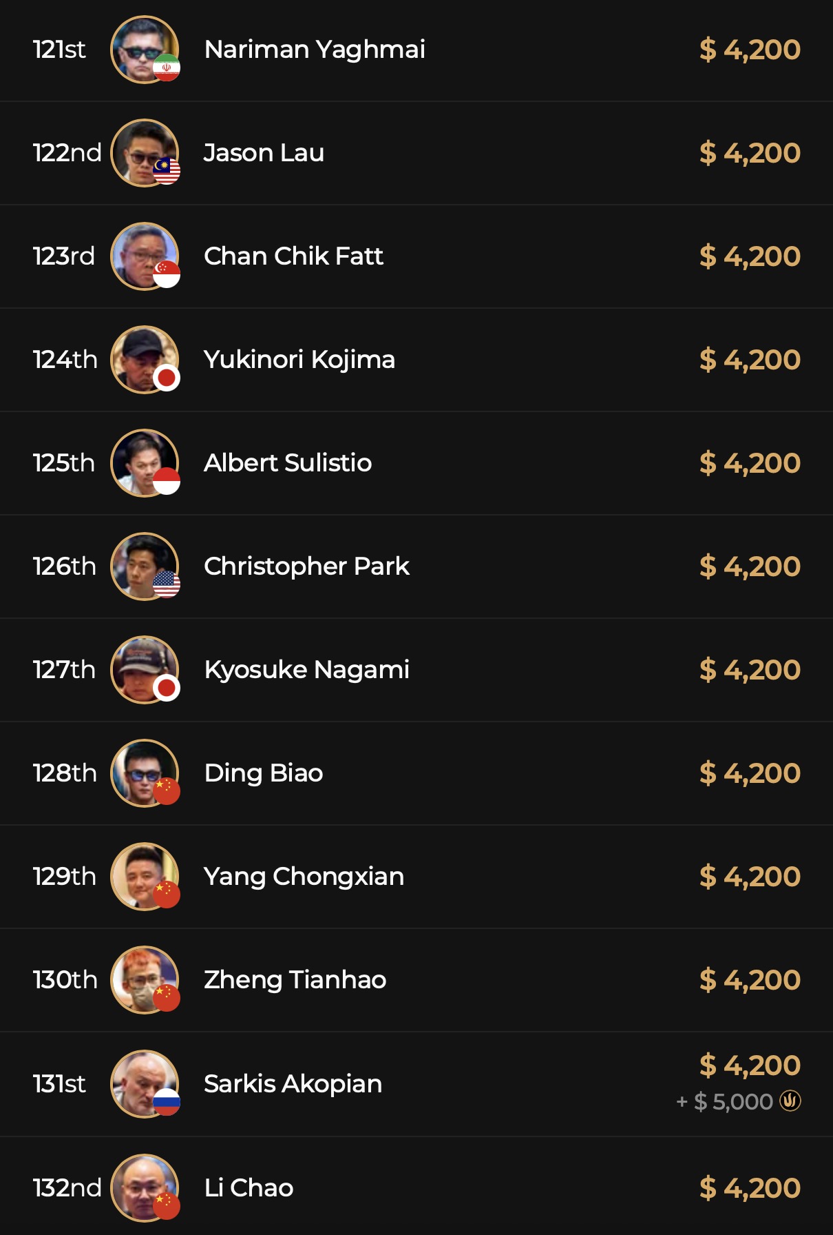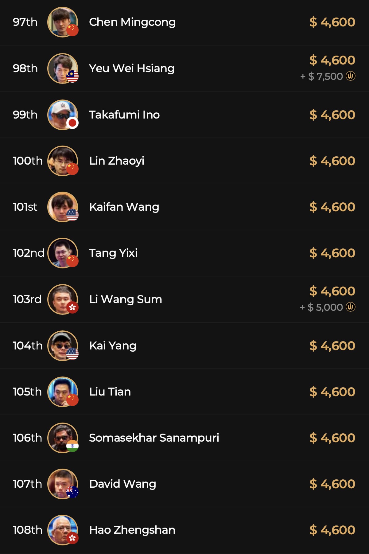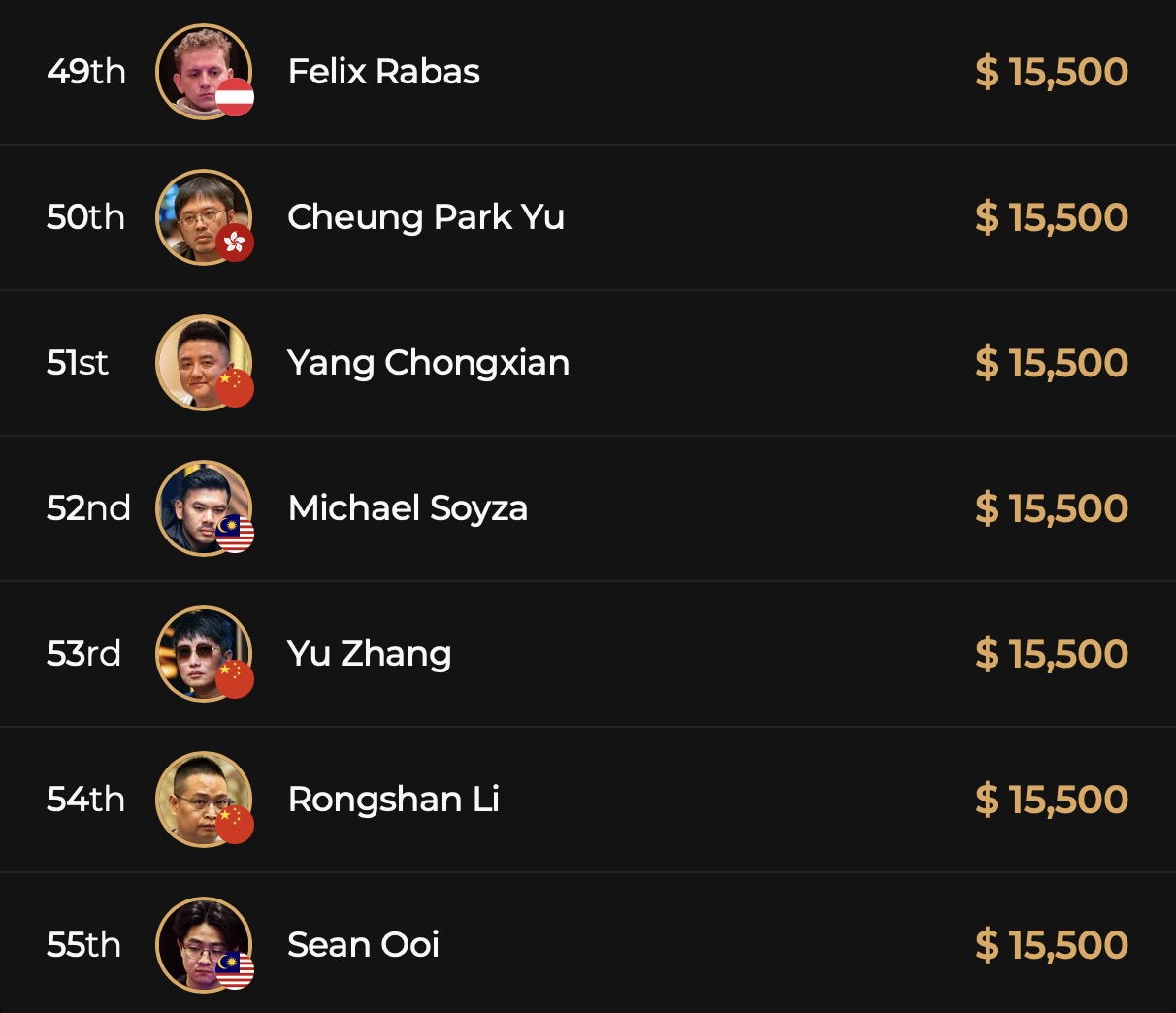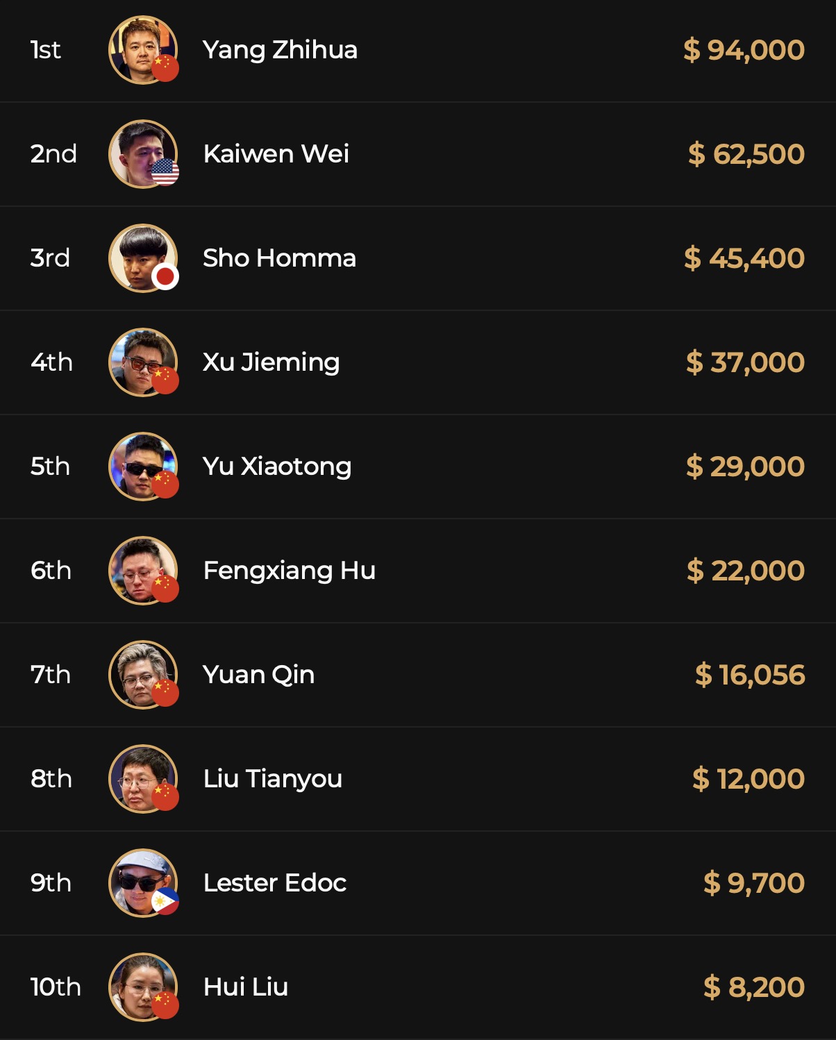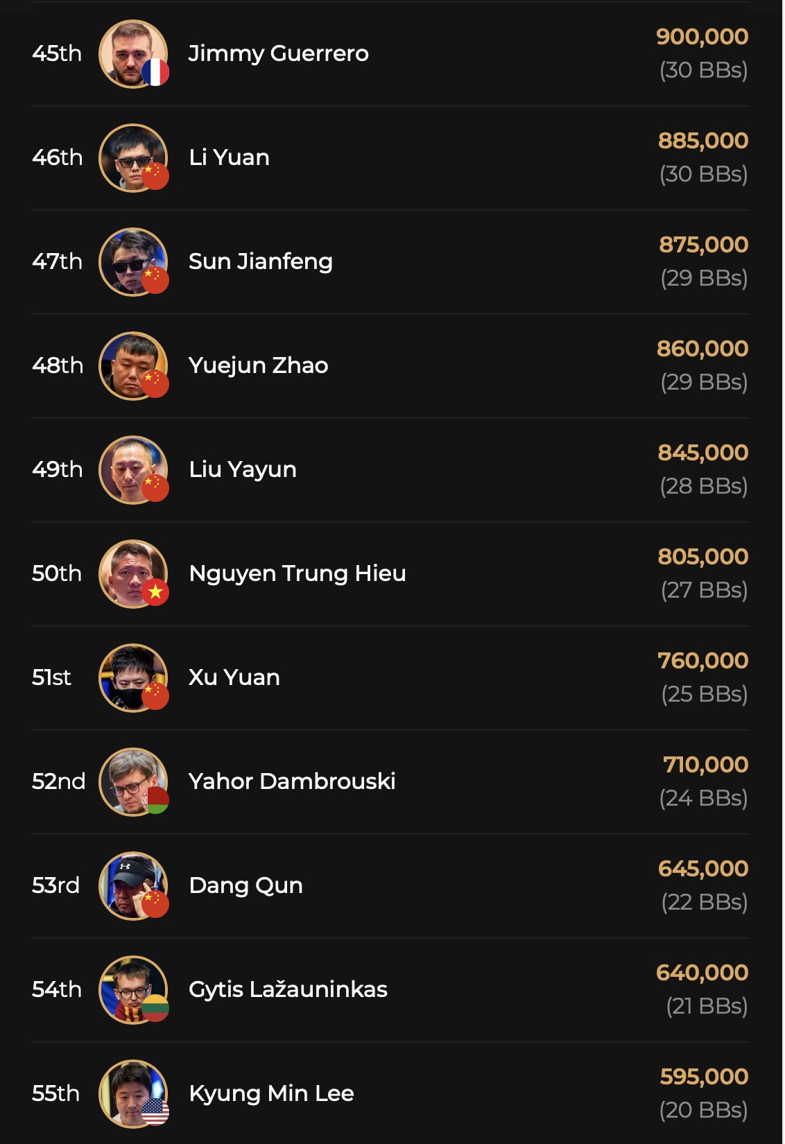 Mehr Anmeldungen als im PLO gab es dann erwartungsgemäß wieder im NLH beim $2k One Night Event. 253 Anmeldungen bedeutetem $468.556 im Preispool, in dem die besten 39 landeten. Daraus sollten $94.000 am Ende in den Händen des Chinesen Yang Zhihua landen, genauso wie die Dreizack-Trophäe.