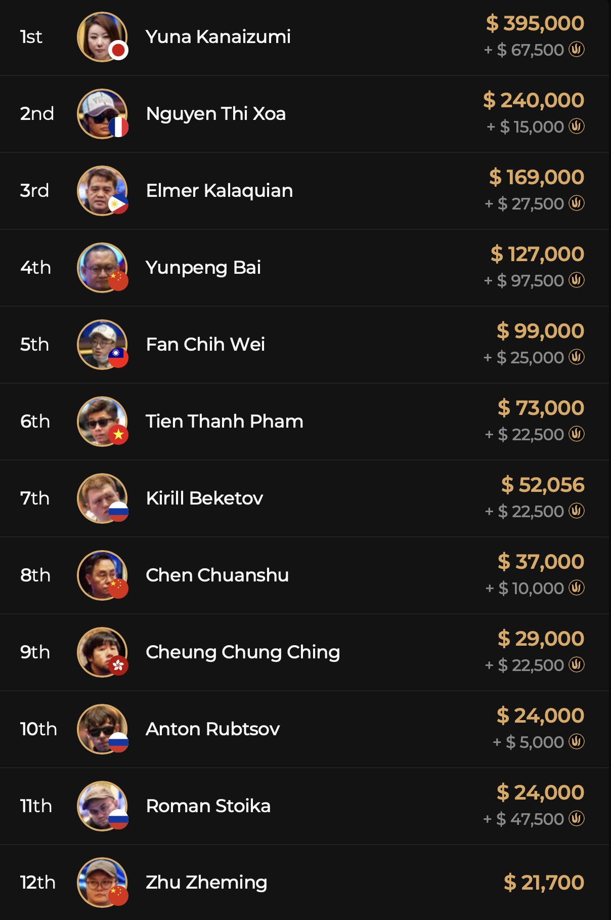 Das $5k NLH Mystery Bounty Event hielt gleich zwei erfreuliche Überraschungen parat! Unter 836 Entrys und 416 Re-Entrys setzte sich in ihrem allersten Triton Event die Japanerin Yuna Kanaizumi gegen die zahlenmäßig und spielstarke Konkurrenz durch. Mit nur 14 BBs war sie als zweitkürzester Stack an den Finaltisch gekommen, an dem sie dann erfolgreich eine Aufholjagd startete. Die wurde mit der ikonischen Triton Trophy, $395.000 Siegprämie und $67.500 an Mystery Bountys belohnt.