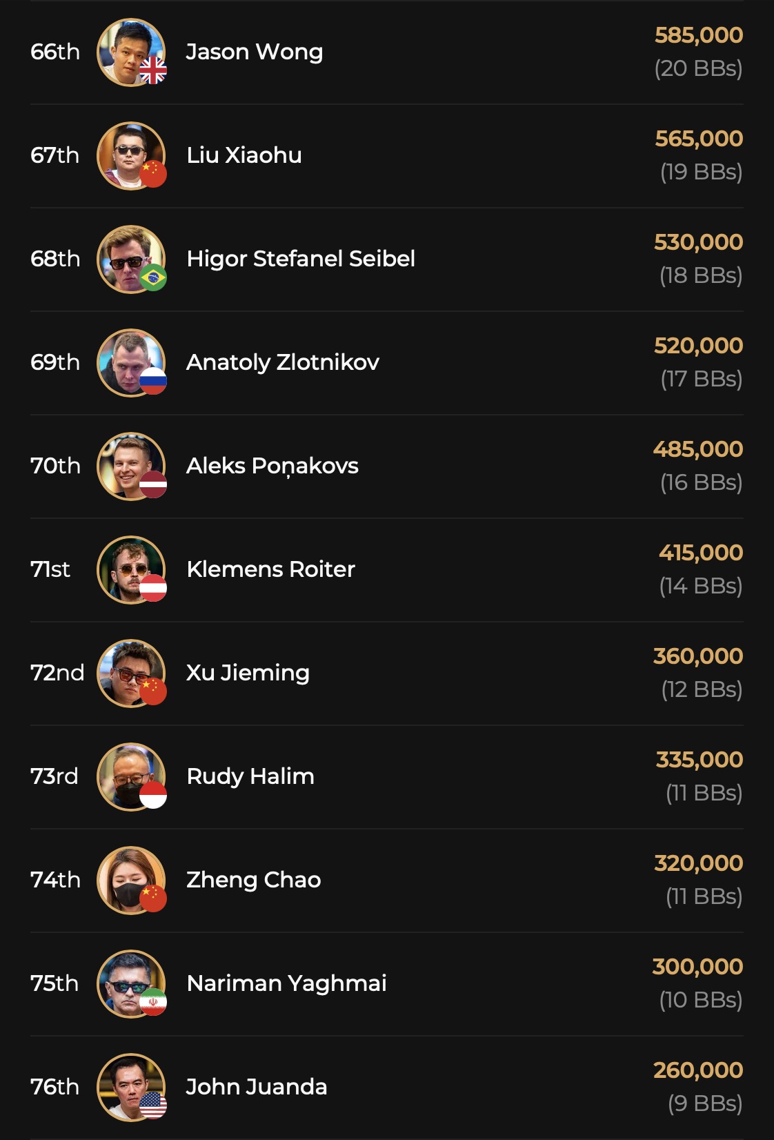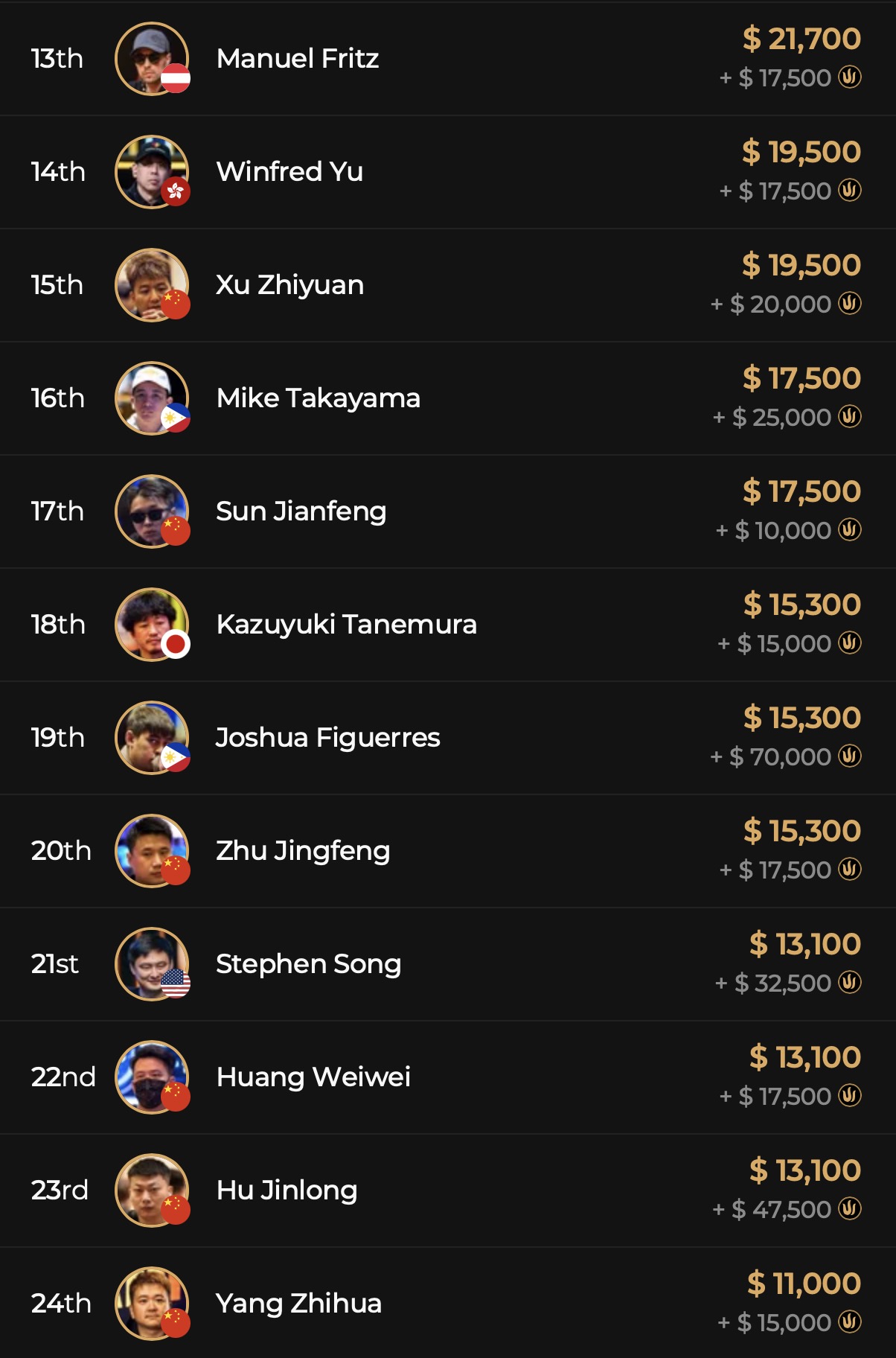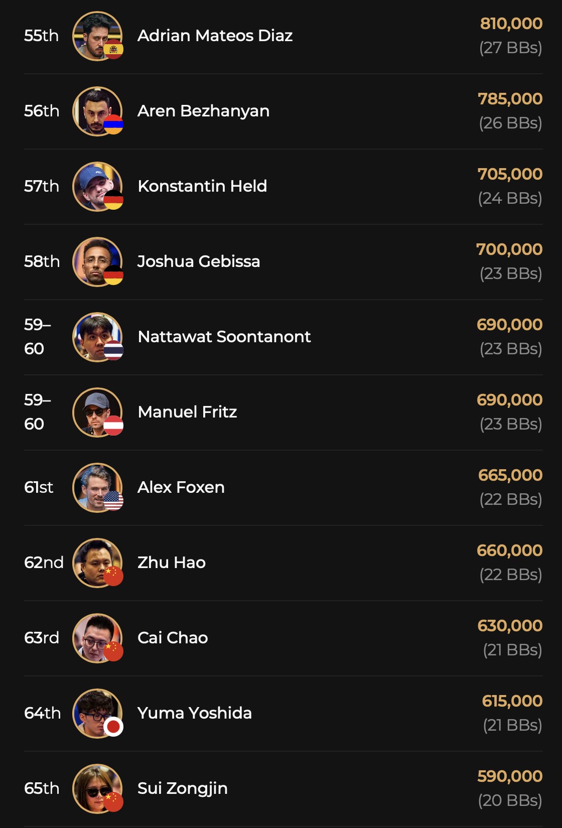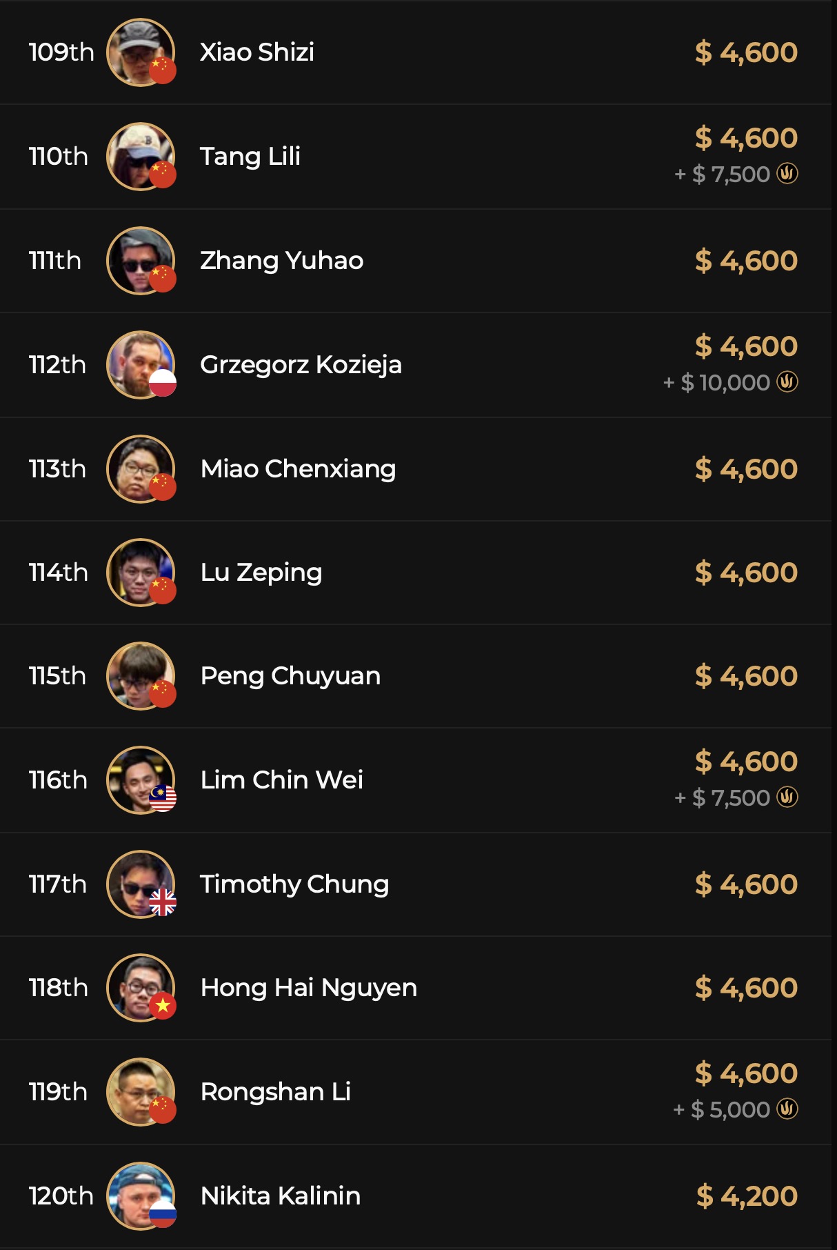 Für die zweite Überraschung sorgte der Deutsche Erik Eisen, der auf Rang 66 zwar „nur“ $6.100 kassierte, dafür beim Ziehen der Mystery Bountys unschlagbar war. Die Top Mystery Bounty in Höhe von $155.000 war in einem seiner gezogenen Umschläge. Insgesamt erhielt Eisen zu seinem Preisgeld $187.500 an Mystery Bountys hinzu!