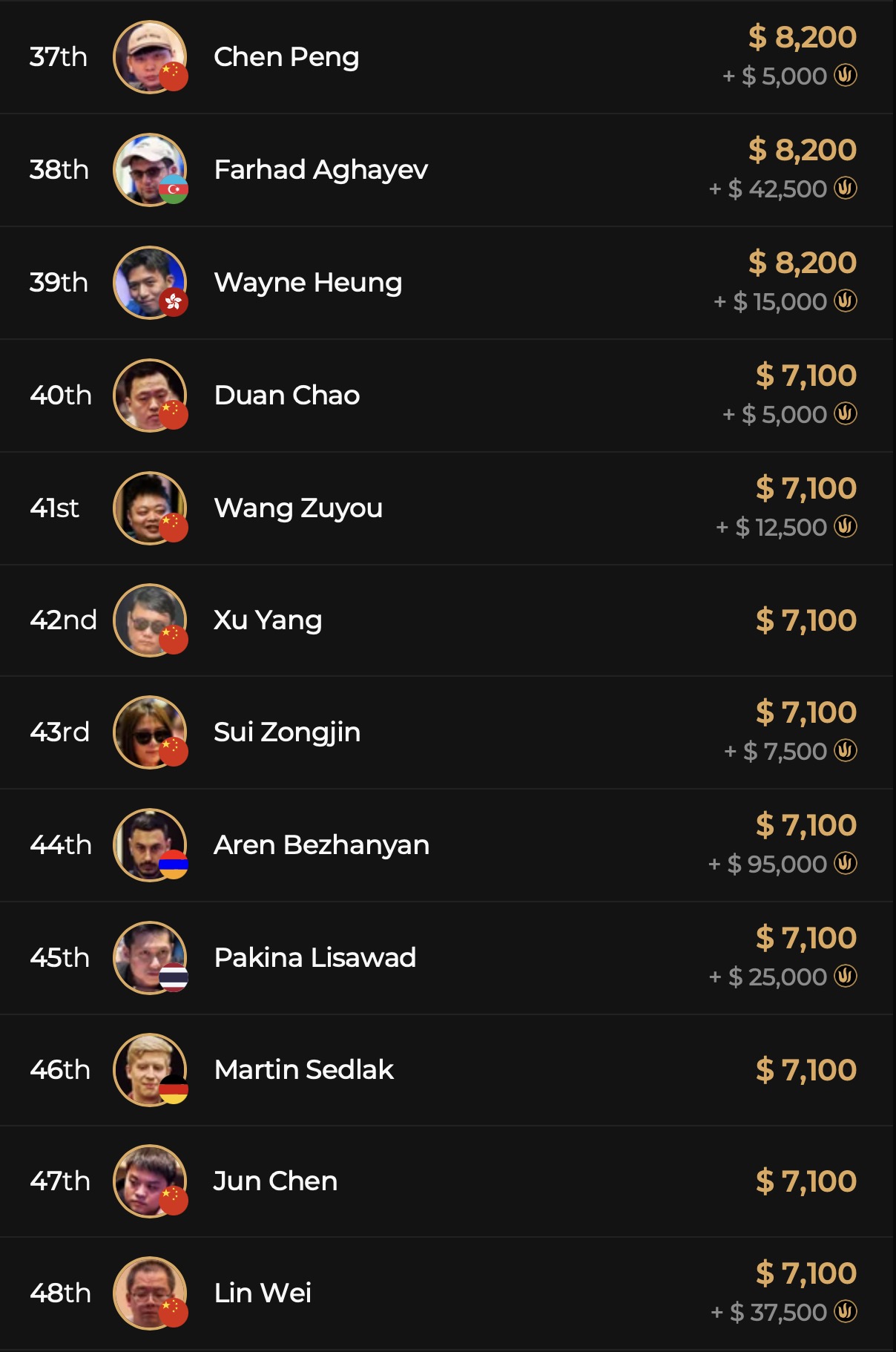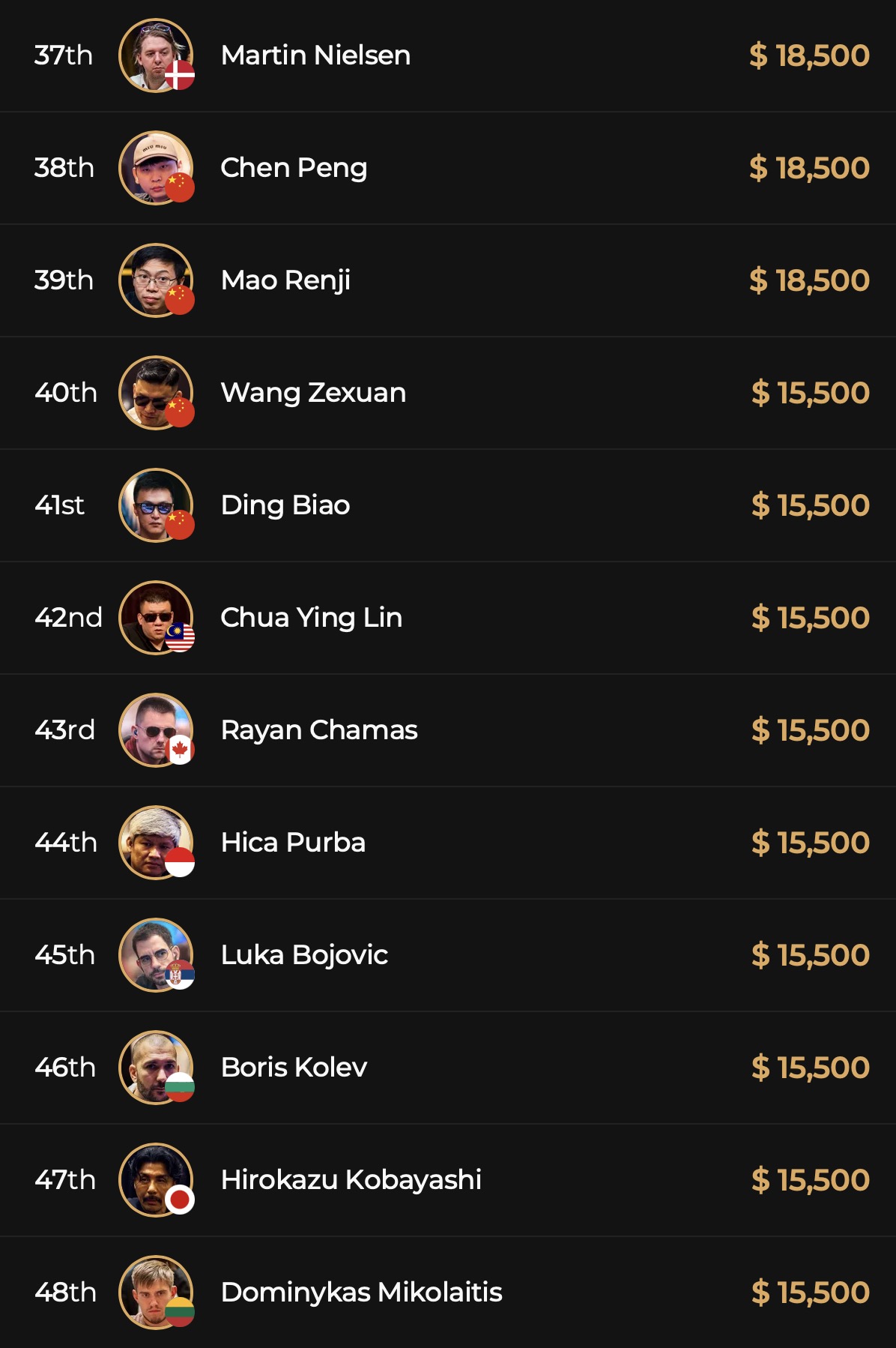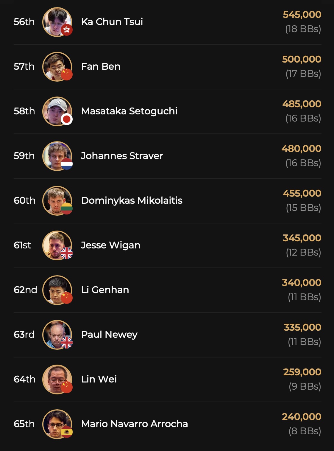 Für die zweite Überraschung sorgte der Deutsche Erik Eisen, der auf Rang 66 zwar „nur“ $6.100 kassierte, dafür beim Ziehen der Mystery Bountys unschlagbar war. Die Top Mystery Bounty in Höhe von $155.000 war in einem seiner gezogenen Umschläge. Insgesamt erhielt Eisen zu seinem Preisgeld $187.500 an Mystery Bountys hinzu!