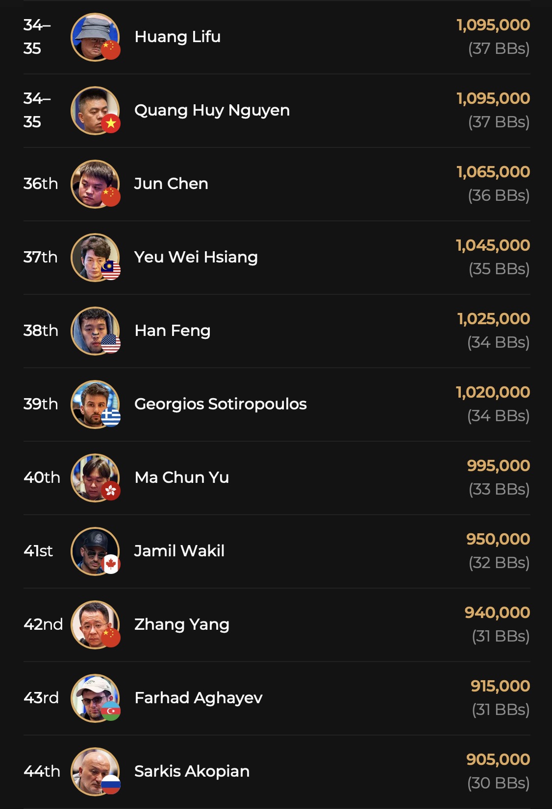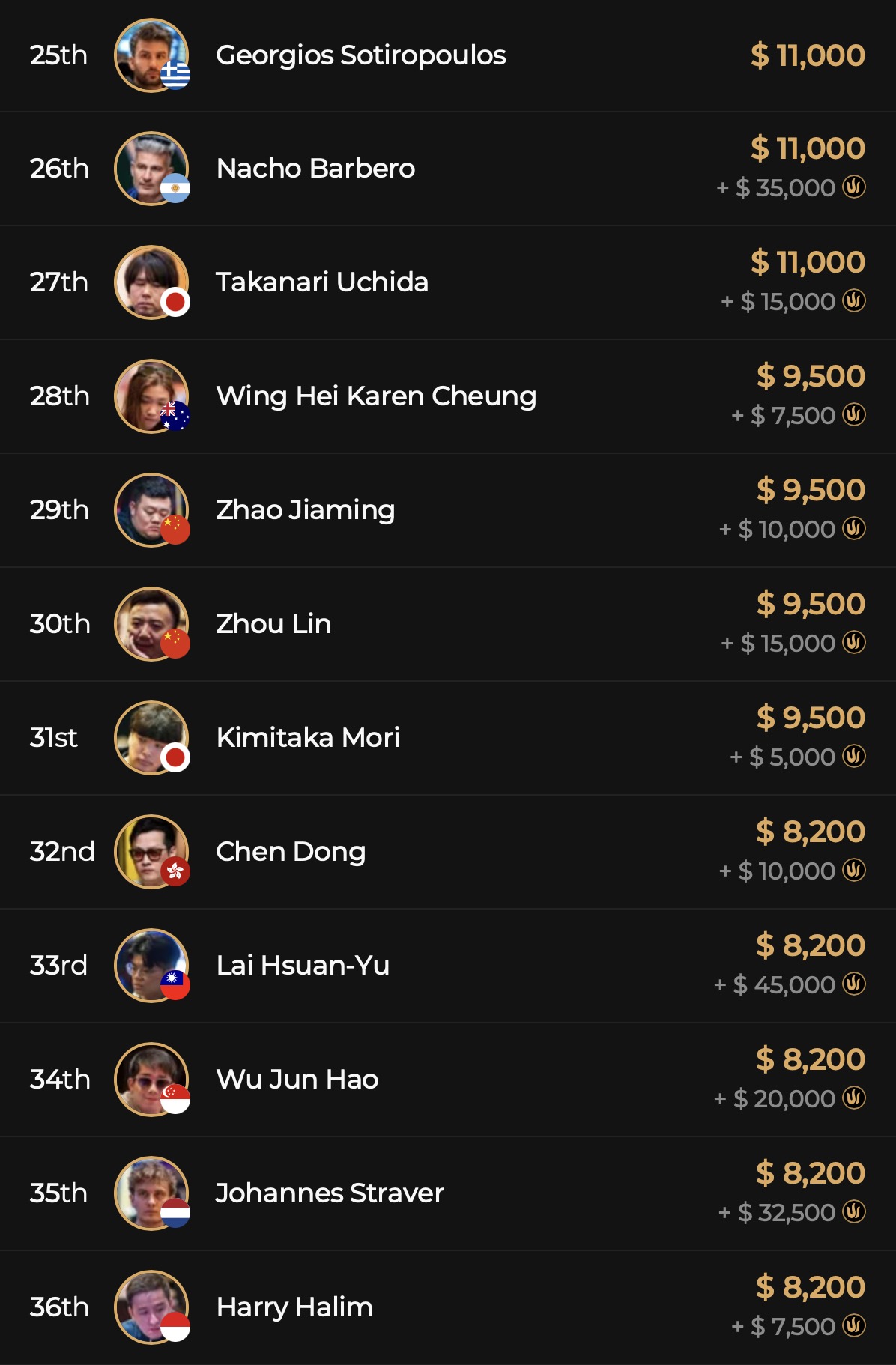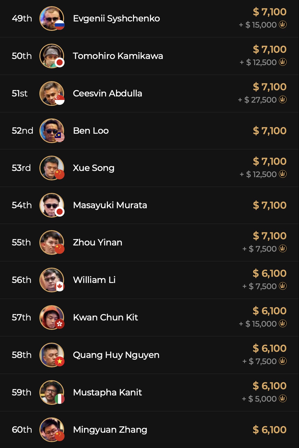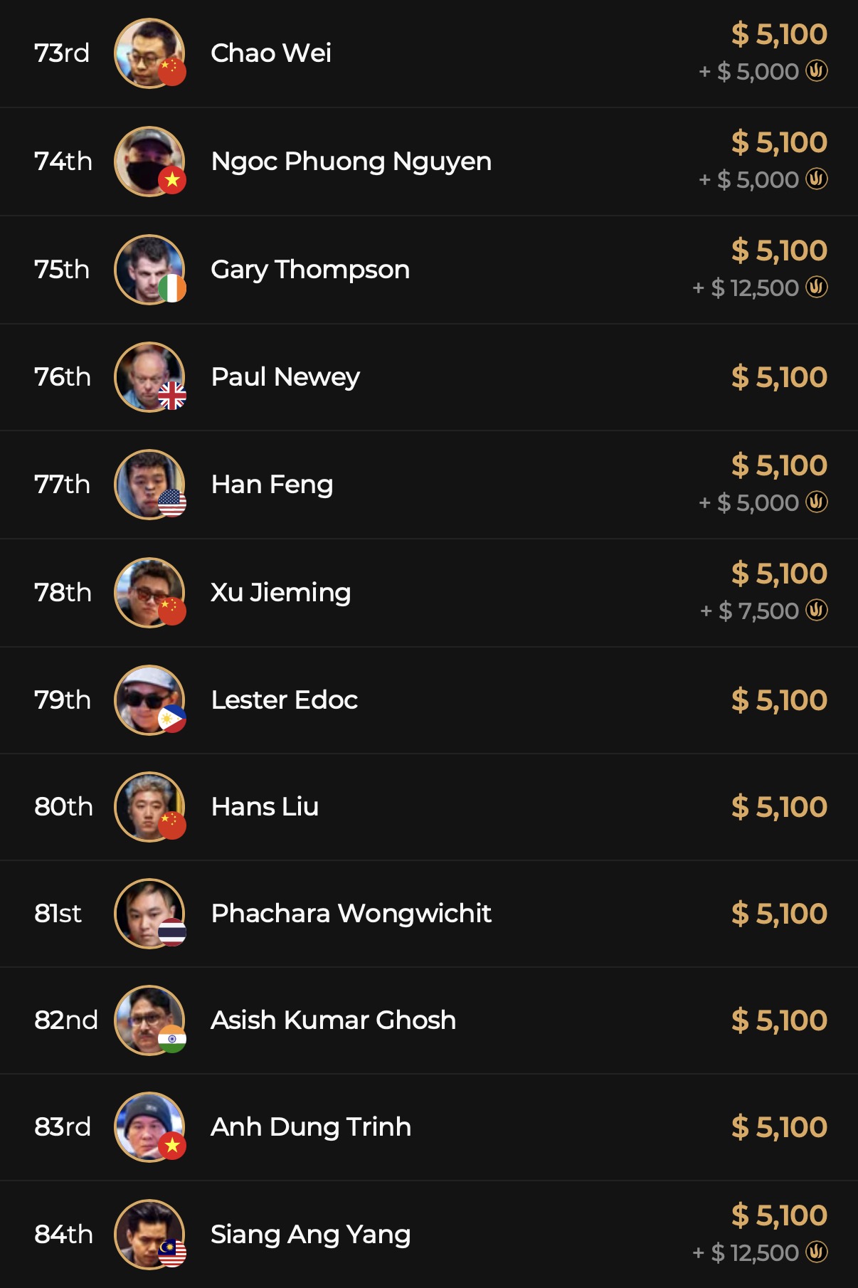 Für die zweite Überraschung sorgte der Deutsche Erik Eisen, der auf Rang 66 zwar „nur“ $6.100 kassierte, dafür beim Ziehen der Mystery Bountys unschlagbar war. Die Top Mystery Bounty in Höhe von $155.000 war in einem seiner gezogenen Umschläge. Insgesamt erhielt Eisen zu seinem Preisgeld $187.500 an Mystery Bountys hinzu!
