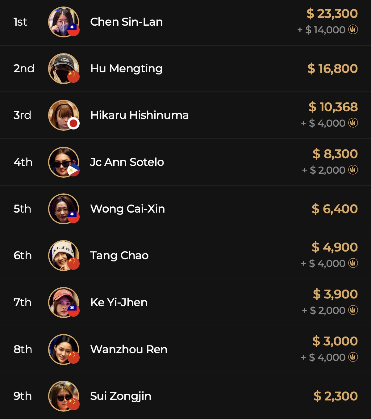 Die Pokerturniere in Asien haben im Vergleich zu den europäischen eine deutlich höhere Frauenquote. Und auch im Triton ONE Turnierplan finden Women’s Events (ONE-W) deutlich mehr Platz als in den Schedules anderer Turnierserien. Im $2k ONE-W Night Bounty Quattro fiel bereits die zweite Entscheidung in einem Ladies Event bei der derzeitigen T1 Series in Jeju. 59 Entrys generierten hier einen Preispool von $109.268, der am Finaltisch unter den besten 9 aufgeteilt werden sollte. den Löwinnenanteil daraus samt Triton Trophy sichert sich Chen Sin-Lan. Die Taiwanesin erspielte sich $23.300 aus dem regulären und für 7 Kopfgelder noch weitere $14.000 aus dem Bounty Pool.