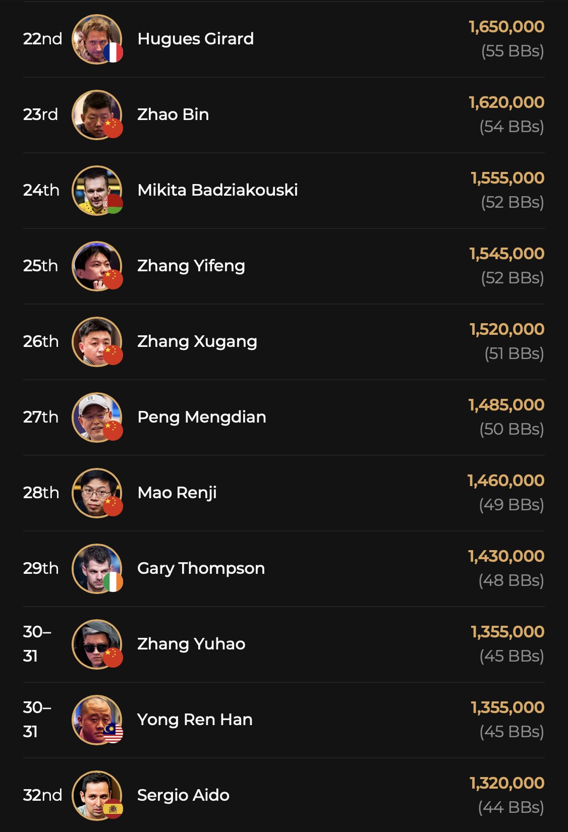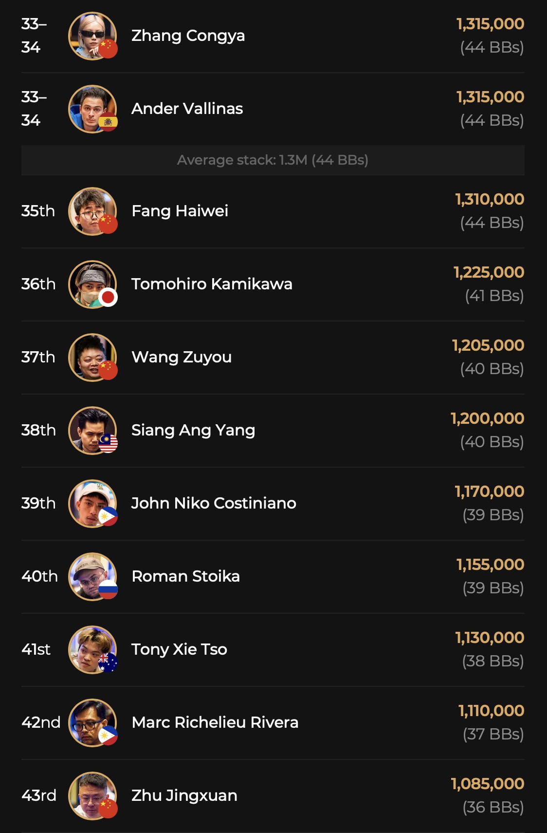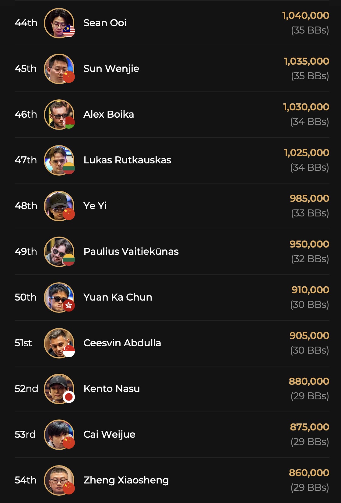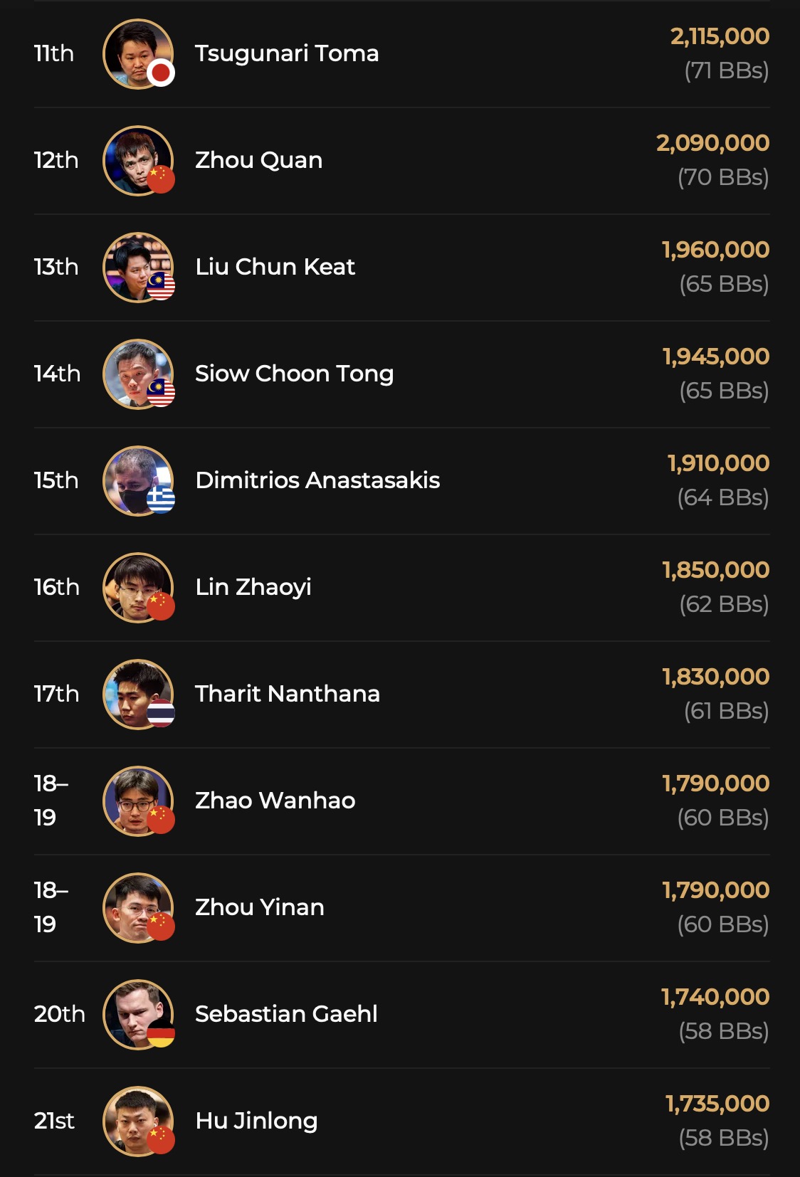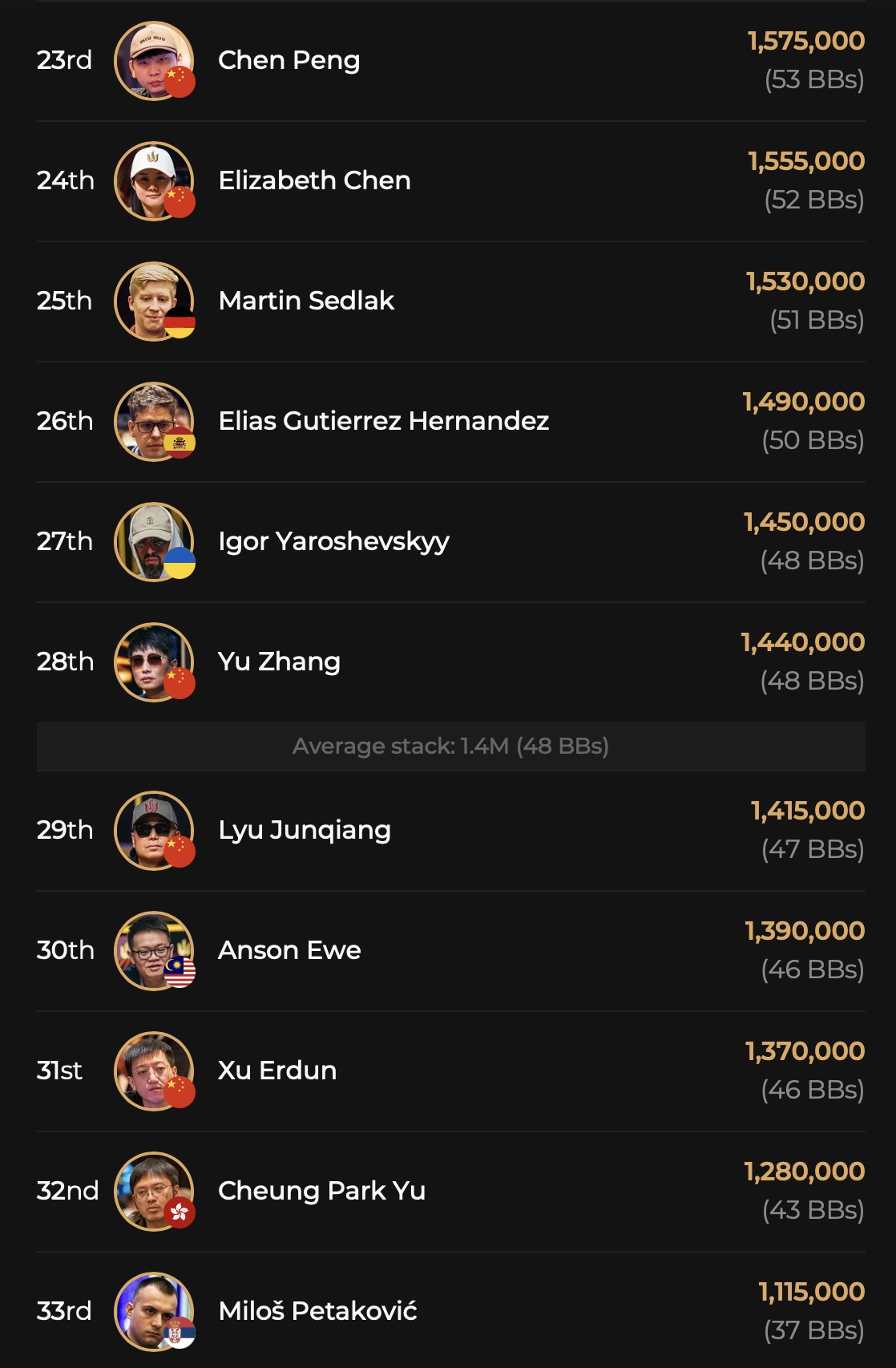 Neben den Entscheidungen in den Side Events wurde auch das $8k T1 Main Event gestartet. Nach der bisherigen Flaute an Top-Resultaten für die D-A-CH-L-Community konnte hier Felix Rabas aus Österreich ein Zeichen setzen und sich unter 374 Entrys als Vierter von 65 Qualifikanten mit 107 Big Blinds für Tag 2 qualifizieren. Neben dem Österreicher schaffte auch Martin Sedlak als 25. im Zwischenklassement mit 51 BBs den Cut. Ganz vorn platzierte sich mit 176 BBs der Chinese Renjie Ding, der als Sieger von Event#2 seinen Lauf anscheinend ins Main Event mitgenommen hat.