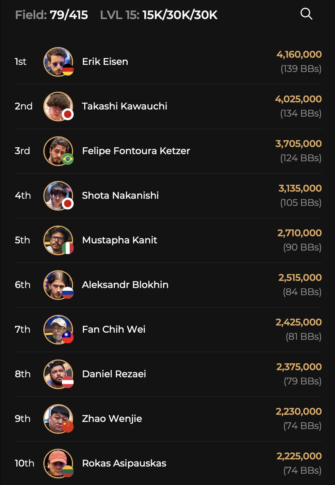 Den Lauf mitgenommen hat ganz Augenscheinlich auch Erik Eisen. Der Deutsche zeigt, dass er nicht nur gut mit Bounty-Umschlägen, sondern nicht weniger gut auch mit Chips und Karten umgehen kann. Von den 415 Entrys war Eisen in Flight 1B niemand gewachsen. Unter den 79 Überlebenden konnte er mit 139 BBs den größten Stack eintüten. Neben dem Tag-1B-Chipleader kamen 6 weitere Tag-2-Qualifikanten aus deutschsprachigen Ländern: Daniel Rezaei (AUT, 79 BBs), Sebastian Gaehl (GER, 58 BBs), Konstantin Held (GER, 24 BBs), Joshua Gebissa (GER, 23 BBs), Manuel Fritz (AUT, 23 BBs) und Klemens Roiter (AUT, 14 BBs) werden wir auf jeden Fall an Tag 2 wiedersehen.