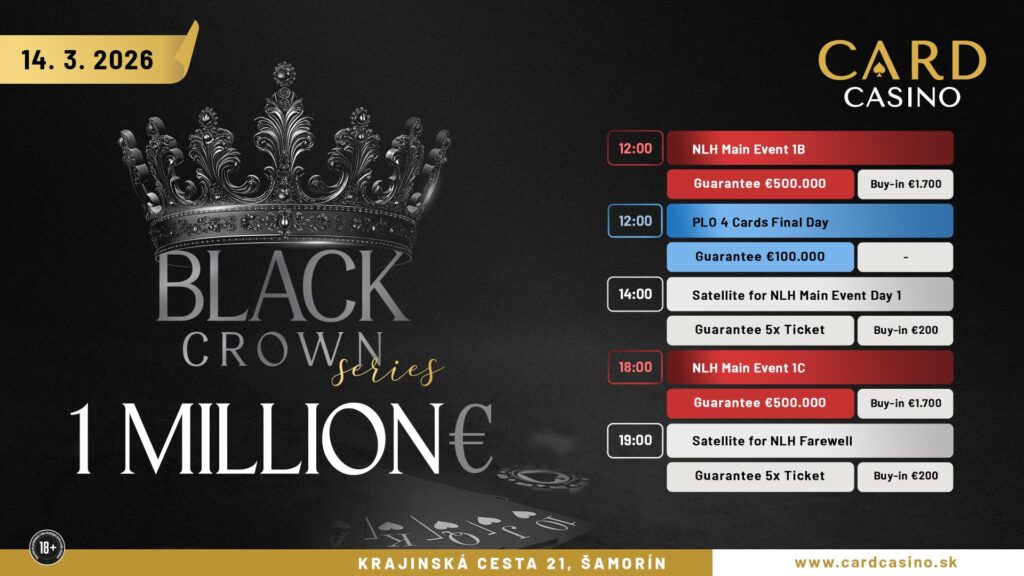 Bei der Black Crown Series im Card Casino Samorin (vormals Card Casino Bratislava) wurden am Freitag parallel 3 BCS Events gespielt. Während im €100.000 gtd. PLO 4 Cards bereits Tag 1B gespielt wurde, fiel im €500.000 gtd. Main Event der Black Crown Series der Startschuss zum Main Event Tag 1A. Das Hauptaugenmerk lag jedoch auf der Entscheidung im €100.000 gtd. Warm-Up, wo 13 Finalisten um den garantierten €100.000 Preispool spielten.