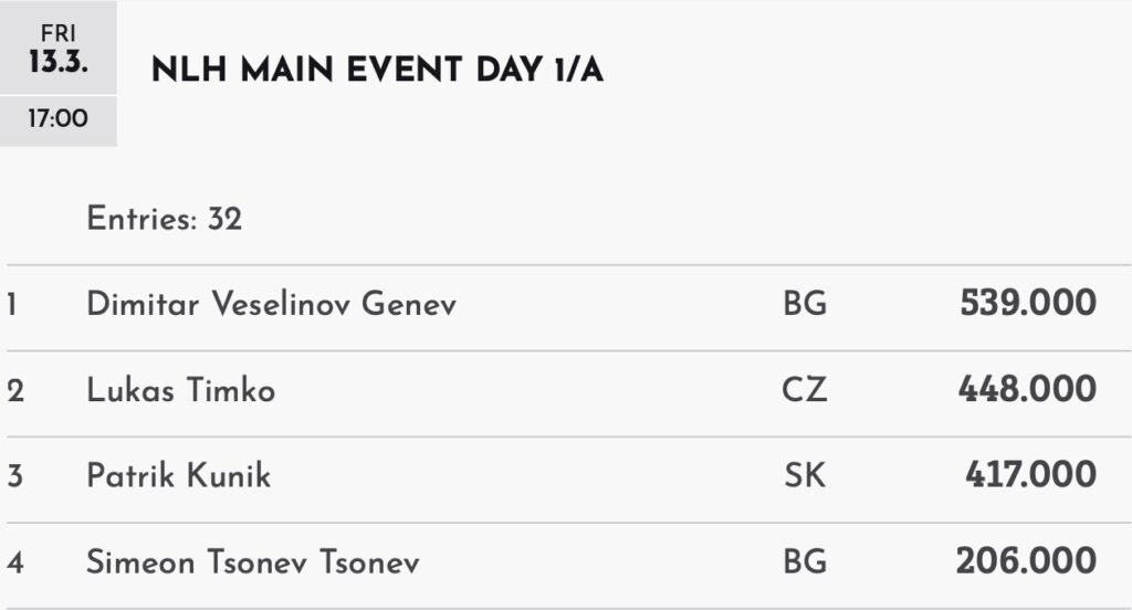 Am Ende des Spieltages sollten 4 Spieler Chips für das Finale (SO, 15:00 Uhr) eintüten können. Neben Simeon Tsonev Tsonev aus Bulgarien, waren das Patrik Kunik aus der Slowakei und Lukas Timko aus Tschechien, sowie der Tag1A-Chipleader Dimitar Genev. Der Bulgare wird den Finaltag mit 539.000 Chips beginnen, die er aus seinem 50.000er Starting Stack gemacht hat.