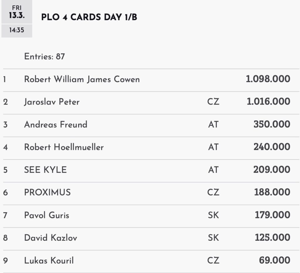 Von den 87 1B-Entrys sollten 9 den Sprung in den Finaltag (heute, 12:00 Uhr)schaffen. Hinter dem britischen Tag-1B-Chipleader Robert Cowen (1.098.000) belegten der Tscheche Jaroslav Peter (1.016.000) und dahinter erfreulicherweise, wenn auch mit beträchtlichem Respektabstand, die beiden Österreicher Andreas Freund (350.000) und Robert Höllüller (240.000) die nächsten Plätze in der Tageswertung.