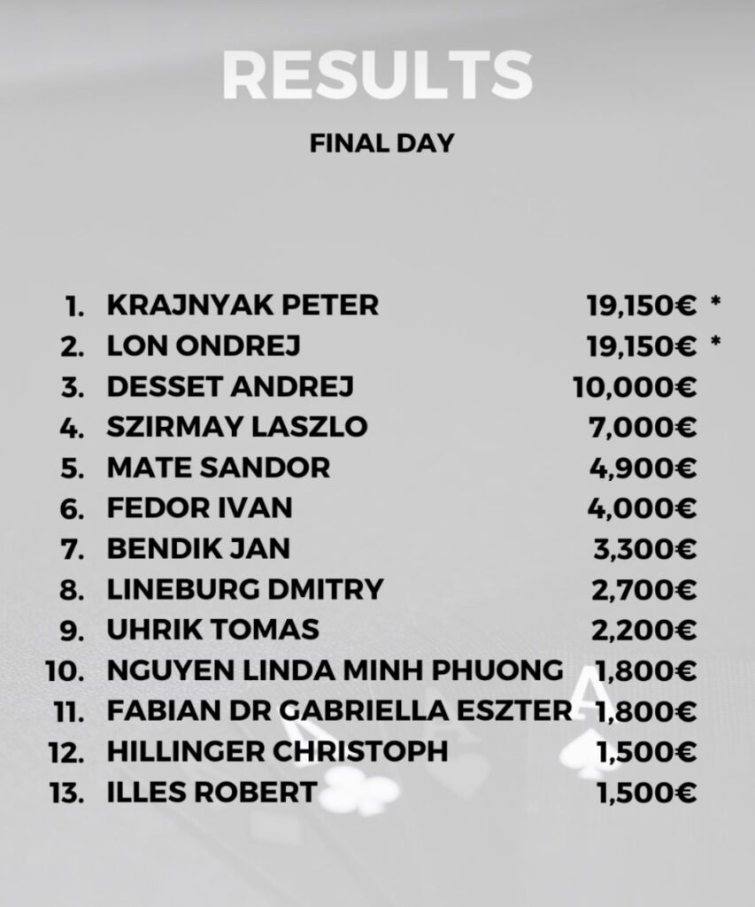 Am Finaltisch konnten einige CC-Regulars Platz nehmen, die von dort auch nicht so schnell wieder aufstanden. Der Local Hero Andrej Desset, die Nummer 4 der slowakischen All-Time Money List, landete auf dem 3. Rang (€10.000). Nach seinem Ausscheiden einigte sich das ungarisch-tschechische Duo auf einen Deal, und zwar auf einen zu gleichen Teilen. Während der tschechische CC-Reg unter dem Nickname „PROXIMUS“ offiziell Runner-Up wurde, ging der Titel samt Black Crown Series Trophy an den Ungarn Peter Krajnyak, der sich genau wie sein gegenüber laut Deal über €19.150 freuen konnte.