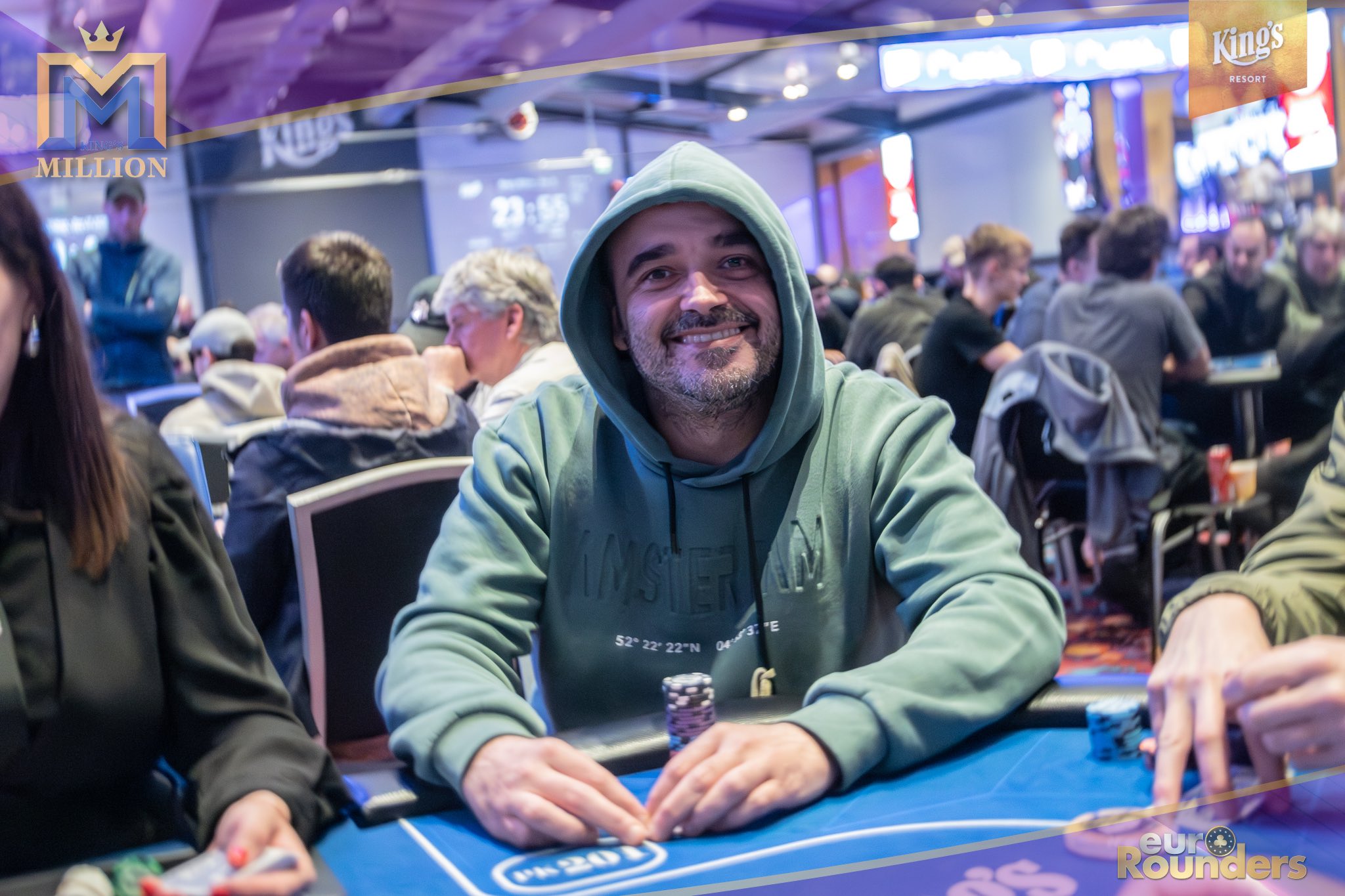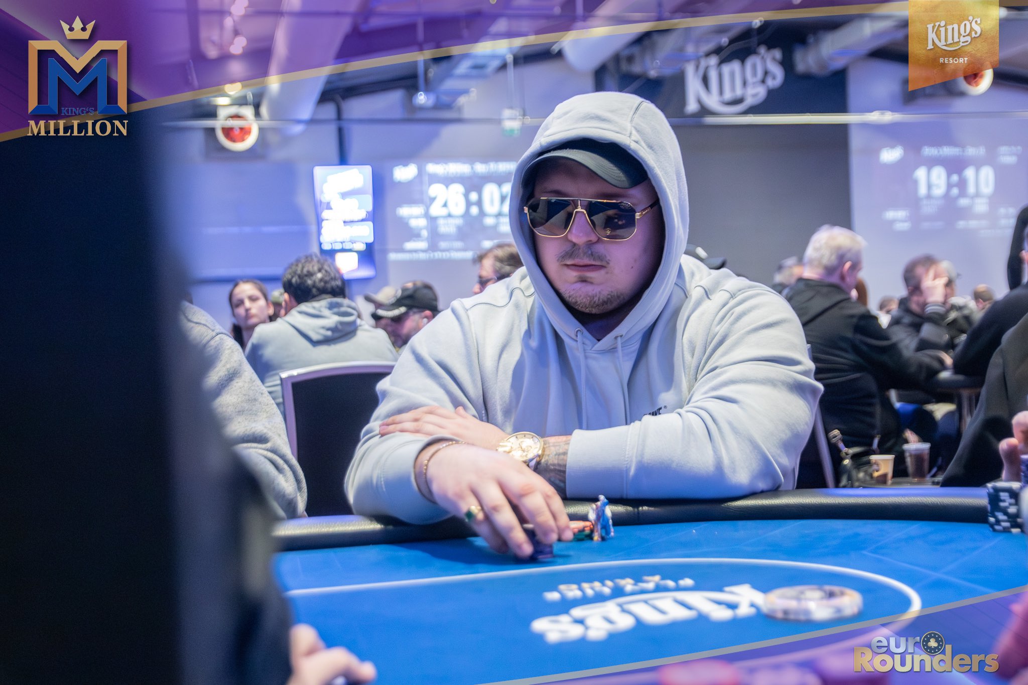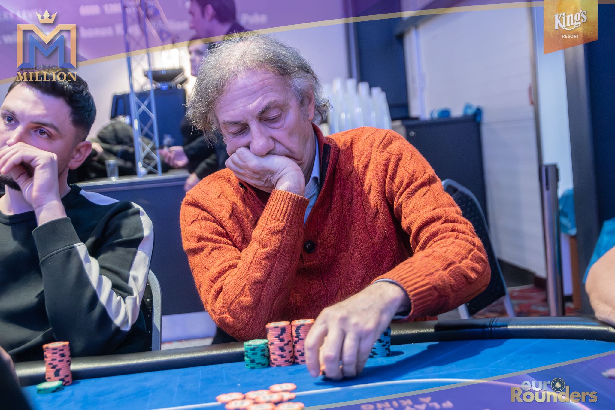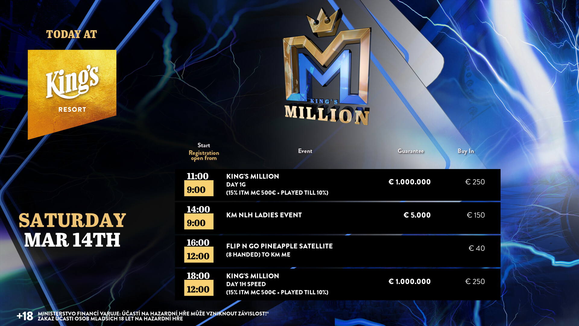 Die legendäre King’s Million mit der namensgebenden €1.000.000 Preispoolgarantie umfasst 11 Starttage (9 Flights 1A bis 1I in Rozvadov + 1 Flight in Prag + 1 Flip and Go) und insgesamt 4 Spieltage. Für das Buy-In von €250 erhält man 40.000 Starting Chips und 40 Minuten Spielzeit pro Blindlevel, 30 in den Speed Flights. An den Tagen 1A und 1B hatte man sogar die Möglichkeit 60-minütige Level zu spielen. Dort wurden die bis zum Level 8 in Part 1 getrennten Starttage dann in Part 2 zusammengelegt. Für die Top 5 von Tag 1AB Part 2 gab es fünf Chipleader-Bonus-Packages à €3.000. Ansonsten sind an jedem anderen regulären Spieltag €1.150 als Chipleader Bonus vorgesehen. 15% jedes Flights schaffen es mit €500 Min-Cash in-the-money. Danach wird ohne weiteres Hand-for-Hand-Play jeweils runter bis auf 10% der Flightteilnehmer*innen gespielt, die ihre Chips dann in Tag 2 mitnehmen. An Tag 2, 3 und am Finaltag sind die Blinds dann 60 Minuten lang. Für die Top-10 im Finale (DI, 14:00 Uhr) wird es dann noch jeweils ein €3.000 Package für die King’s Million European Poker Championship (KM EPC) geben.