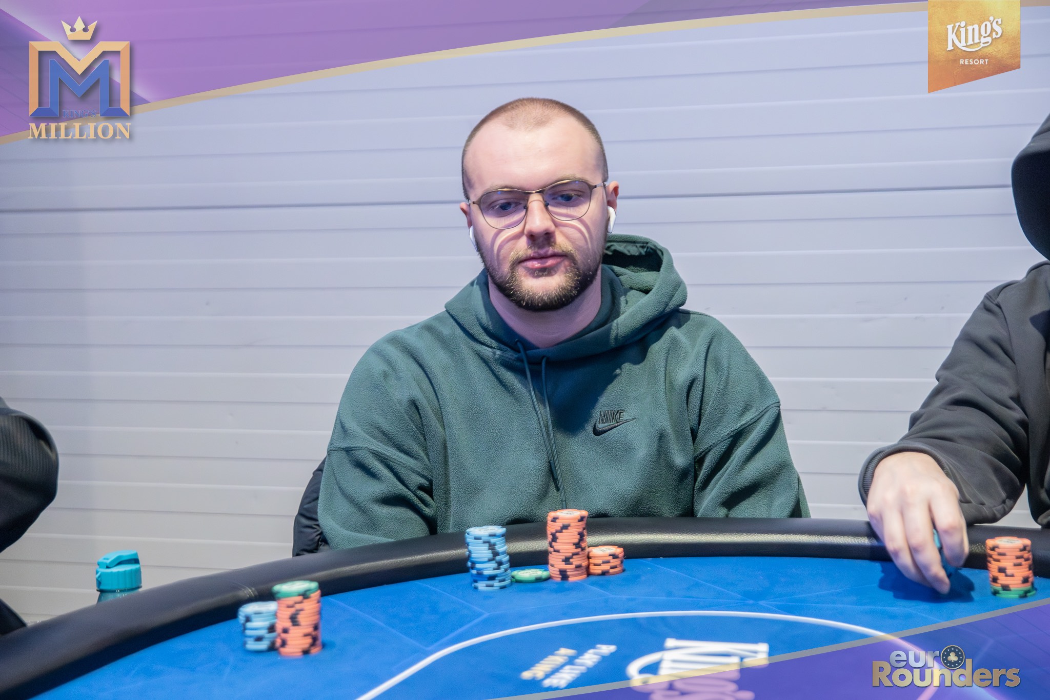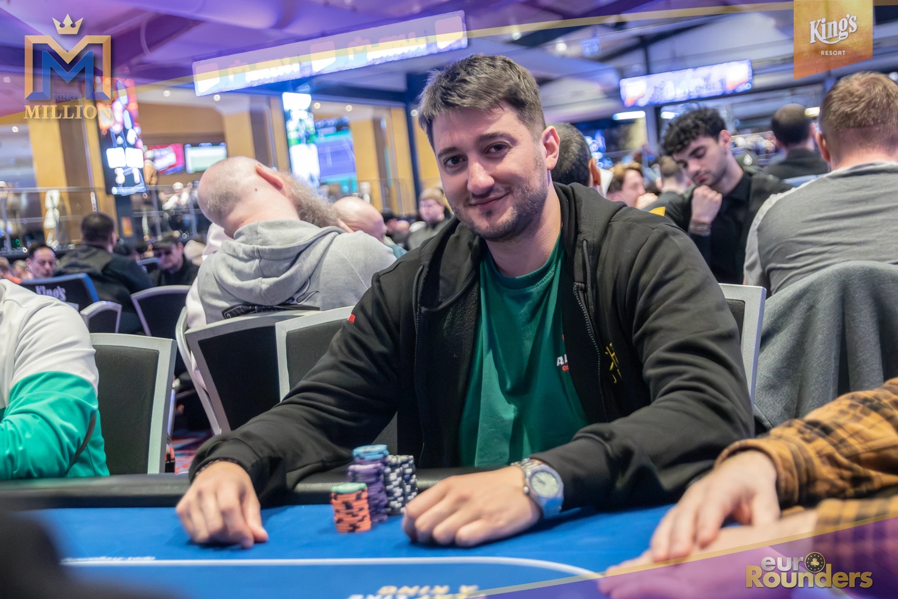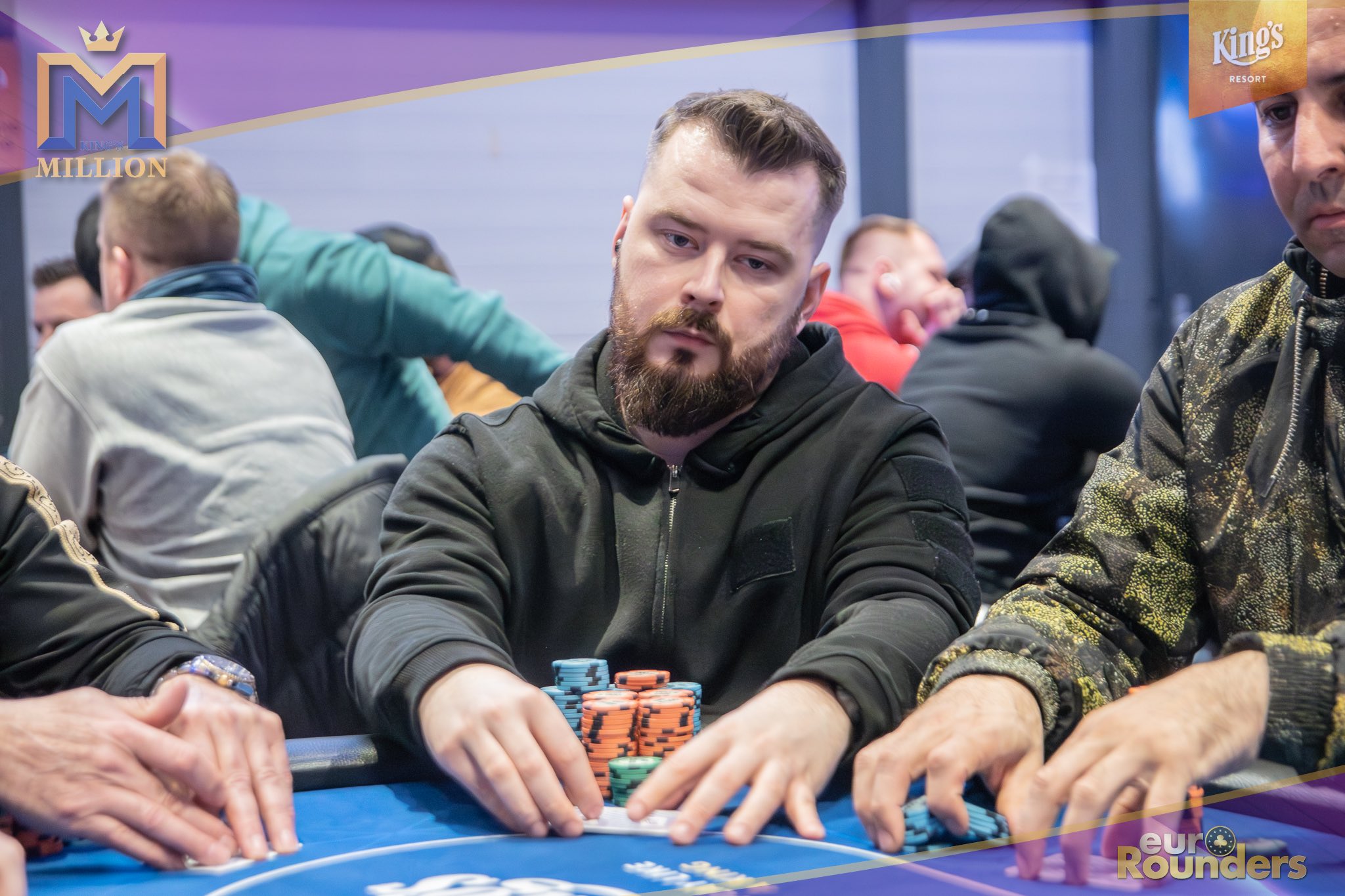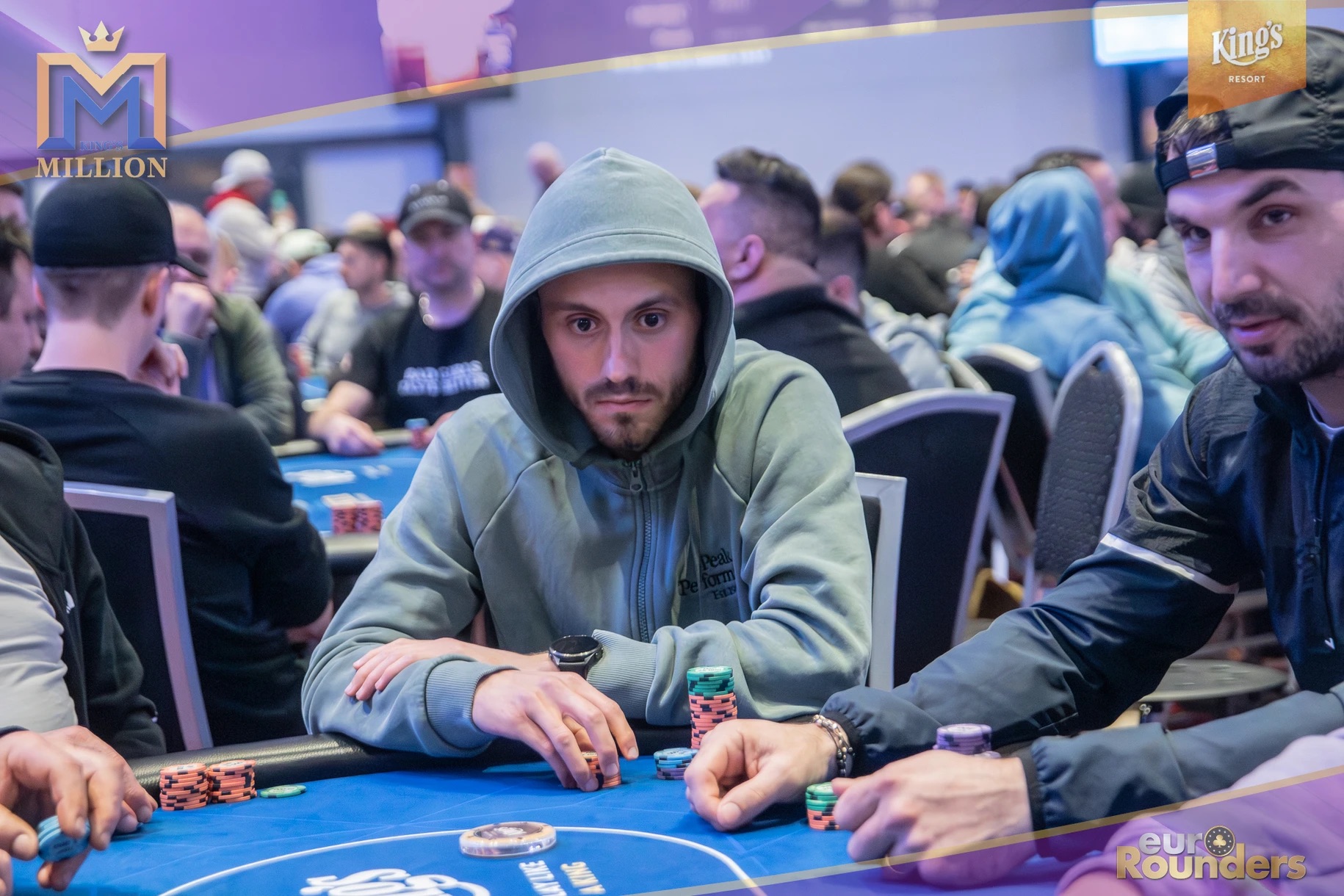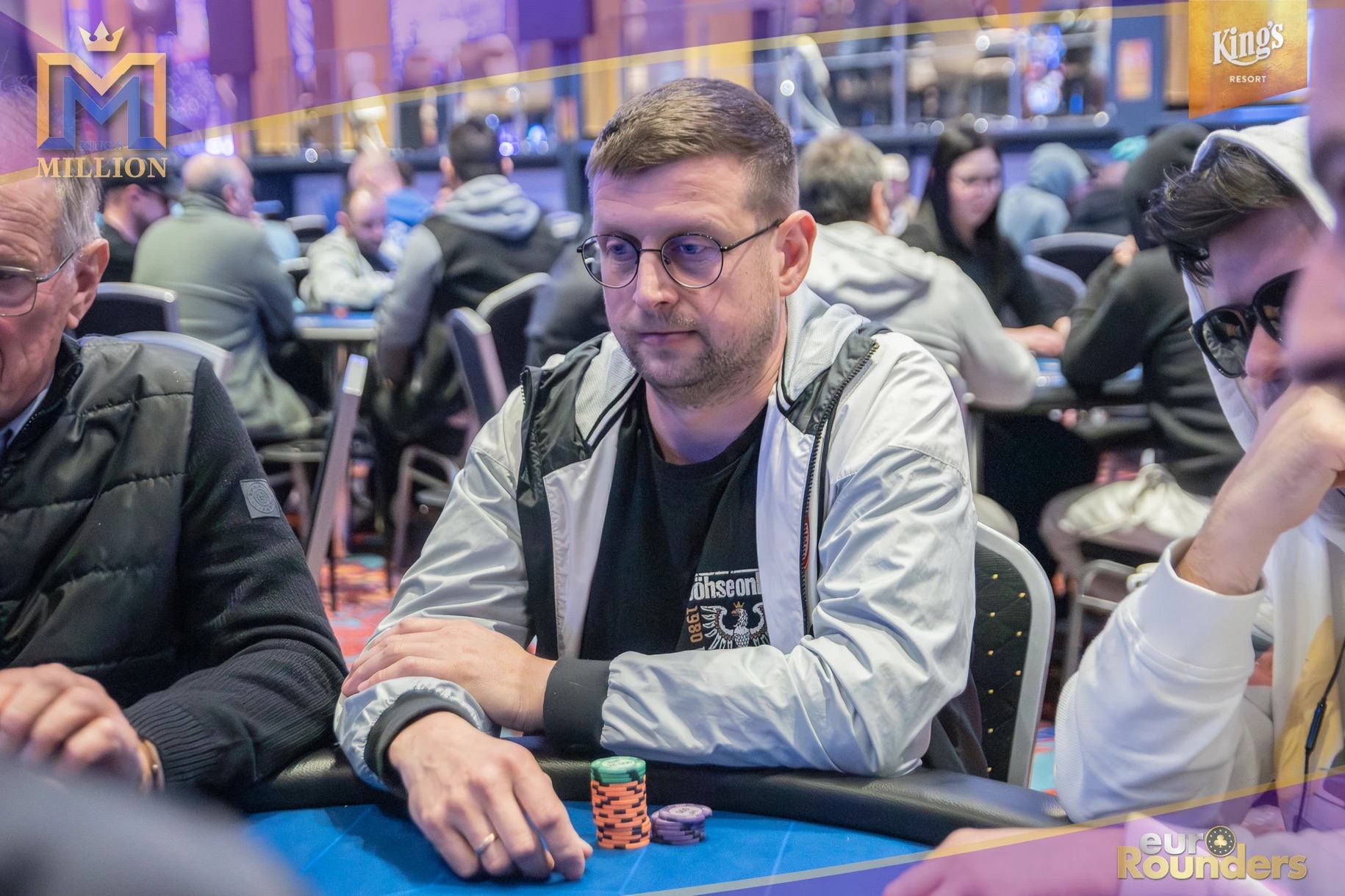 Die legendäre King’s Million mit der namensgebenden €1.000.000 Preispoolgarantie umfasst 11 Starttage (9 Flights 1A bis 1I in Rozvadov + 1 Flight in Prag + 1 Flip and Go) und insgesamt 4 Spieltage. Für das Buy-In von €250 erhält man 40.000 Starting Chips und 40 Minuten Spielzeit pro Blindlevel, 30 in den Speed Flights. An den Tagen 1A und 1B hatte man sogar die Möglichkeit 60-minütige Level zu spielen. Dort wurden die bis zum Level 8 in Part 1 getrennten Starttage dann in Part 2 zusammengelegt. Für die Top 5 von Tag 1AB Part 2 gab es fünf Chipleader-Bonus-Packages à €3.000. Ansonsten sind an jedem anderen regulären Spieltag €1.150 als Chipleader Bonus vorgesehen. 15% jedes Flights schaffen es mit €500 Min-Cash in-the-money. Danach wird ohne weiteres Hand-for-Hand-Play jeweils runter bis auf 10% der Flightteilnehmer*innen gespielt, die ihre Chips dann in Tag 2 mitnehmen. An Tag 2, 3 und am Finaltag sind die Blinds dann 60 Minuten lang. Für die Top-10 im Finale (DI, 14:00 Uhr) wird es dann noch jeweils ein €3.000 Package für die King’s Million European Poker Championship (KM EPC) geben.