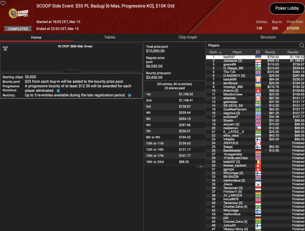Den größten Einzelcash mit etwa $2.870 holte das „cyberkanguru“ mit dem Titel im $109 HORSE. Das war sicher eine Genugtuung nur wenige Stunden nachdem es im $109 Razz SCOOP Event (#62-M) den Titel als Runner-Up denkbar knapp verpasst hatte. Einen weiteren Titel am Freitag gab es durch „ppiillee“ und dazu $525 Siegprämie. Und das in einem Event, in dem PokerStars alle Spielarten und Pokervariablen im Namen verarbeitet hat, dem $4,40 No Limit Omaha High/Low Heads-Up Turbo Progressive Total Knockout ZOOM Tournament.
