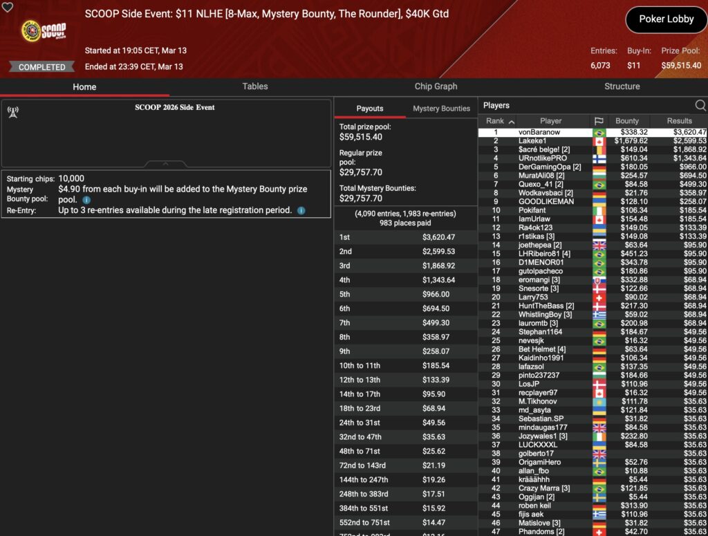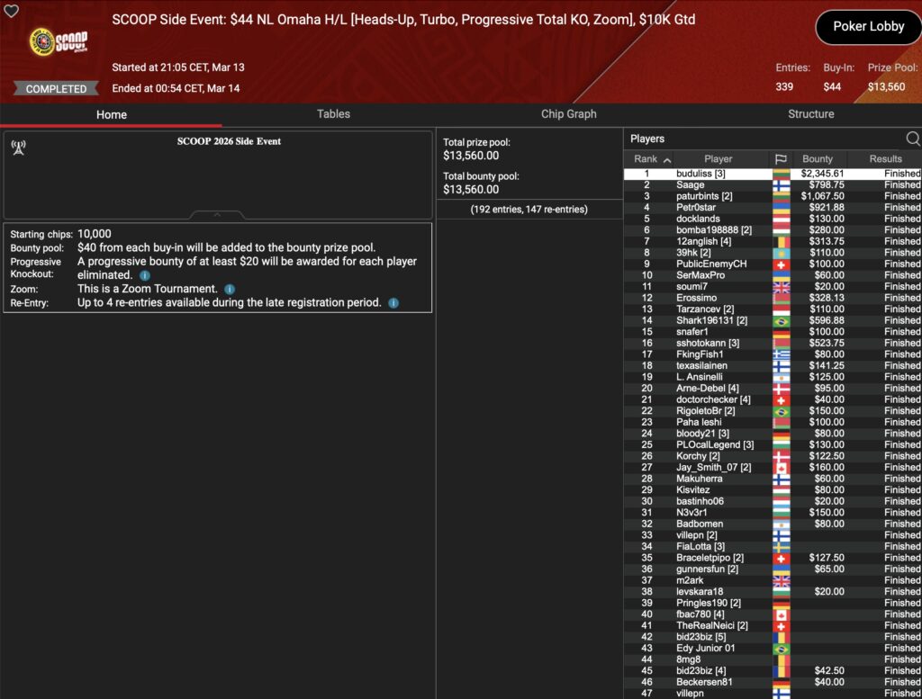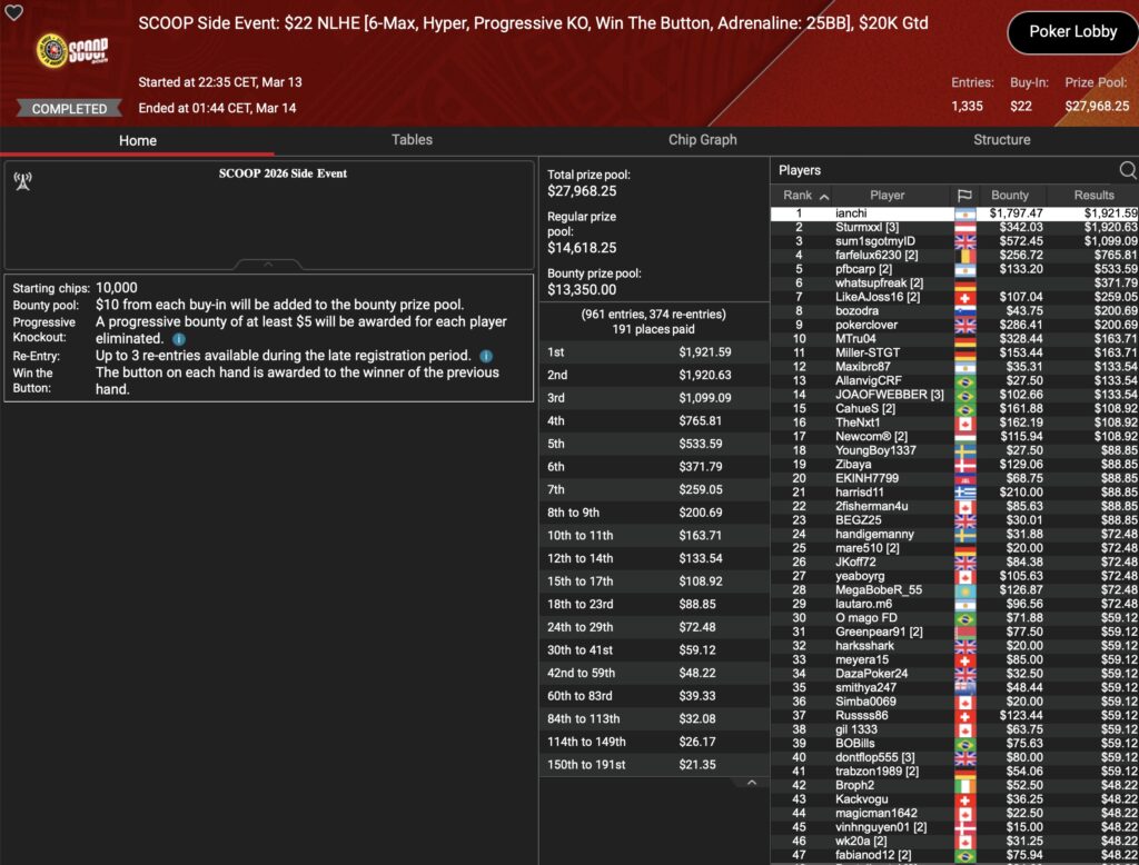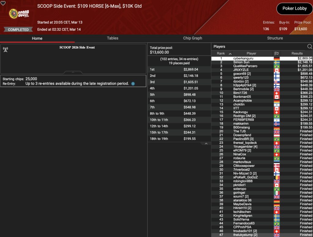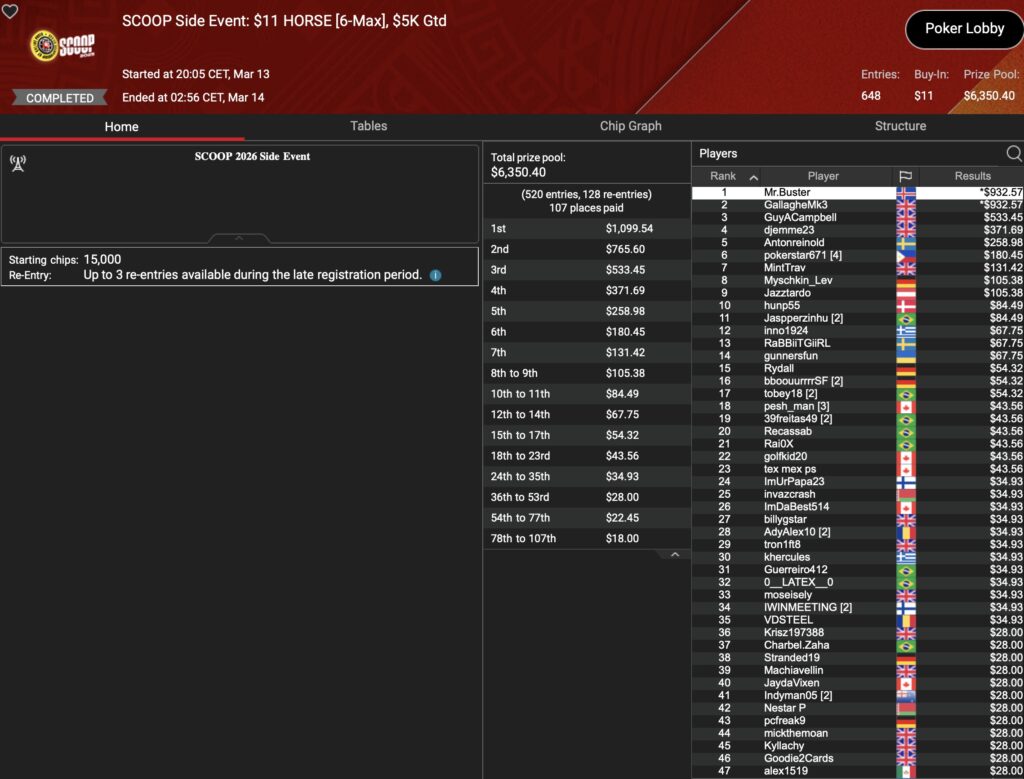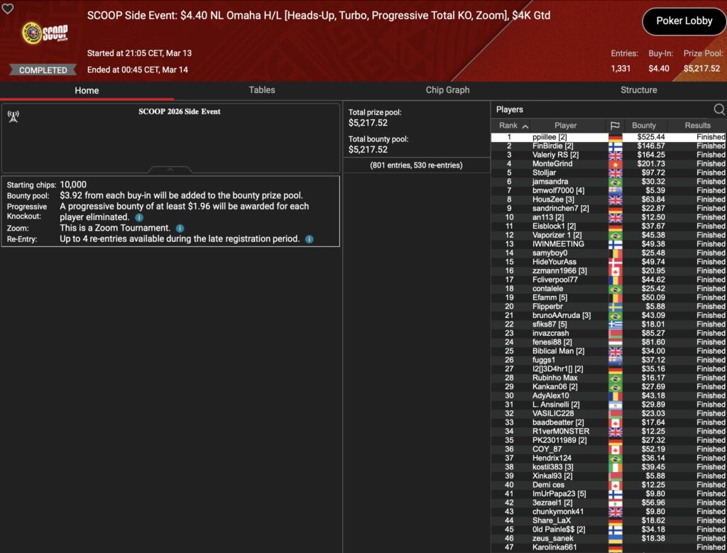 Nach dem Bergfest der SCOOP, der Halbzeit der 136 Turnier, am Donnerstag, gab es am Freitag traditionell wieder einen Ruhetag bei der Spring Championship of Online Poker auf PokerStars. Für diejenigen, die die Finger an der Mouse nicht bis zum nächsten Spieltag ruhig halten konnten, gab es die SCOOP Side Events auf dem Trunierplan. Hier konnten sich bislang wenig bekanntere Spieler in Szene setzen. Von den 11 Side Events wurden zwei von deutschen MTT-Spielern gewonnen: „ppiillee“ schluckte 1.330 Konkurrenten beim Sieg im $4,40 NL08 HU ZOOM und das „cyberkanguru“ ritt im $$109 HORSE zum Sieg!