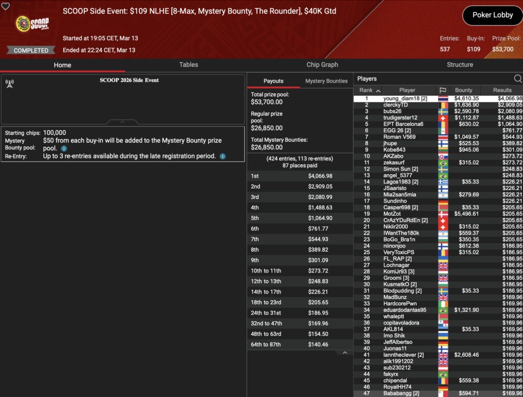 8 Final Tables konnte die D-A-CH-Fraktion am Ruhetag in den SCOOP Side Events erreichen, dazu 3 Top-6 Resutate im ZOOM. Zweimal saßen deutsche Spieler als letztes an den virtuellen Turniertischen. Dafür gab es zwar keine Trophys, doch in den Side Events mit moderaten Buy-Ins dafür ordentliche Payouts.