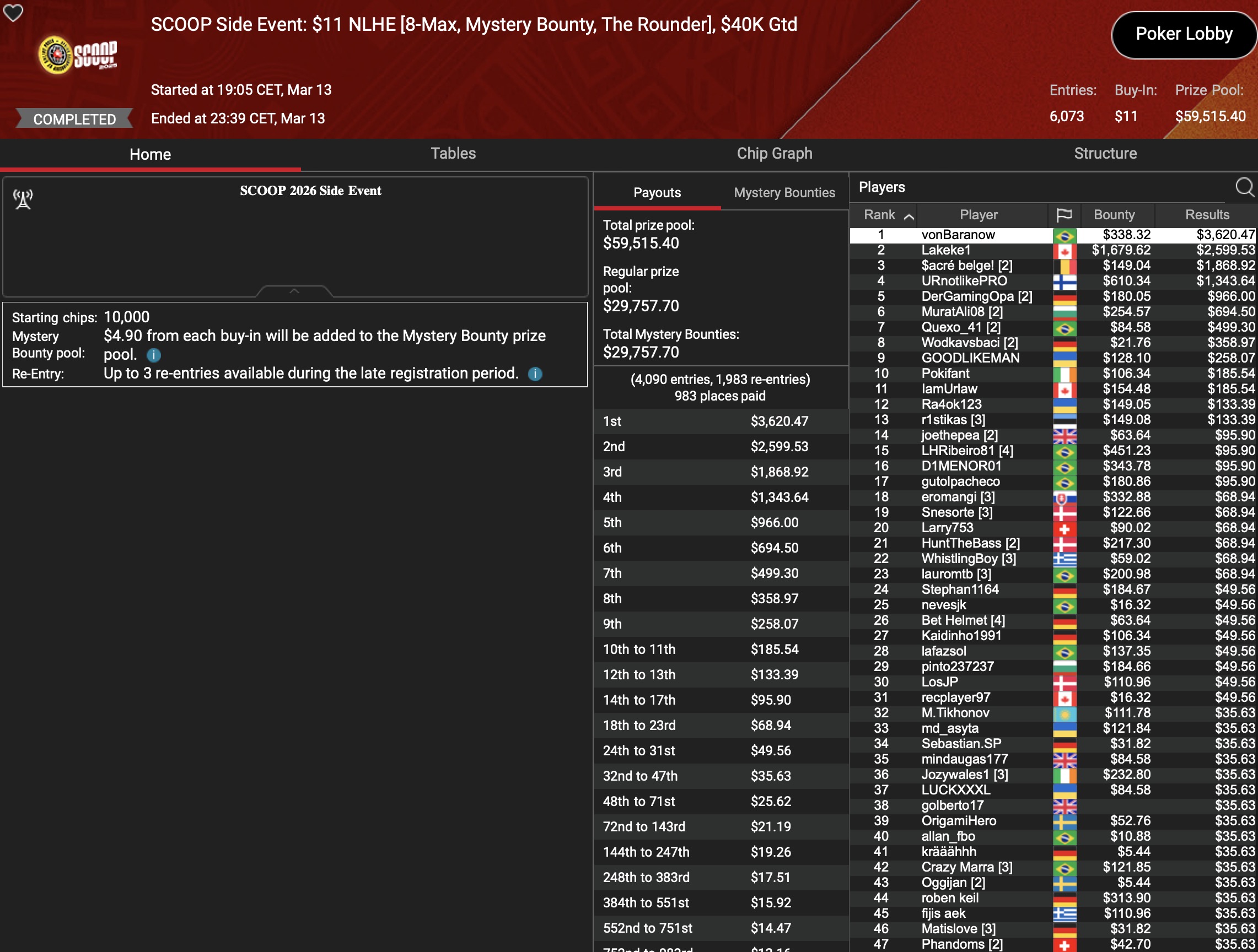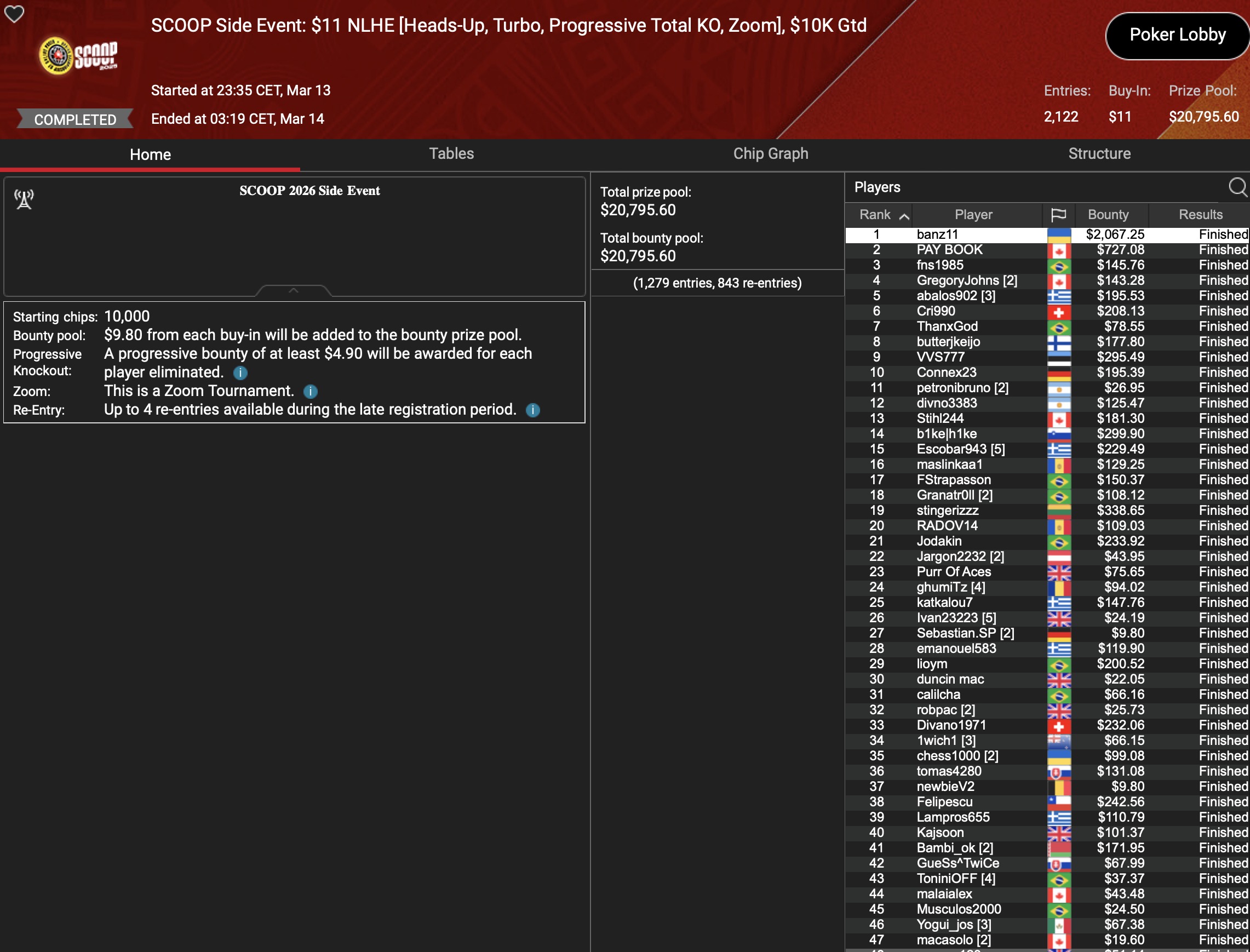 Nach dem Bergfest der SCOOP, der Halbzeit der 136 Turnier, am Donnerstag, gab es am Freitag traditionell wieder einen Ruhetag bei der Spring Championship of Online Poker auf PokerStars. Für diejenigen, die die Finger an der Mouse nicht bis zum nächsten Spieltag ruhig halten konnten, gab es die SCOOP Side Events auf dem Trunierplan. Hier konnten sich bislang wenig bekanntere Spieler in Szene setzen. Von den 11 Side Events wurden zwei von deutschen MTT-Spielern gewonnen: „ppiillee“ schluckte 1.330 Konkurrenten beim Sieg im $4,40 NL08 HU ZOOM und das „cyberkanguru“ ritt im $$109 HORSE zum Sieg!