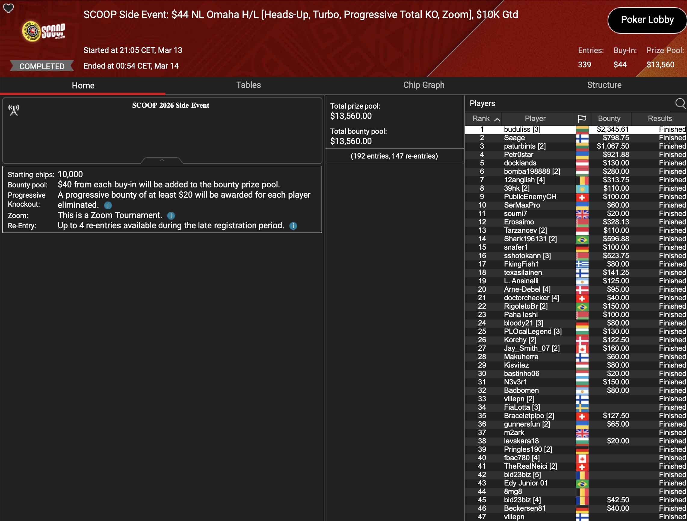 Den größten Einzelcash mit etwa $2.870 holte das „cyberkanguru“ mit dem Titel im $109 HORSE. Das war sicher eine Genugtuung nur wenige Stunden nachdem es im $109 Razz SCOOP Event (#62-M) den Titel als Runner-Up denkbar knapp verpasst hatte. Einen weiteren Titel am Freitag gab es durch „ppiillee“ und dazu $525 Siegprämie. Und das in einem Event, in dem PokerStars alle Spielarten und Pokervariablen im Namen verarbeitet hat, dem $4,40 No Limit Omaha High/Low Heads-Up Turbo Progressive Total Knockout ZOOM Tournament.