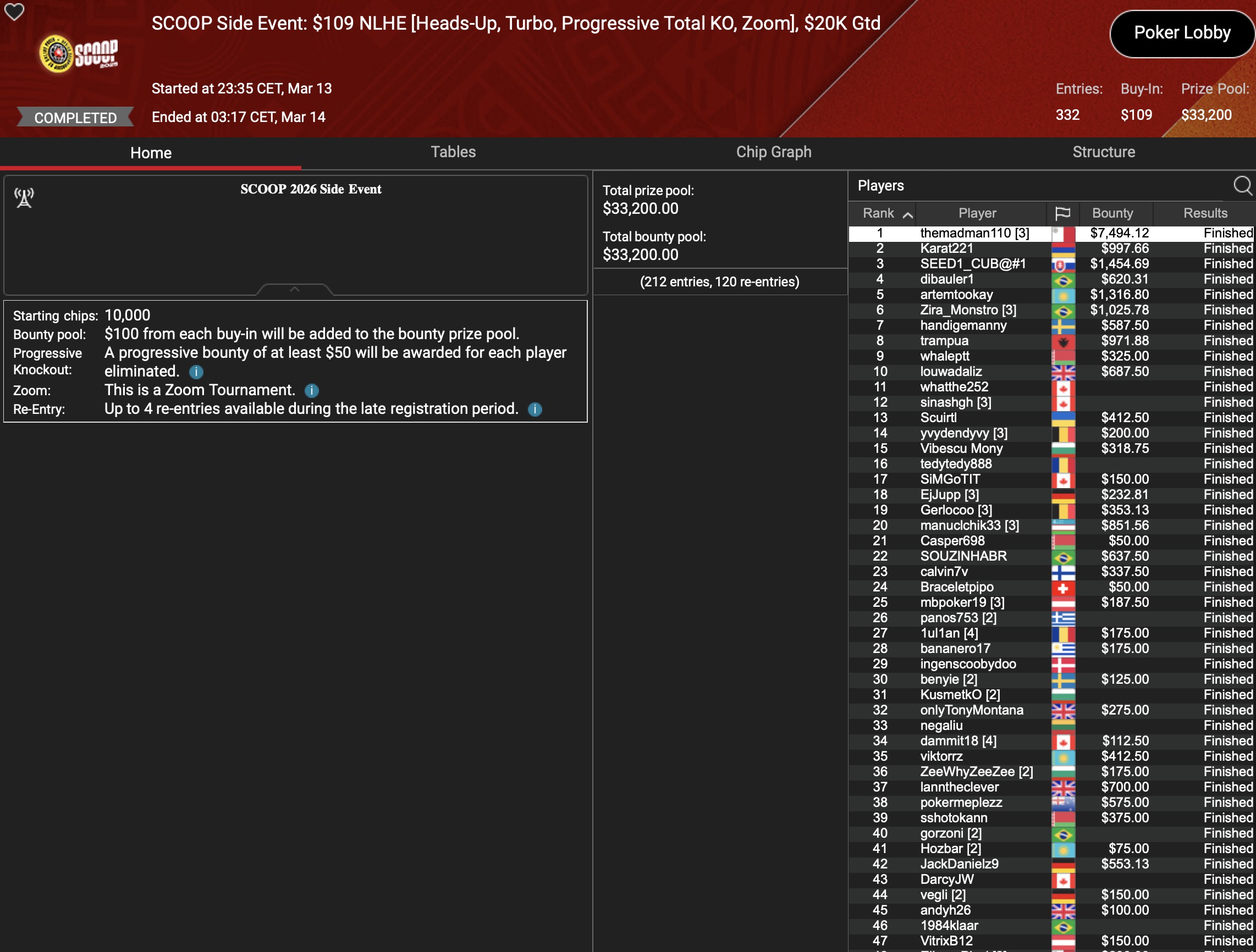 8 Final Tables konnte die D-A-CH-Fraktion am Ruhetag in den SCOOP Side Events erreichen, dazu 3 Top-6 Resutate im ZOOM. Zweimal saßen deutsche Spieler als letztes an den virtuellen Turniertischen. Dafür gab es zwar keine Trophys, doch in den Side Events mit moderaten Buy-Ins dafür ordentliche Payouts.