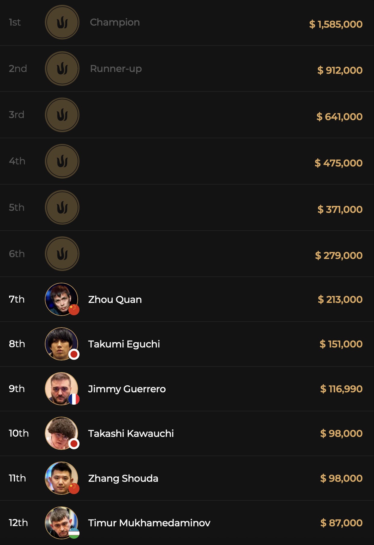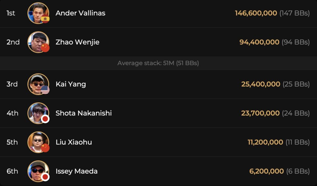 Während die anderen großen Namen auf dem Weg zum 9-handed Finaltisch auf der Strecke blieben, schaffte SHRS-Champion Zhou Quan den Sprung daran. Die europäischen Hoffnungen auf einen T1 M.E. Titel ruhten auf Jimmy Guerrero aus Frankreich und Ander Vallinas aus Spanien. Die französischen Hoffnungen sollten sich jedoch daran schnell zerschlagen als Guerrero auf Rang 9 mit $116.900 Payout daran ausschied. Ihm folgte der Japaner Takumi Eguchi als 8. mit erspielten $213.000 an die Rails. Für das letzte Bustout des Tages sollte einmal mehr Ander Vallinas sorgen. Der Spanier warf den SHRS Champion Zhou Quan mit $213.000 Payout auf Rang 7 aus dem T1 Main Event und konnte sich damit zum klaren Chipleader der letzten 6 aufschwingen. Während Vallinas bei Blinds von 500k/1m-1M 147 BBs hält ist nur noch der Chinese Zhao Wenjie mit 94 BBs in seiner Reichweite. Alle anderen 4 Finalisten liegen mit Chipstacks von 25 BBs bis runter zu 6 BBs deutlich unter dem Average von 51 BBs. Mit sicheren $279.000 werden sich sich heute im finalen Day 4 auf die Jagd nach dem prestigeträchtigen T1 Main Event Titel und der immensen $1.585.000 Siegprämie machen!