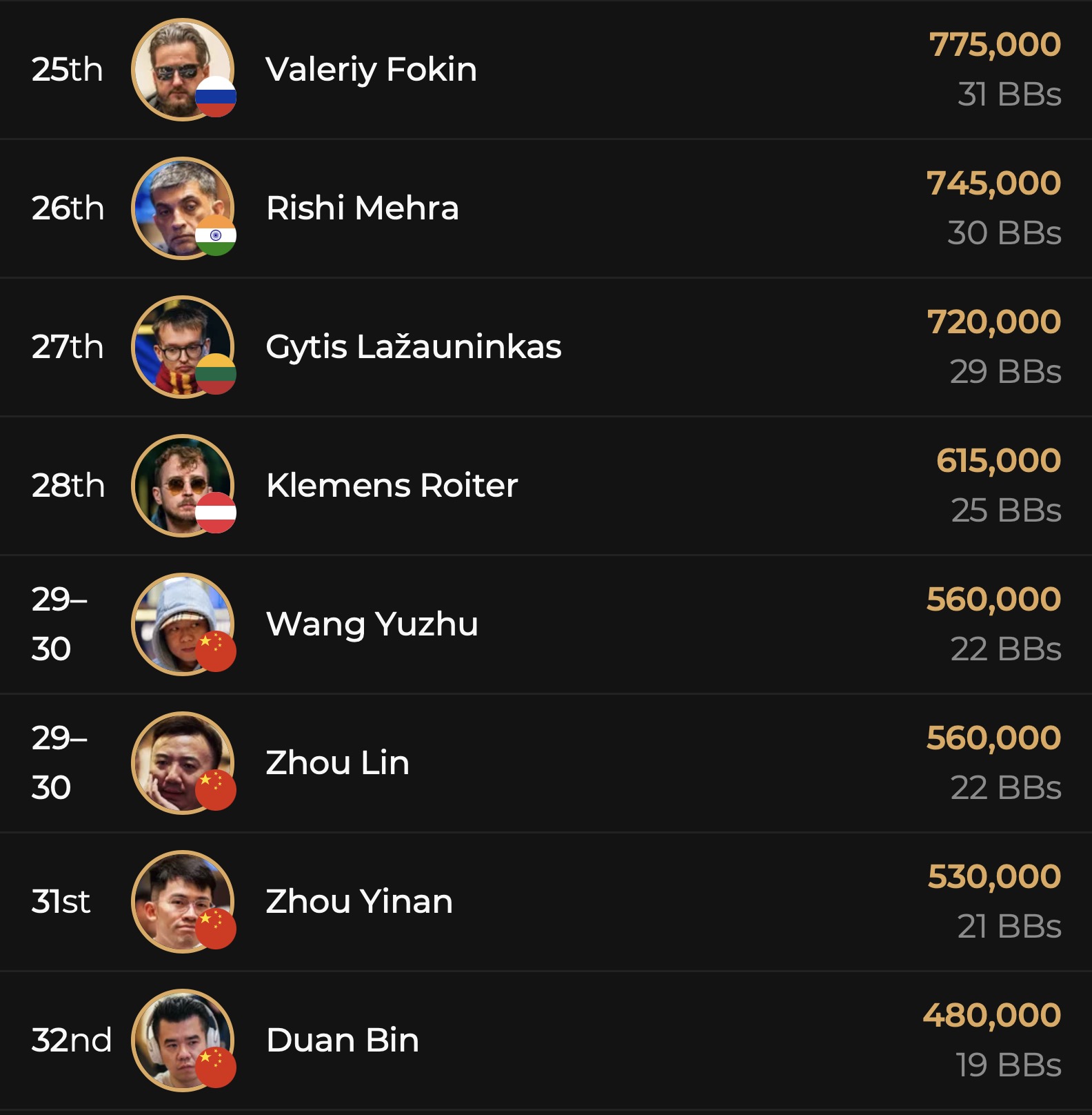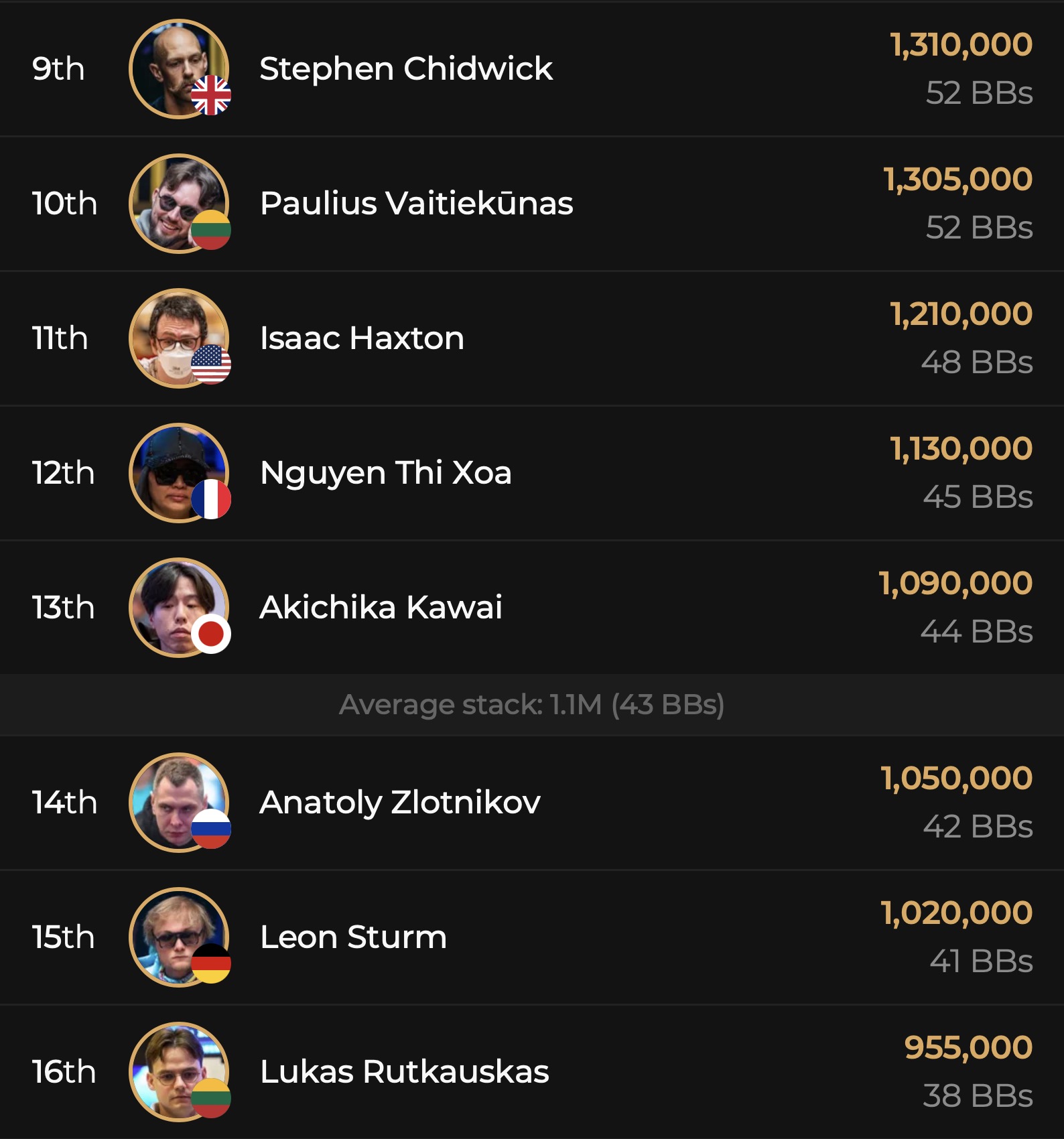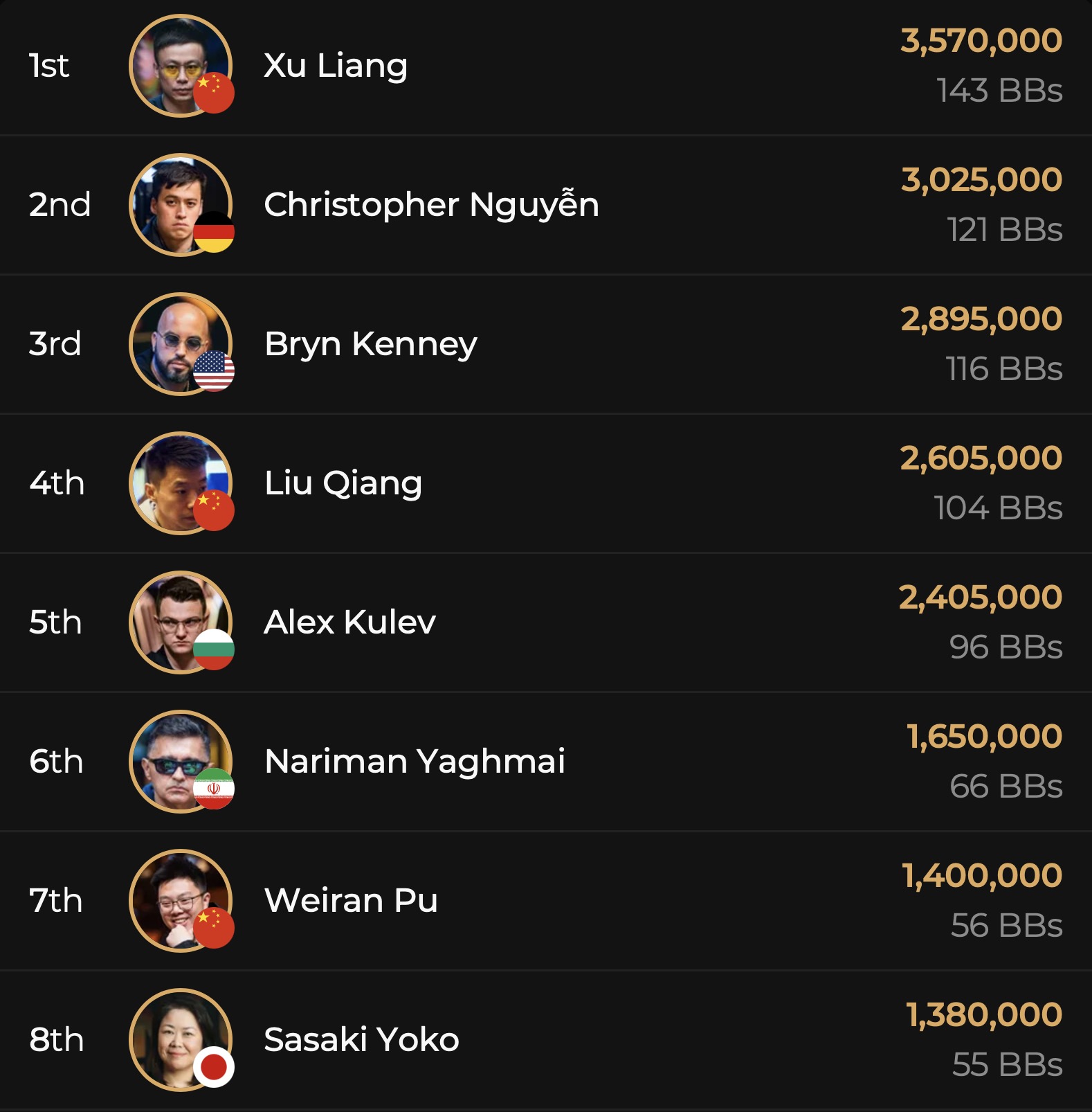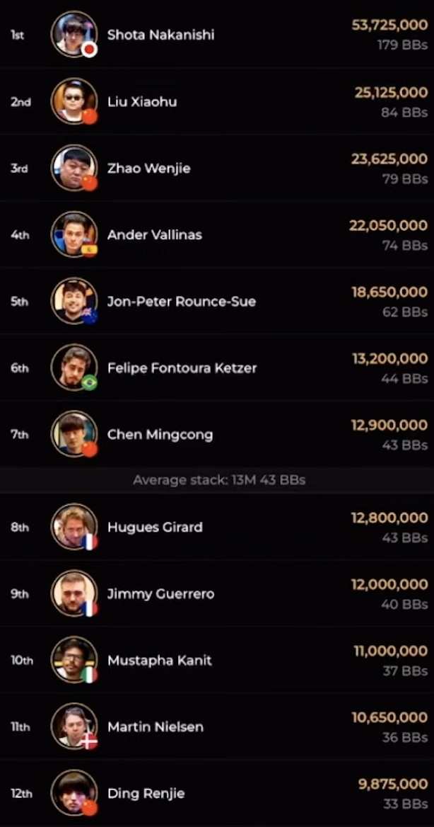 Während aus der D-A-CH_L Fraktion Spieler wie Manuel Fritz, Bernhard Binder, Erik Eisen, Hannes Jeschka, Samuel Mullur, Roland Rokita nach ihren Bustouts an Tag 1A es noch einmal in einem anderen Flight versuchen müssen, sprang ein deutschsprachiges Quartett direkt in Tag 2. Der tapfer als shortstack kämpfende Marin Sedlak (GER) wird mit 9 BBs in die Fortsetzung vom Highroller Event starten, Klemens Roiter (AUT) überzeugte einmal mehr mit eingetüteten 25 BBs, Leon Sturm (GER) liegt mit 41 BBs knapp unter dem Average von 43 BBs und Christoph Nguyen (GER) konnte mit beeindruckenden 121 BBs den Tag 1A als 2nd Chipleader beenden. Damit ließ er Spieler wie Bryn Kenney (USA, 116 BBs), Alex Kulev (BUL, 96 BBs), Stephen Chidwick (GBR, 52 BBs), Isaac Haxton (USA, 48 BBs), Emilien Pitavy (FRA, 33 BBs), Johannes Straver (NED, 32 BBs) oder Ren Li (CHN, 16 BBs) hinter sich. Vor ihm im Chipcount lag nur noch Xu Liang aus China, der 143 BBs an Tag 2 aus seiner Chiptüte holen wird.
