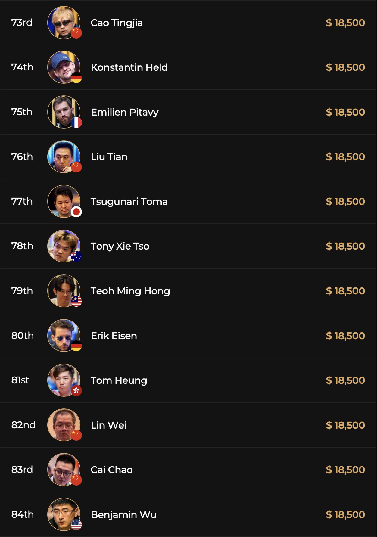 Das D-A-CH-L Oktett war auf seinem Weg zum Cashier in bester Gesellschaft, auch Spieler wie Ethan Yu, Ebony Kenney, Paul Phua oder Adrian Mateos beendeten das Triton ONE Main Event an Tag 2 in-the-money. Heruntergesielt wurde auf die letzten 3 Tische, also auf 24 Spieler.