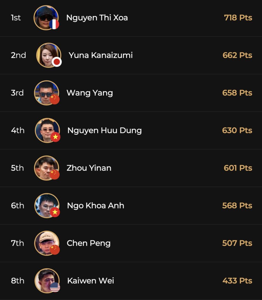 Im Rennen um den Player ONE Titel im Player of the Series Leaderboard liegen mit Nguyen Thi Xoa und Yuna Kanaizumi an der Spitze des Leaderboards. Unserer Recherche zufolge hat noch nie eine Frau einen PoS-Titel bei der Triton Series gewonnen, womit eine der beiden Geschichte schreiben könnte. Zwar könnte der Spanier Ander Vallinas, der momentan bei 402 PoS-Punkten steht mit einem Top-Resultat am T1 Main Event Final Table an die Spitze der Overall Wertung springen, doch Nguyen Thi Xoa hat nach dem erfolgreich überstandenen Tag 1A im High Roller Event ihrerseits ebenso die Möglichkeit ihr PoS-Punktekonto im High Roller Event weiter aufzustocken.