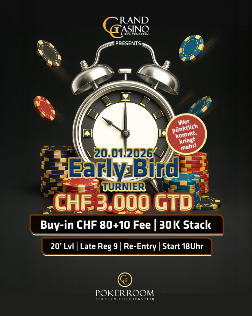 Um 18:00 Uhr begann die Woche im GC Pokerroom Bendern vom Grand Casino Liechtenstein (GCLI) mit der Kopfgeldjagd im Bounty Tournament. 29 Entrys bedeuteten einen verhaltenen Start der Turnierwoche. Am Ende sollte sich ein Österreicher als bester Bounty Hunter herausstellen.