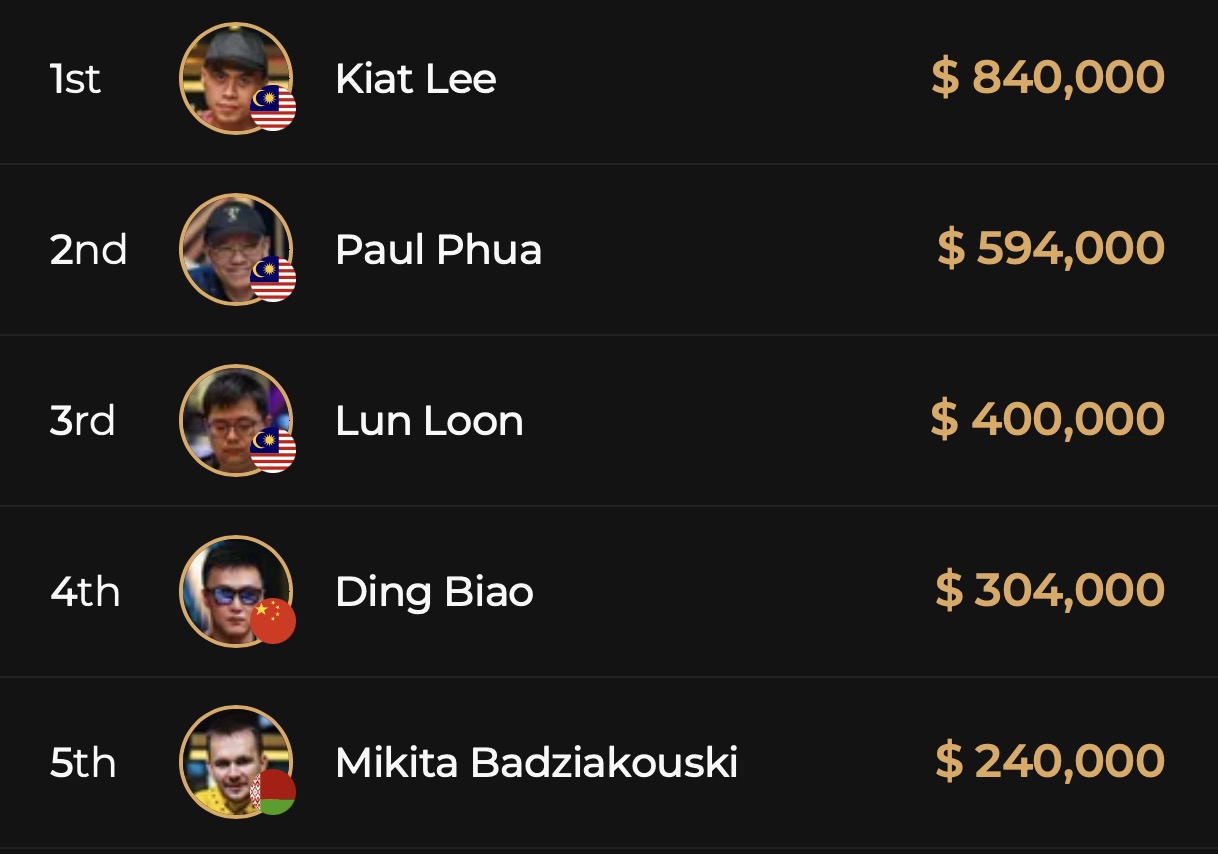 Bereits seinen dritten Triton SHRS Triumph konnte damit Kiat Lee einfahren, 366 Tage nach seinem ersten Short Deck Triton Erfolg am selben Ort. Lee, der erst durch Phua zum High Stakes Poker gekommen war, sagte im Siegerinterview, dass Paul Phua wie ein Vater für ihn sei. Trotzdem dürfte er sich über die dritte Trophy und die $840.000 Siegprämie gefreut haben!