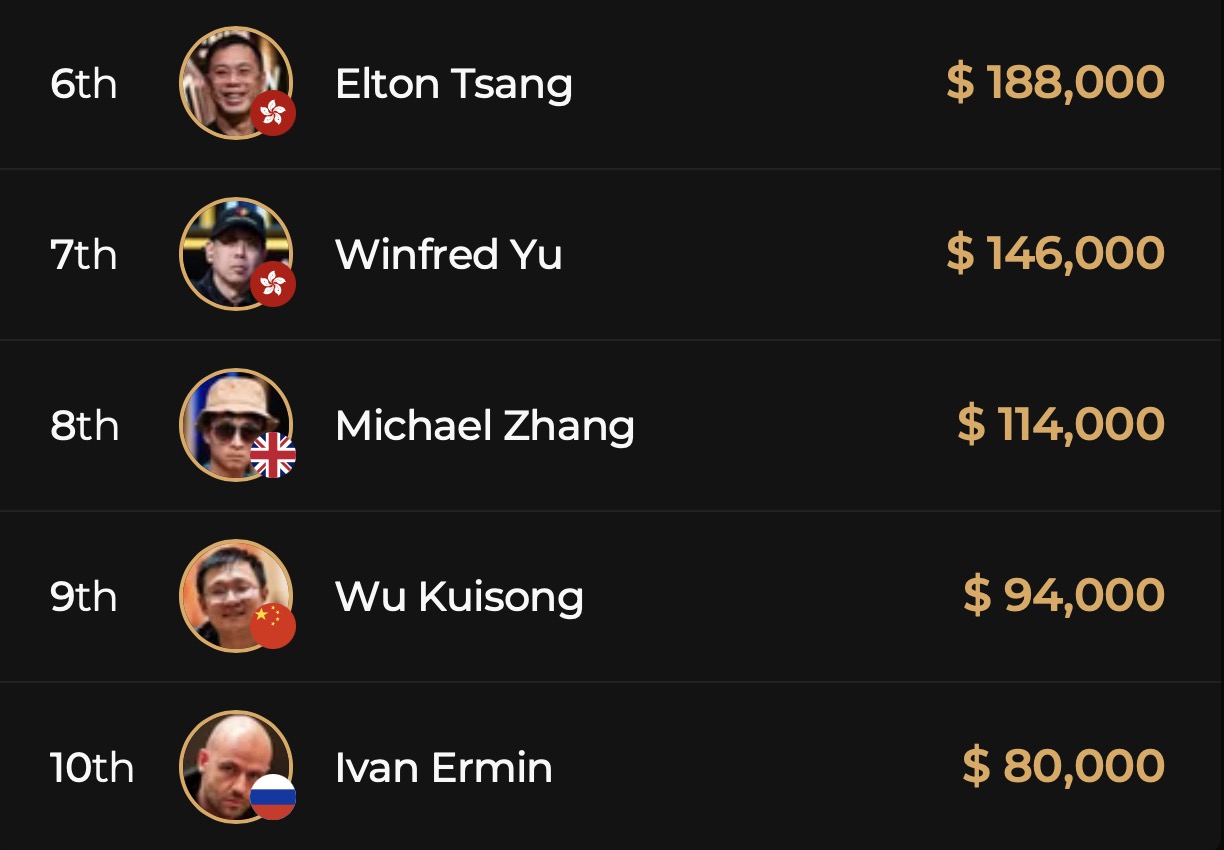 Von den 3 verbleibenden europäischen Spielern sollten sich mit dem Russen Ivan Ermin auf Rang 10 und dem Briten Michael Zhang auf Rang 8 zwei Drittel noch vor dem Erreichen des 7-handed Final Tables verabschieden, genauso wie Wu Kuisong aus China.