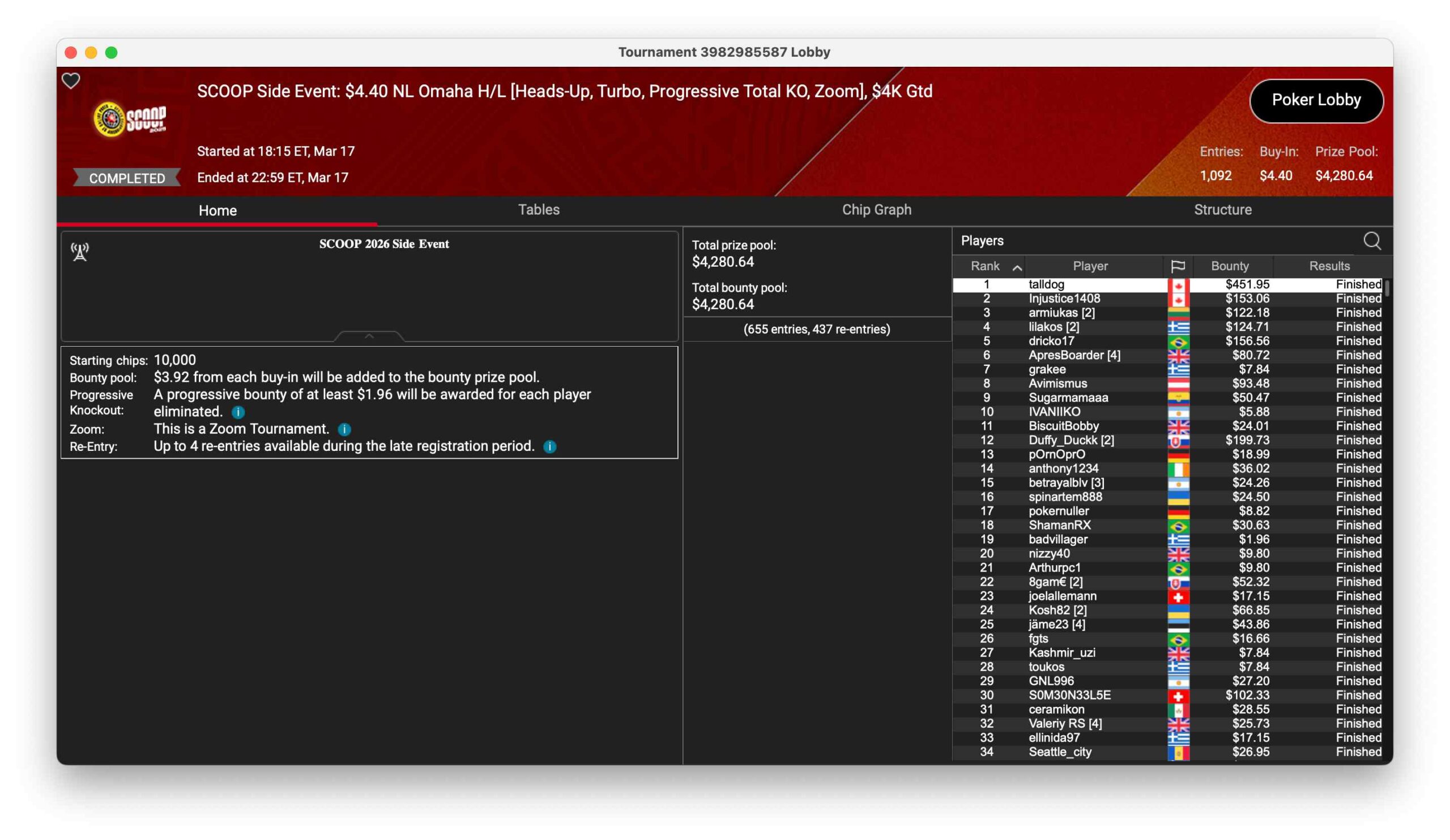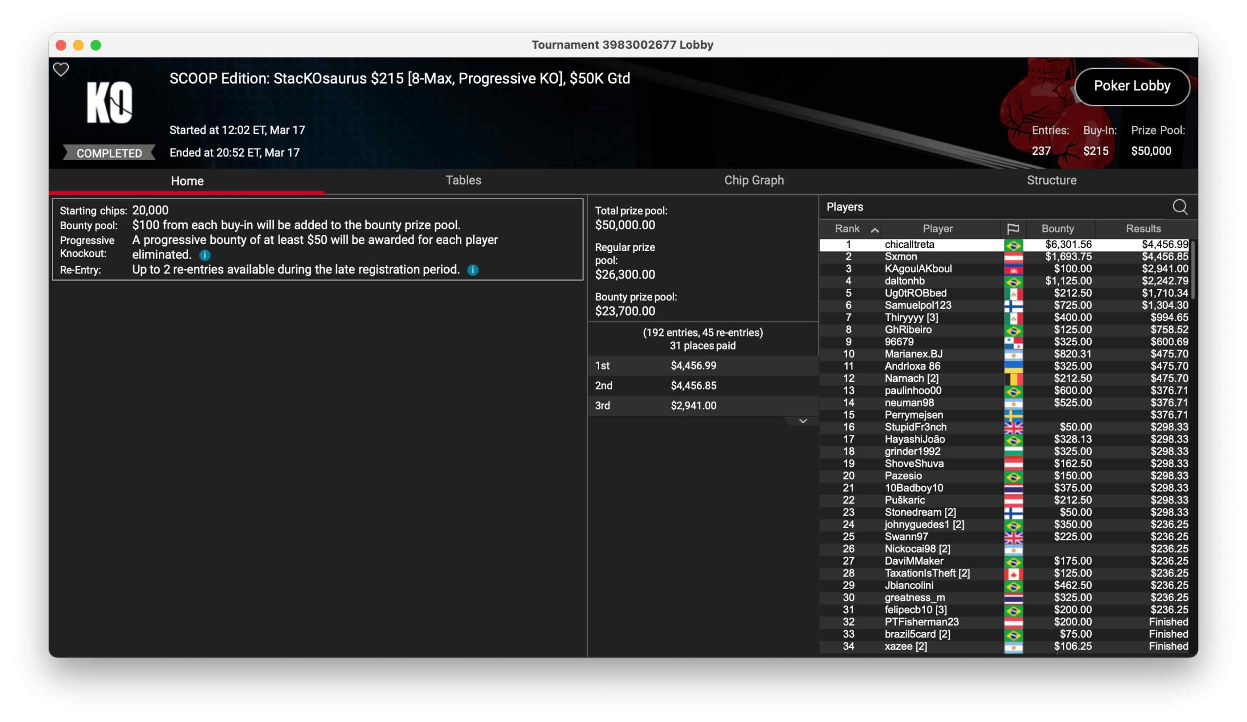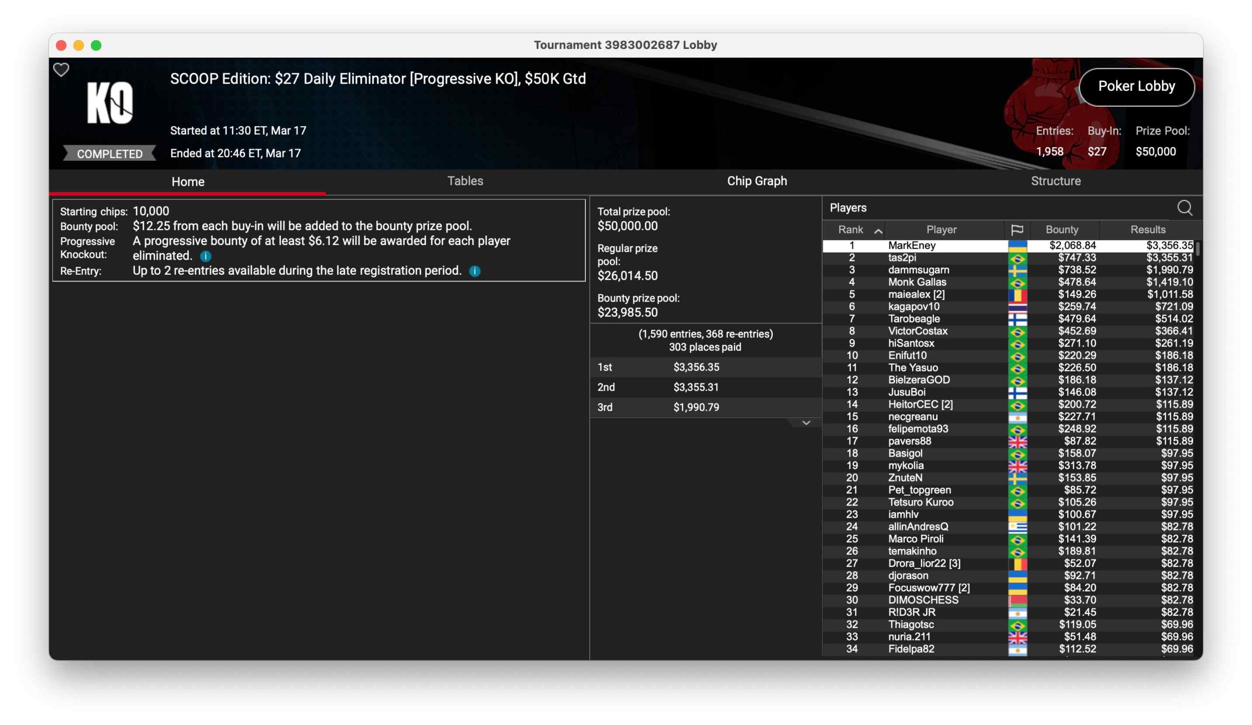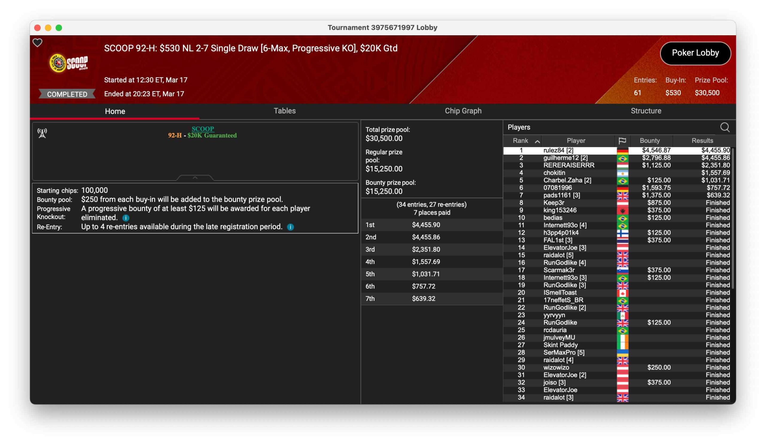Mason „Pye_Face21“ Pye gewann das $5,50 NL 2-7 Single Draw 6max PKO für $270 + $306. 901 Entries brachten hier $4.414 in den Preispool.