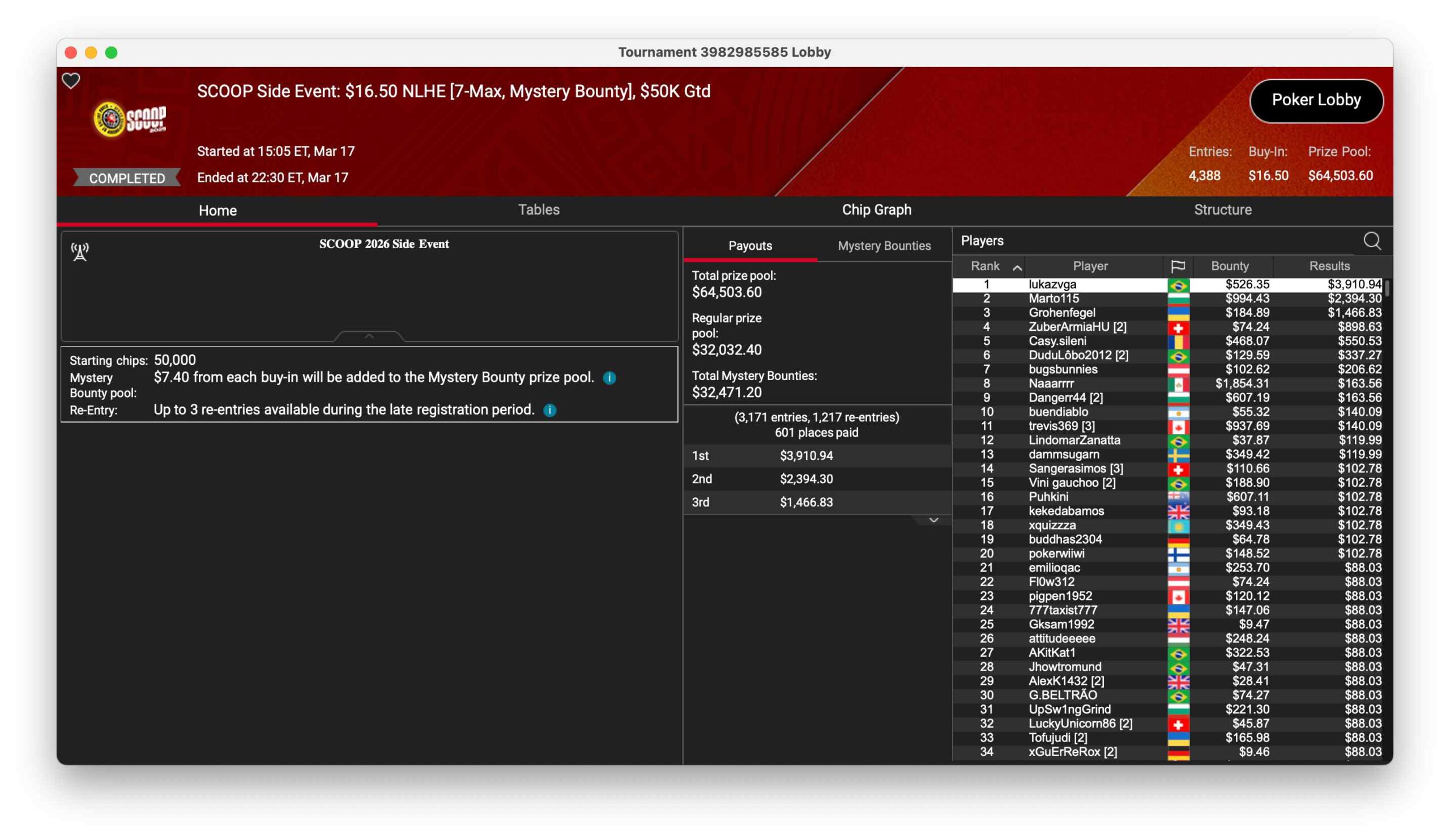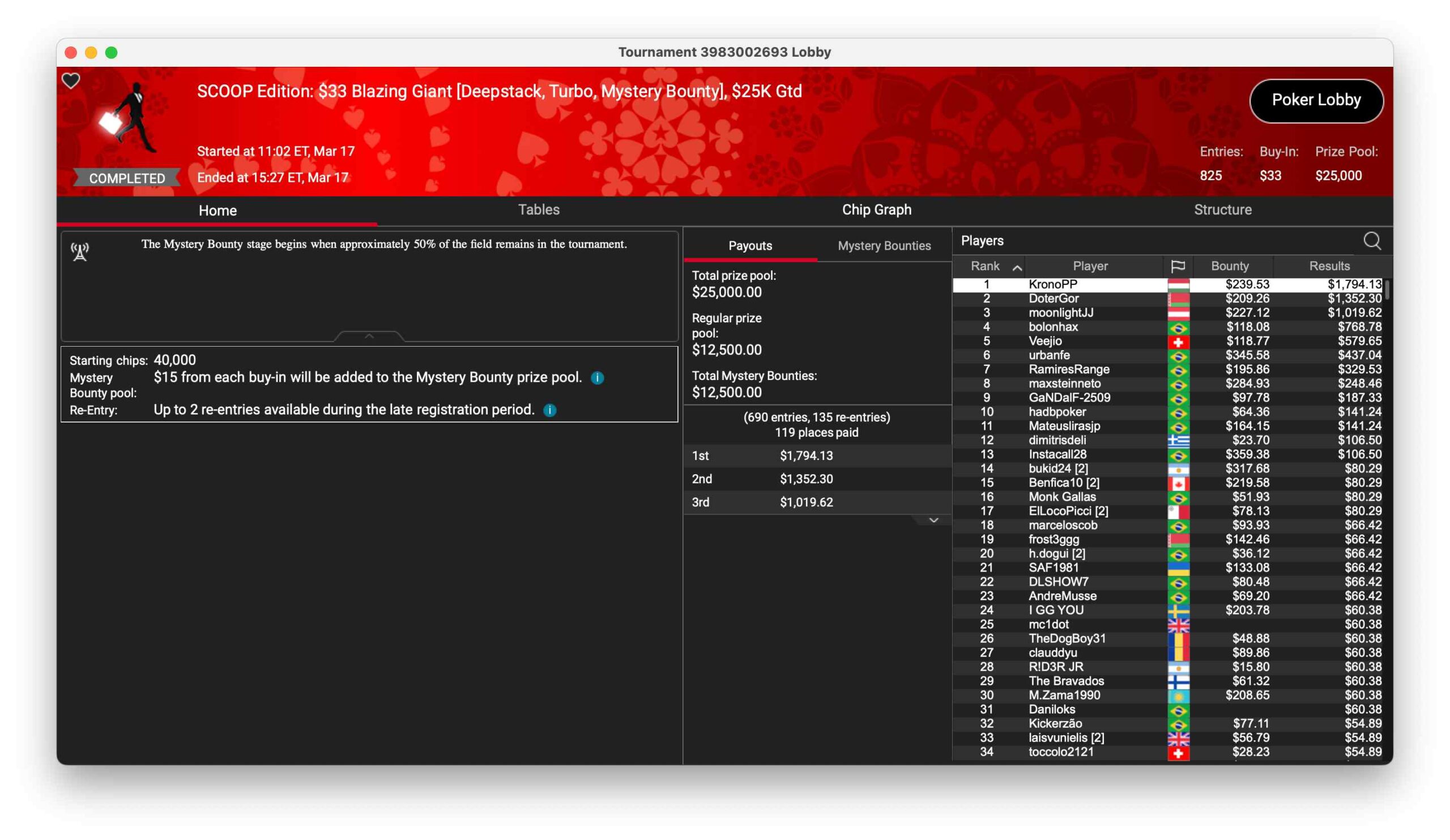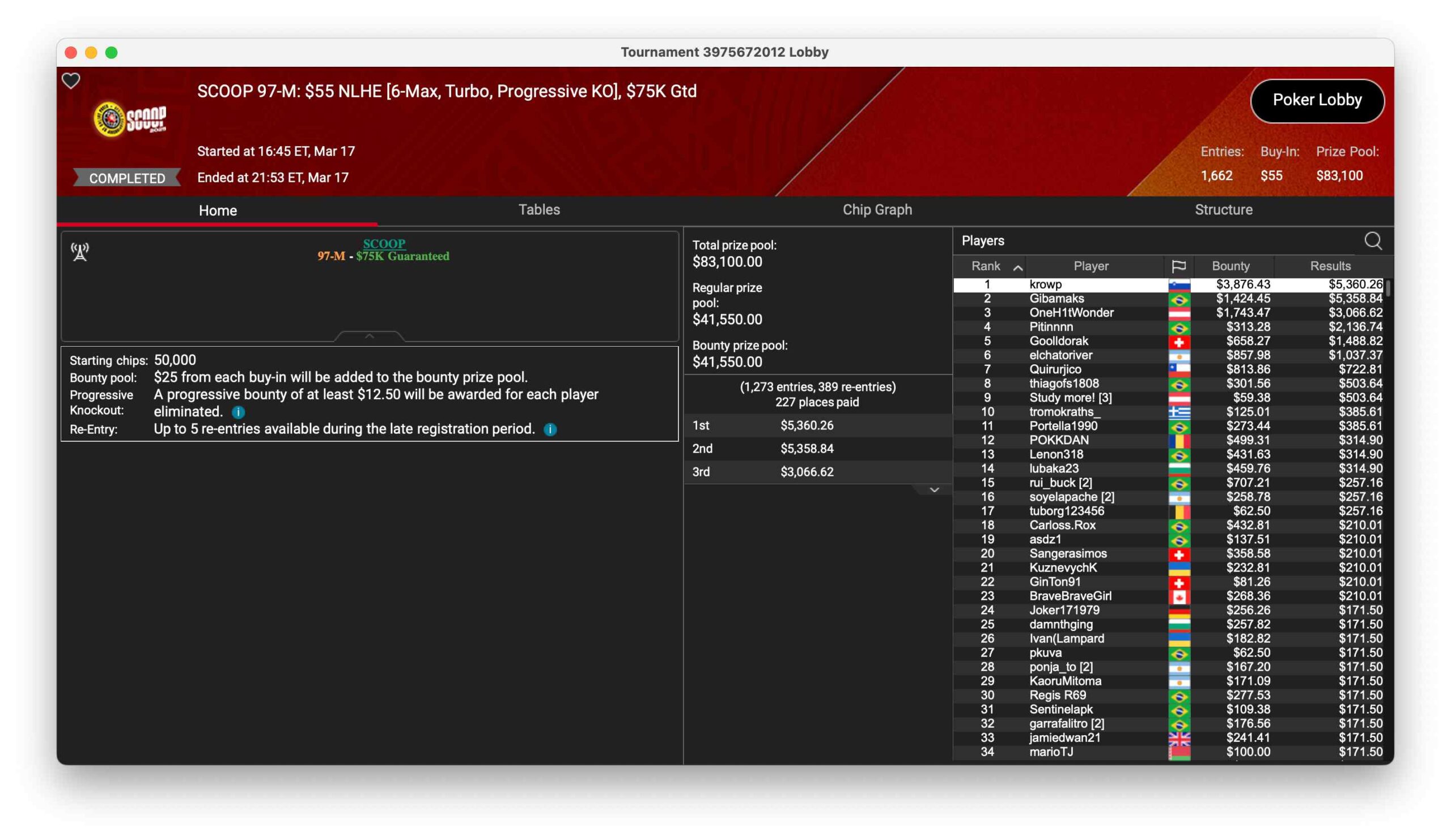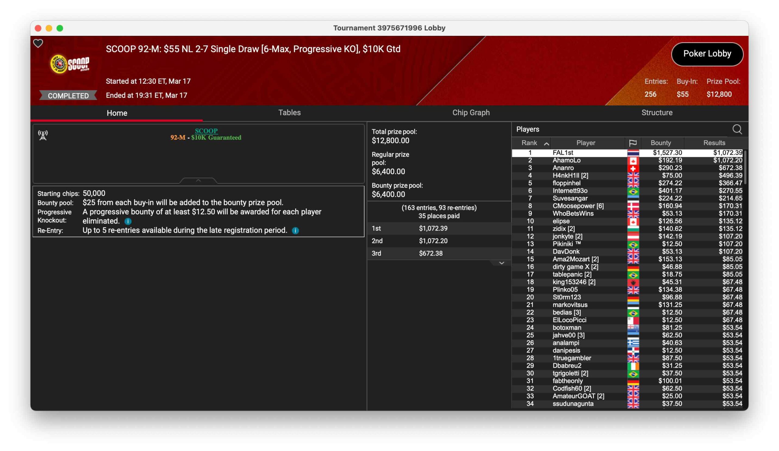 Mason „Pye_Face21“ Pye gewann das $5,50 NL 2-7 Single Draw 6max PKO für $270 + $306. 901 Entries brachten hier $4.414 in den Preispool.