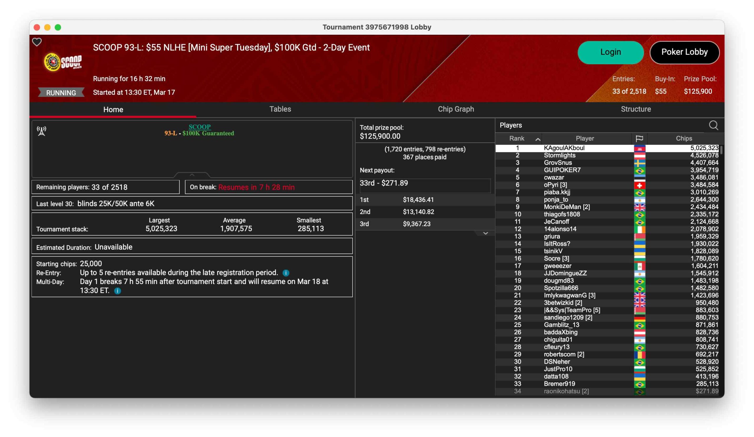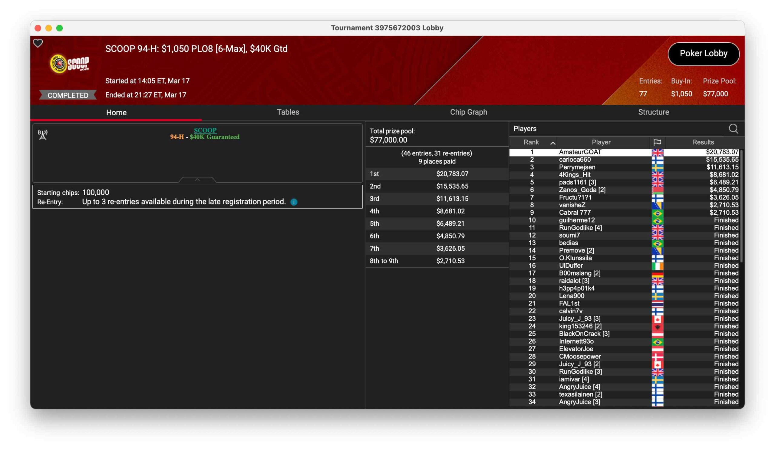 Ein Schweizer gewann das $22 PLO 6max, das 1.225 Entries anhäufte. $24.500 wurden im Pott neu verteilt. Der Sieg von „K04!1NW1“ gewann für $3.844.