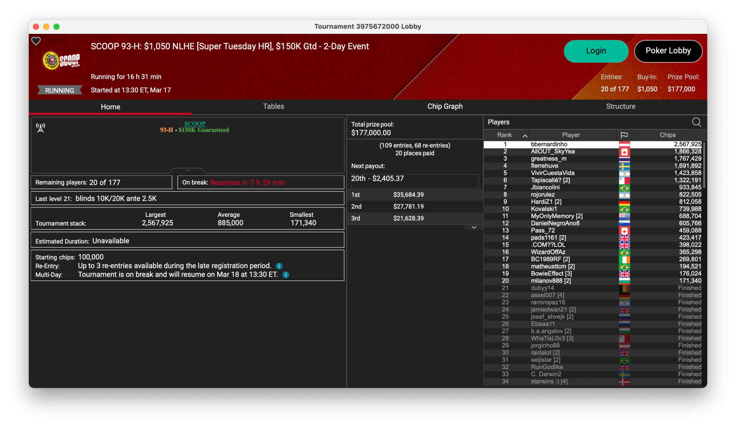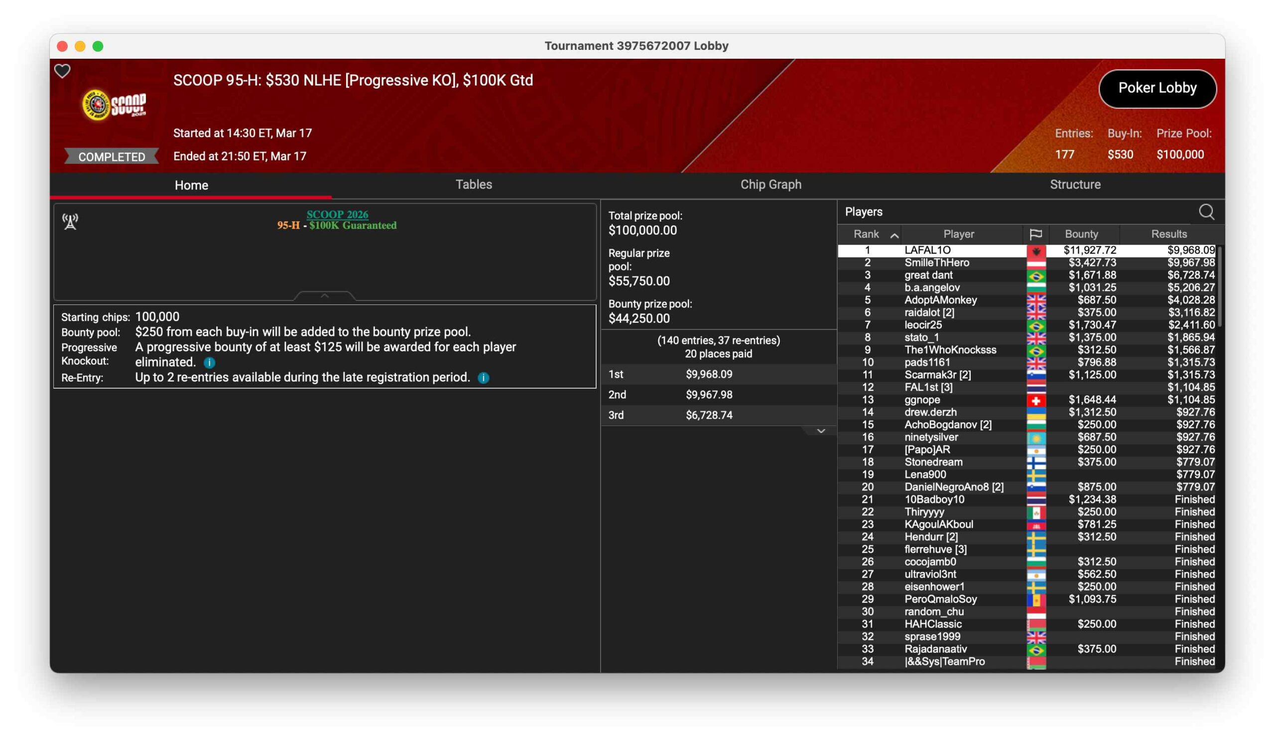 Im $530 NLHE PKO waren 177 Entries am Start. „LAFAL1O“ aus Albanien holte den Sieg für $11.927 + $9.968. Daniel „SmilleThHero“ Smiljkovic wurde Runner-Up für $3.427 + $9.967.