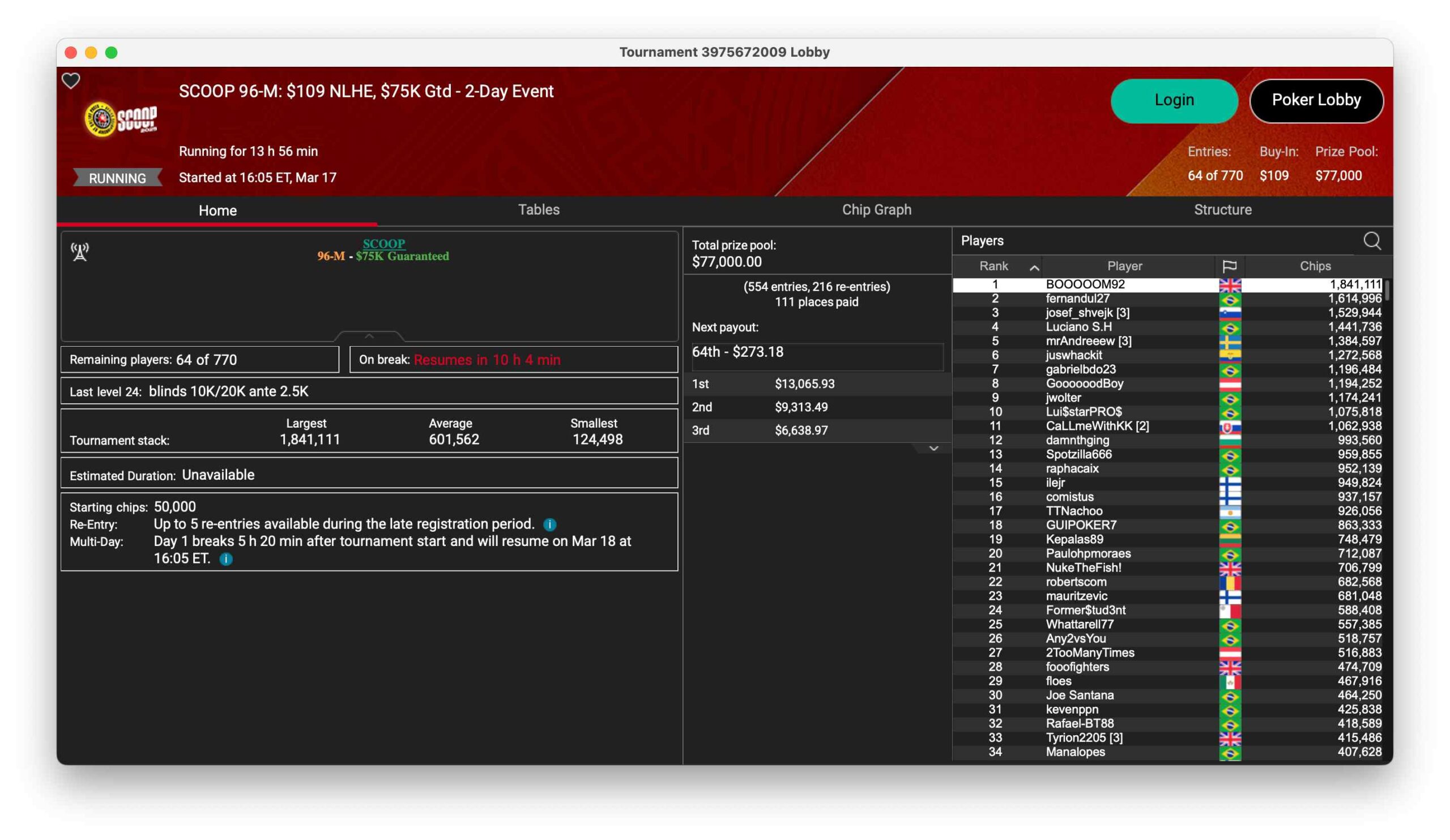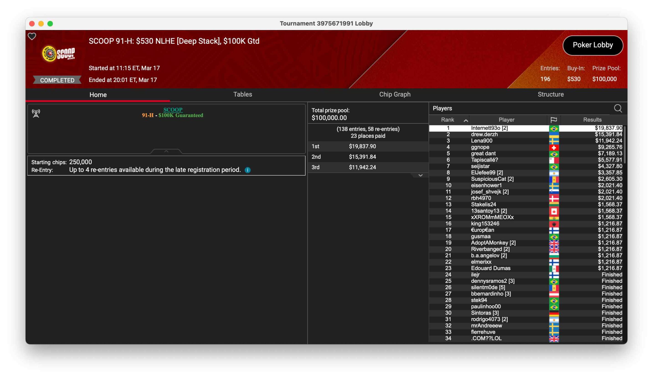 Renan „Internett93o“ Bruschi konnte das $530 NLHE Deep Stack gewinnen. 196 Entries wurden gezogen, aus der Garantie wurden $100.000 Preispool ausgespielt. Der Sieg brachte $19.837 ein. Online-Legende Niklas „Lena900“ Astedt wurde Dritter für $11.942.